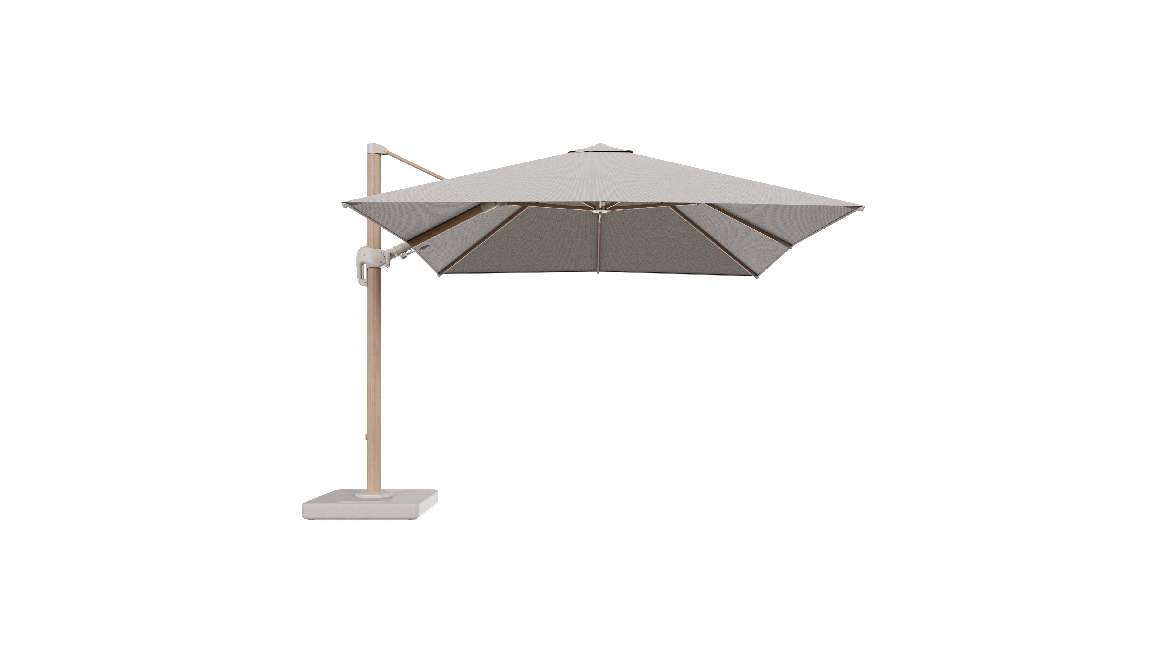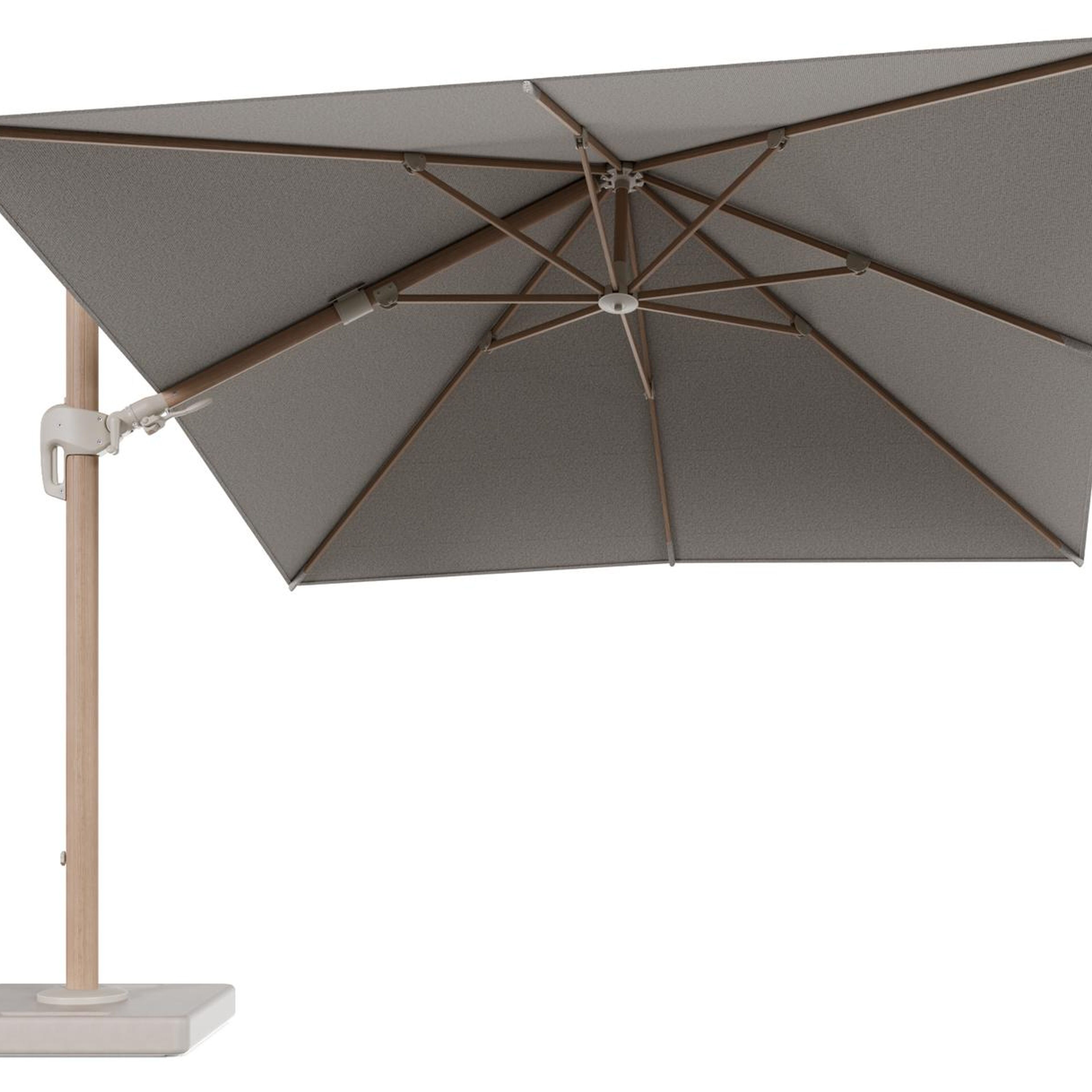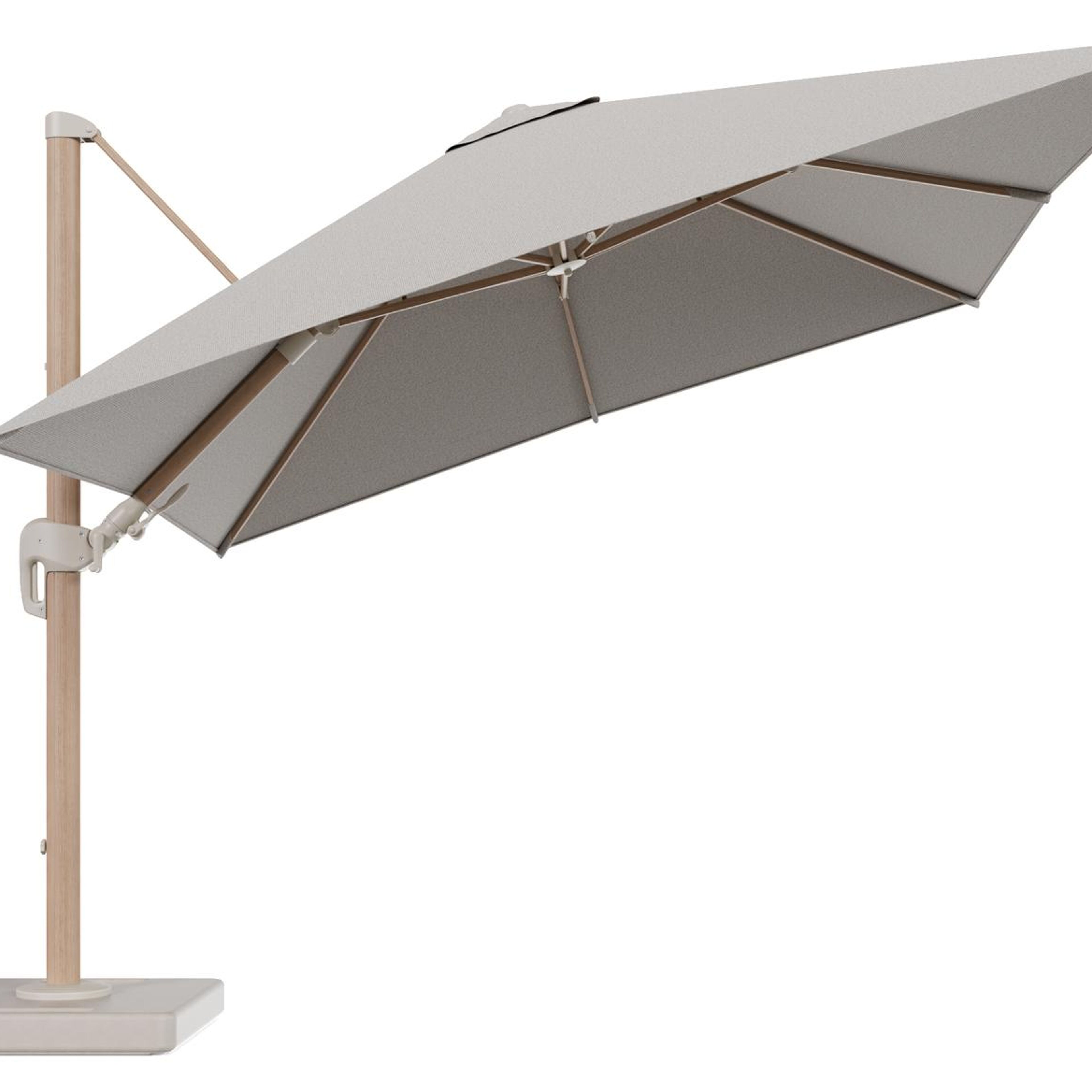 Parasol pendant Rufina avec fonction tilt en aluminium aspect de bois et toile de parasol en All Weather Solica Firenze Sand - Lg.1 300 x Lg.2 300 cm avec pied de parasol Lapido 160 kg | Exterioo mobilier de jardin