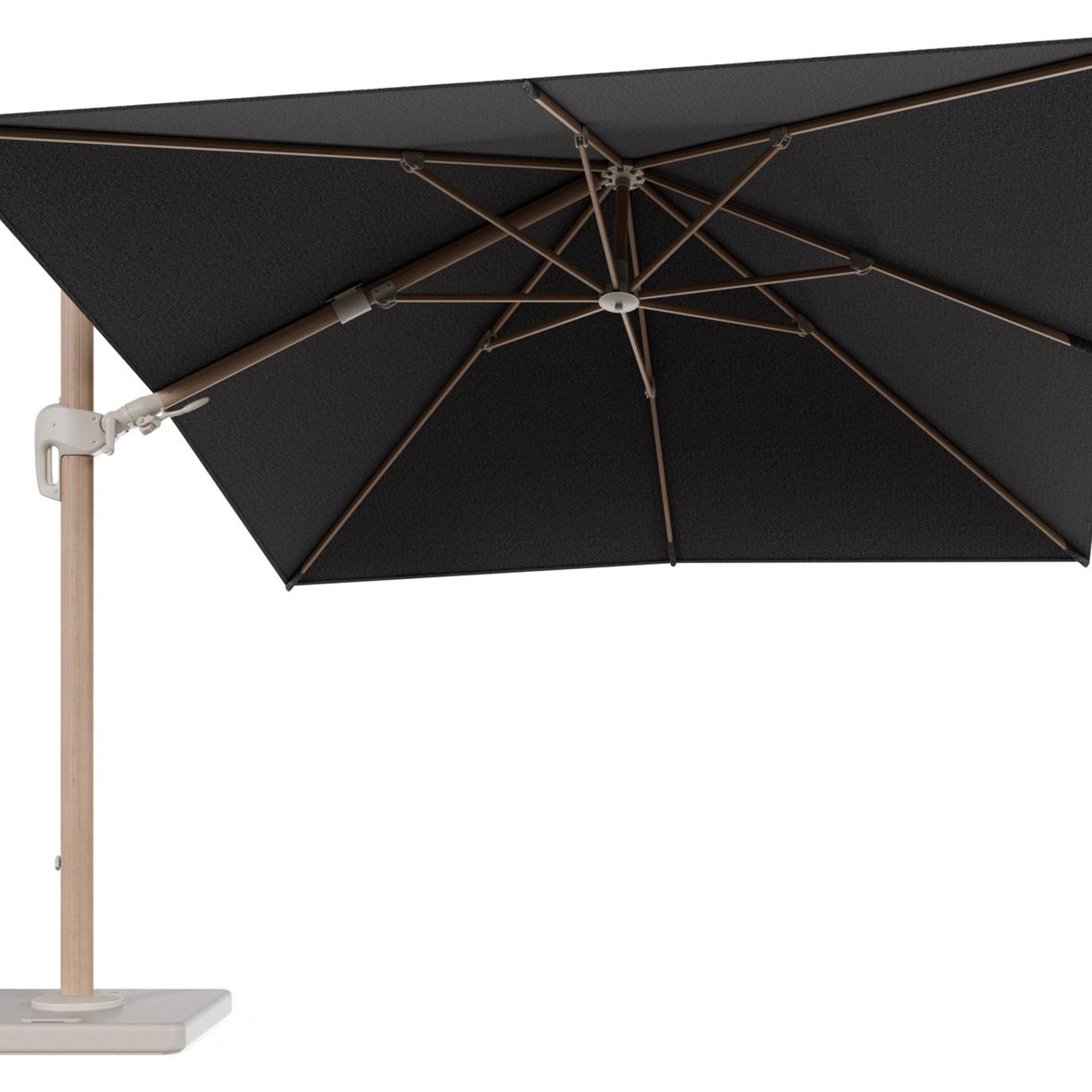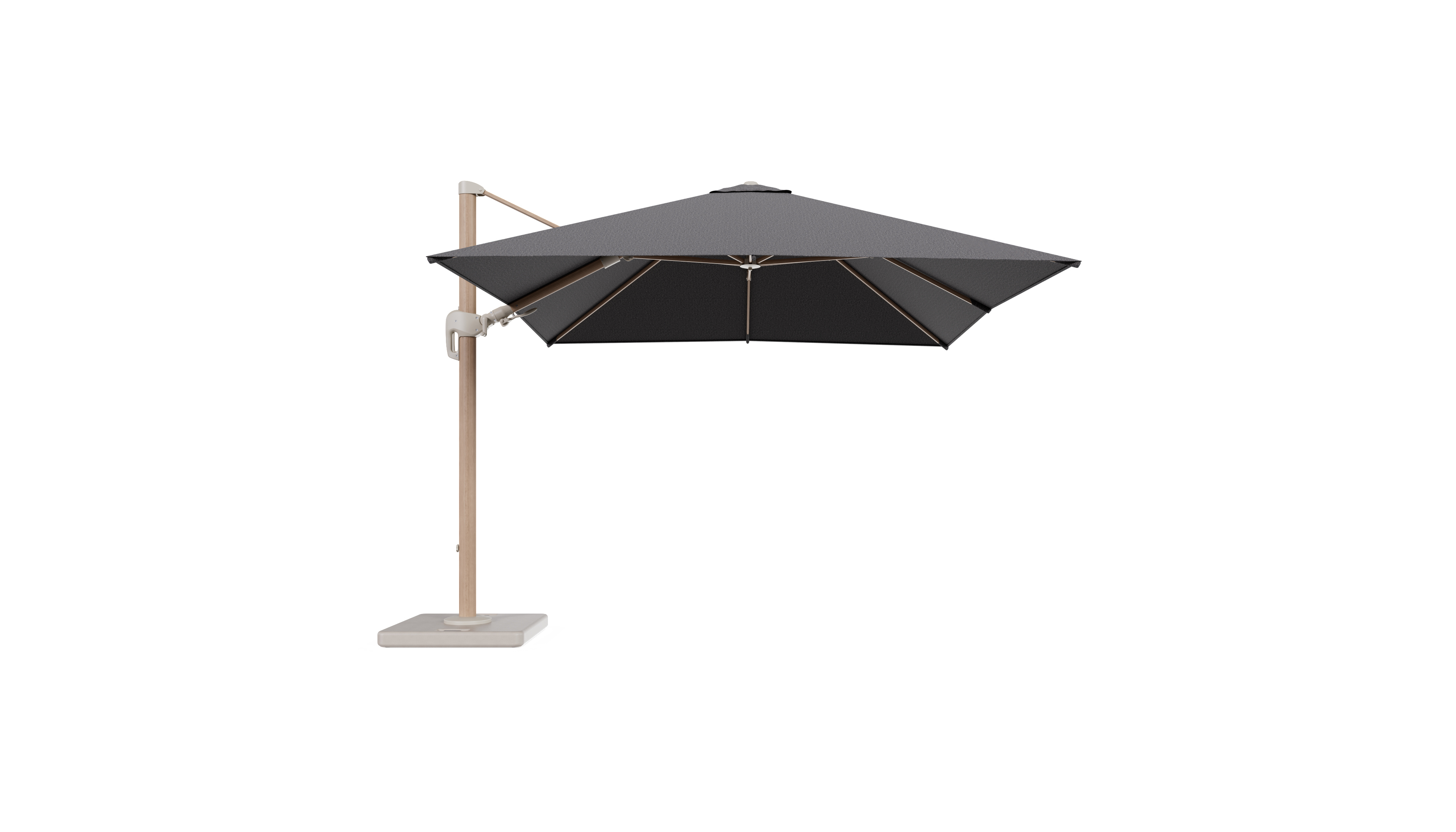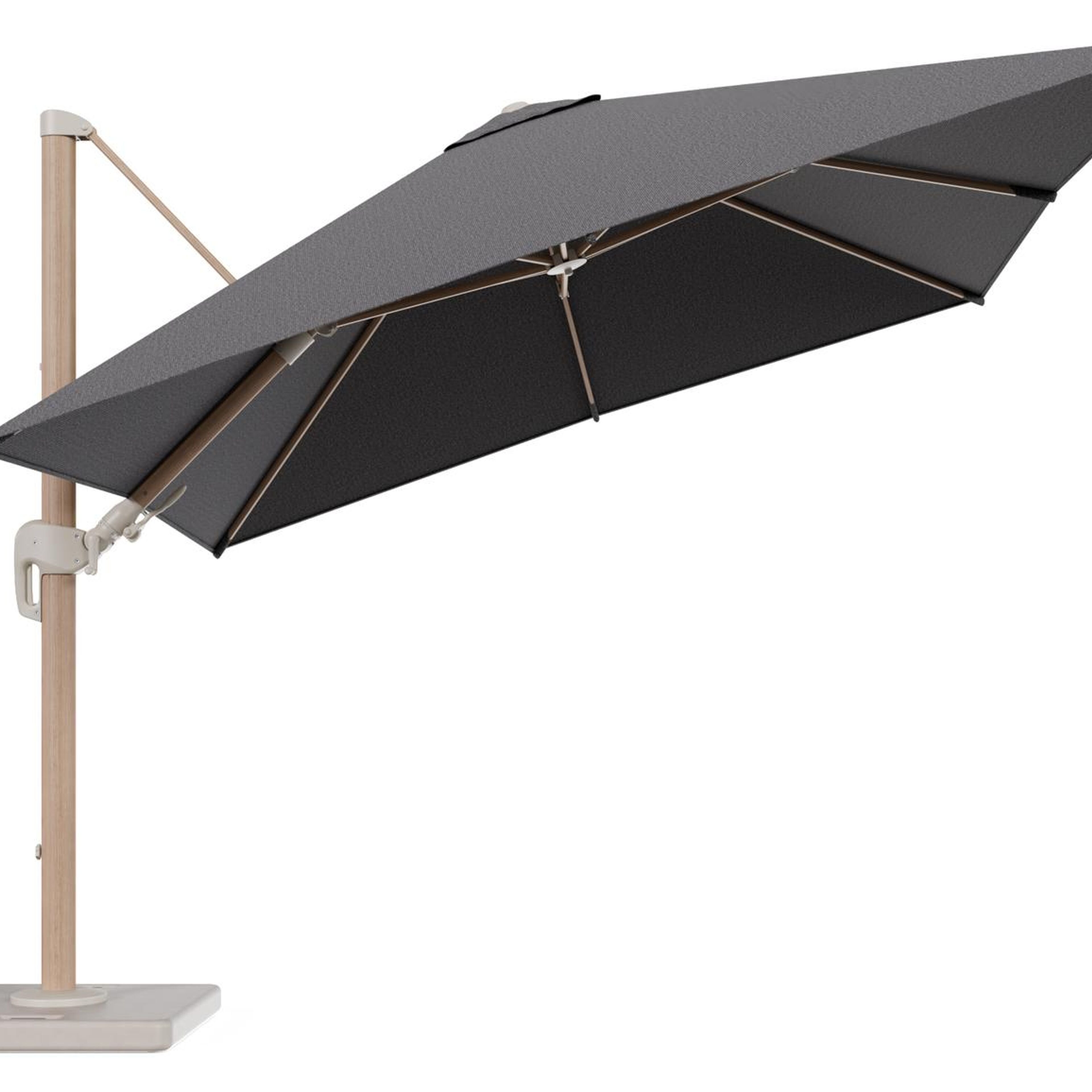 Parasol pendant Rufina avec fonction tilt en aluminium aspect de bois et toile de parasol en All Weather Solica Firenze Tunder - Lg.1 300 x Lg.2 300 cm avec pied de parasol Lapido 120 kg | Exterioo mobilier de jardin