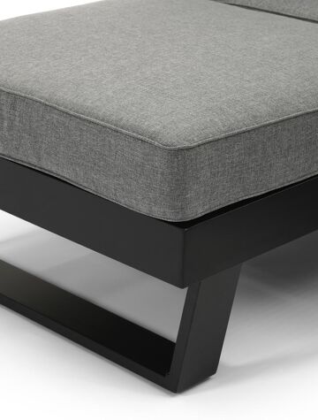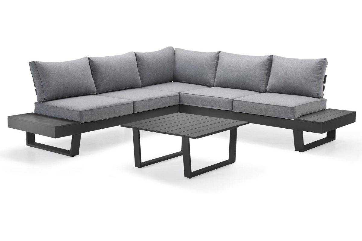 Le salon de jardin d'angle Alora a un piètement trapézoà¯dal et une armature robuste créant un style moderne. Les tables latérales offrent plus de place pour disposer des accessoires. Le salon de jardin est disponible avec des coussins de différentes couleurs.
