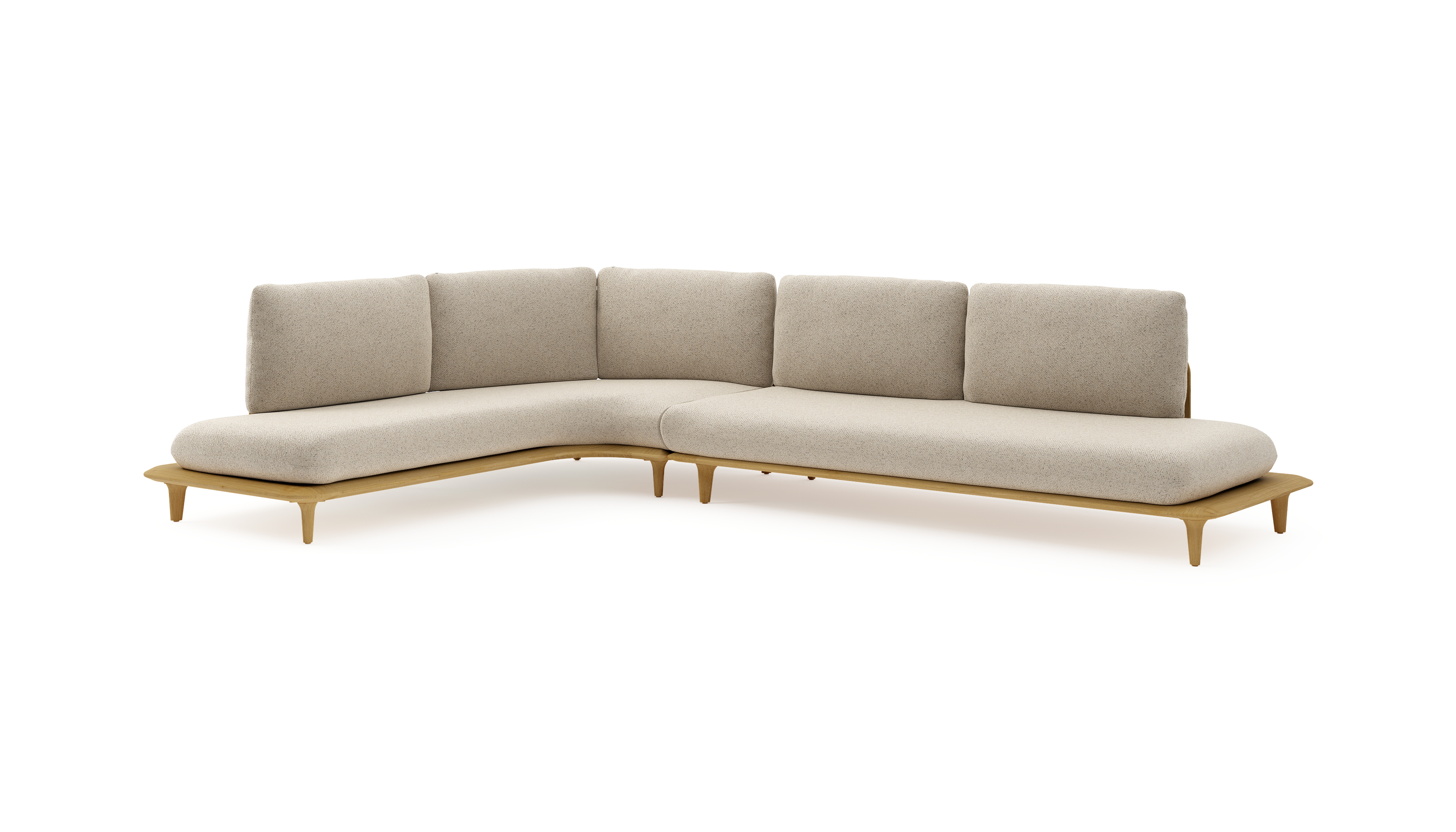 Salon de jardin d'angle Bomero en teck et coussins en all weather cosytica bora desert | Exterioo mobilier de jardin