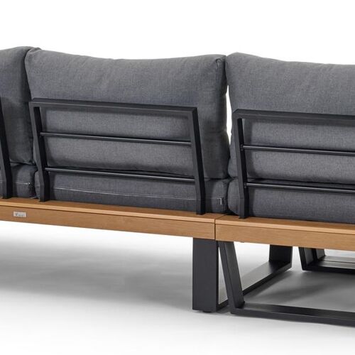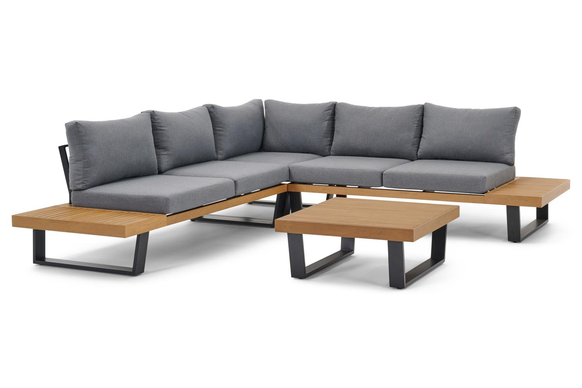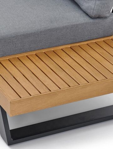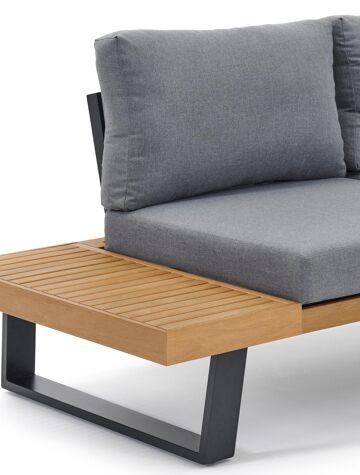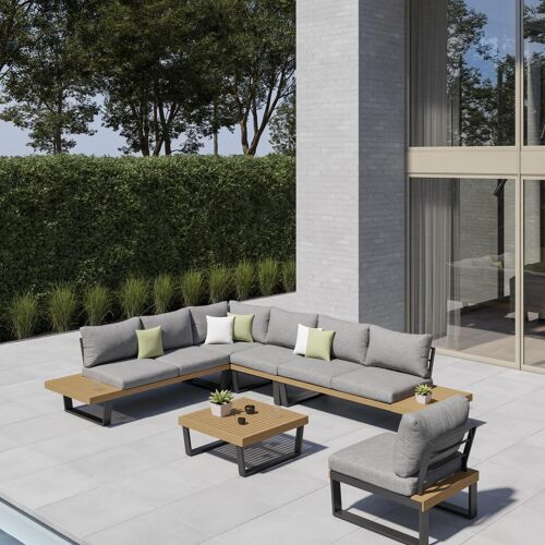 Le salon de jardin d'angle Campelo est un salon de jardin moderne à L'aspect chaleureux grâce à la présence du polywood. L'armature robuste en aluminium garantit la solidité du salon de jardin, qui est néanmoins facile à déplacer.