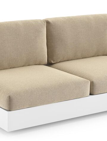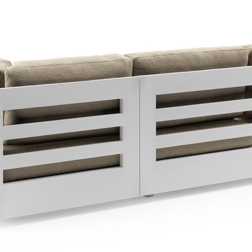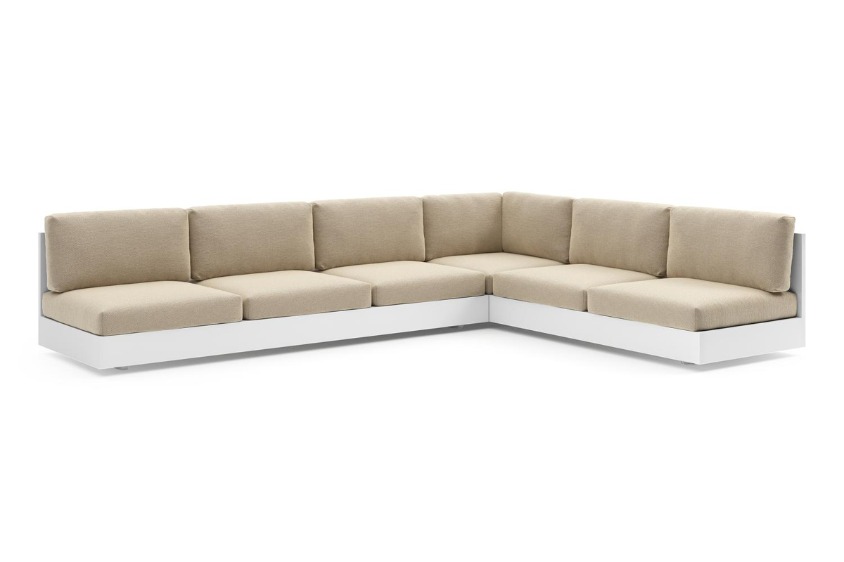 Salon de jardin d'angle Como en aluminium blanc et coussins en all weather cosytica althea camel | Exterioo
