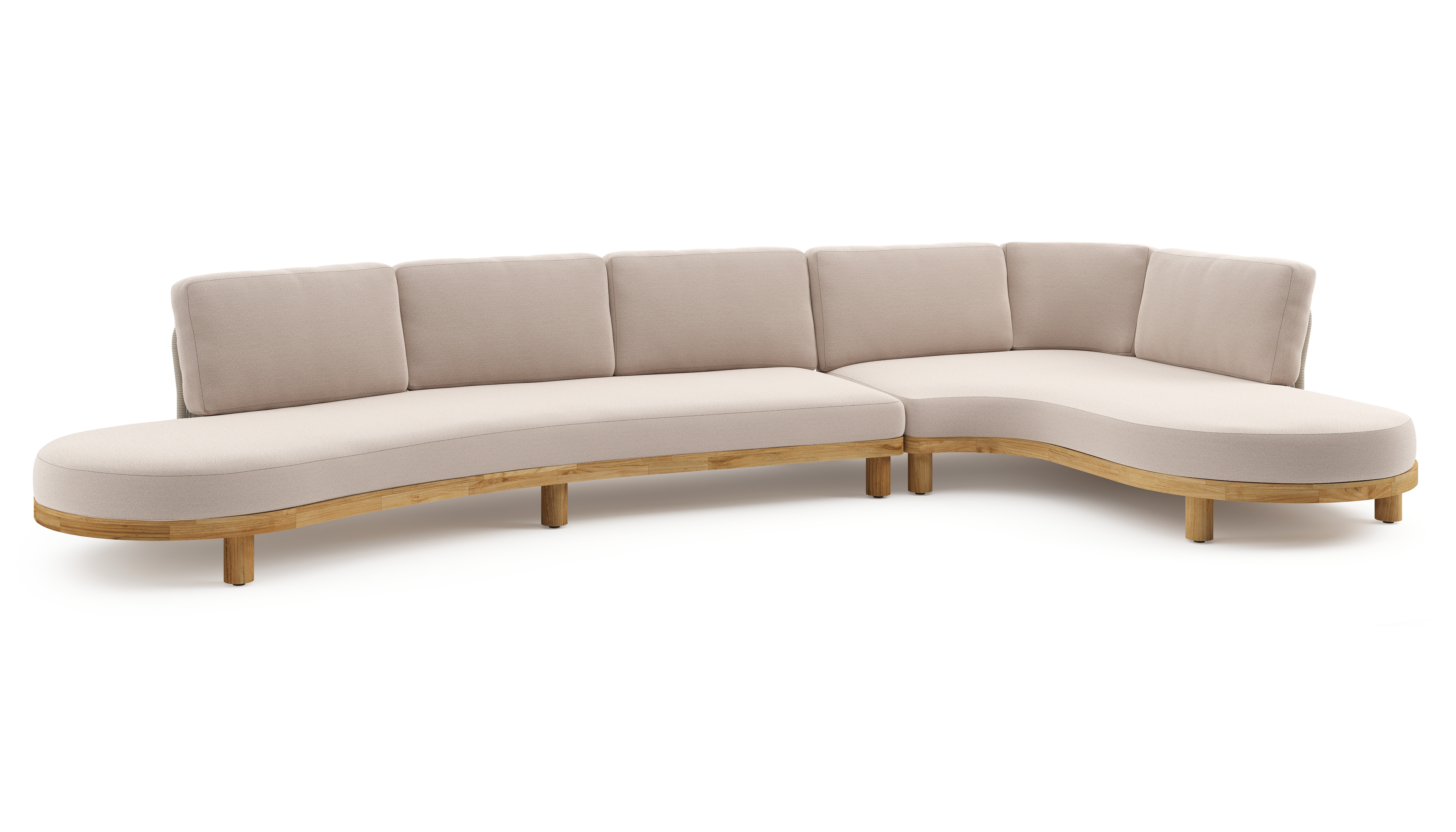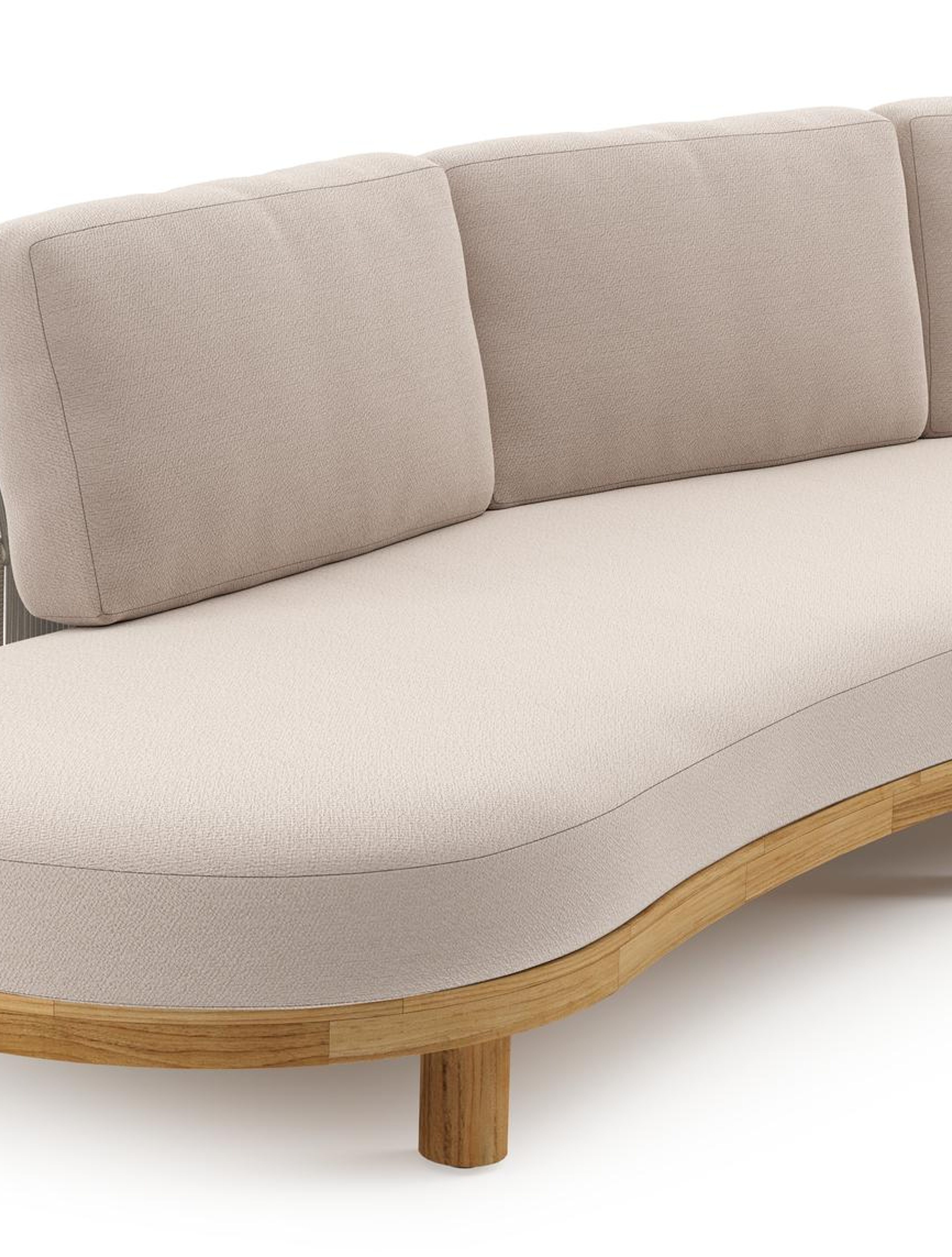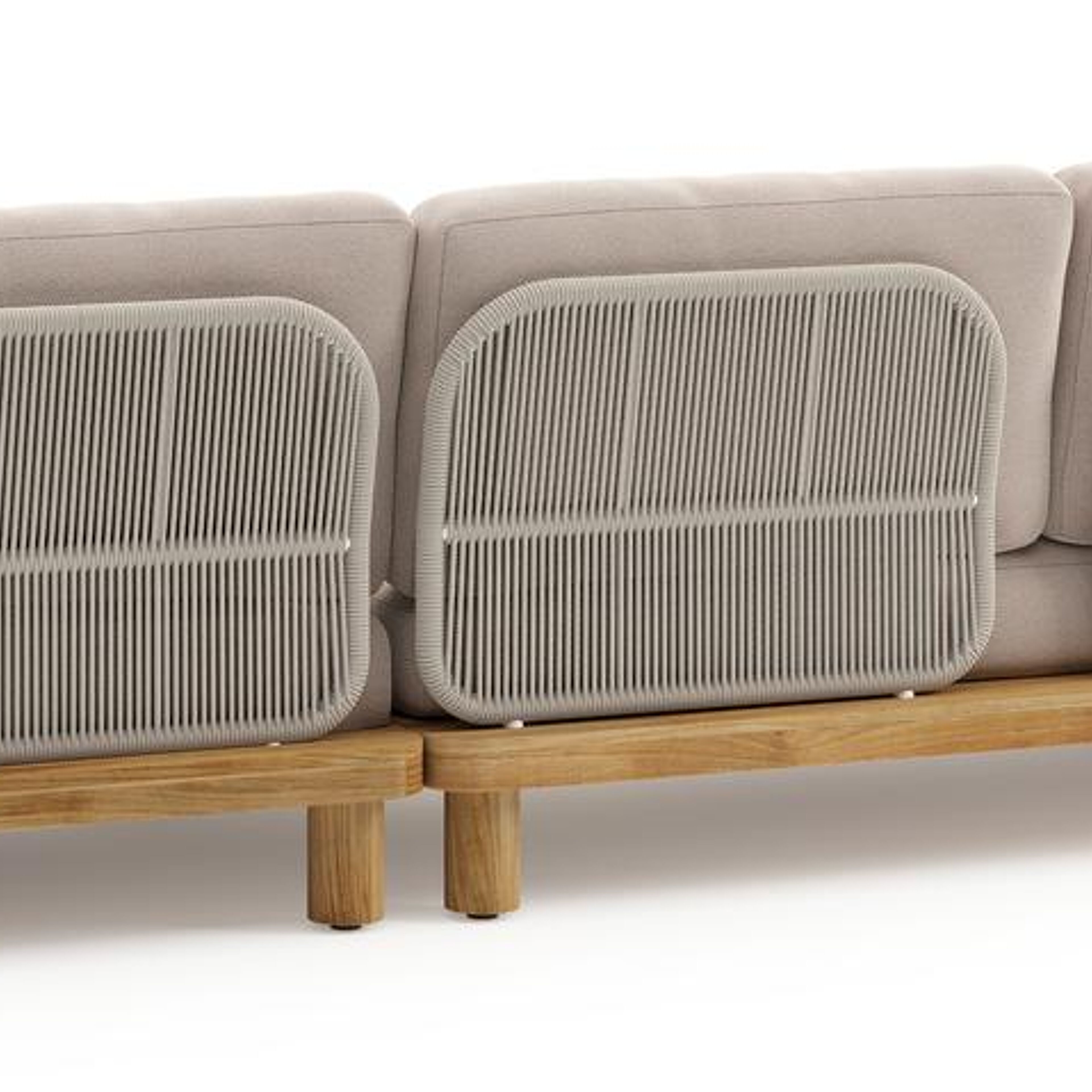 Salon de jardin d'angle Donato en teck et corde ronde tissée verticalement beige et coussins en all weather sunbrella® luxe Wander Pilat | Exterioo mobilier de jardin
