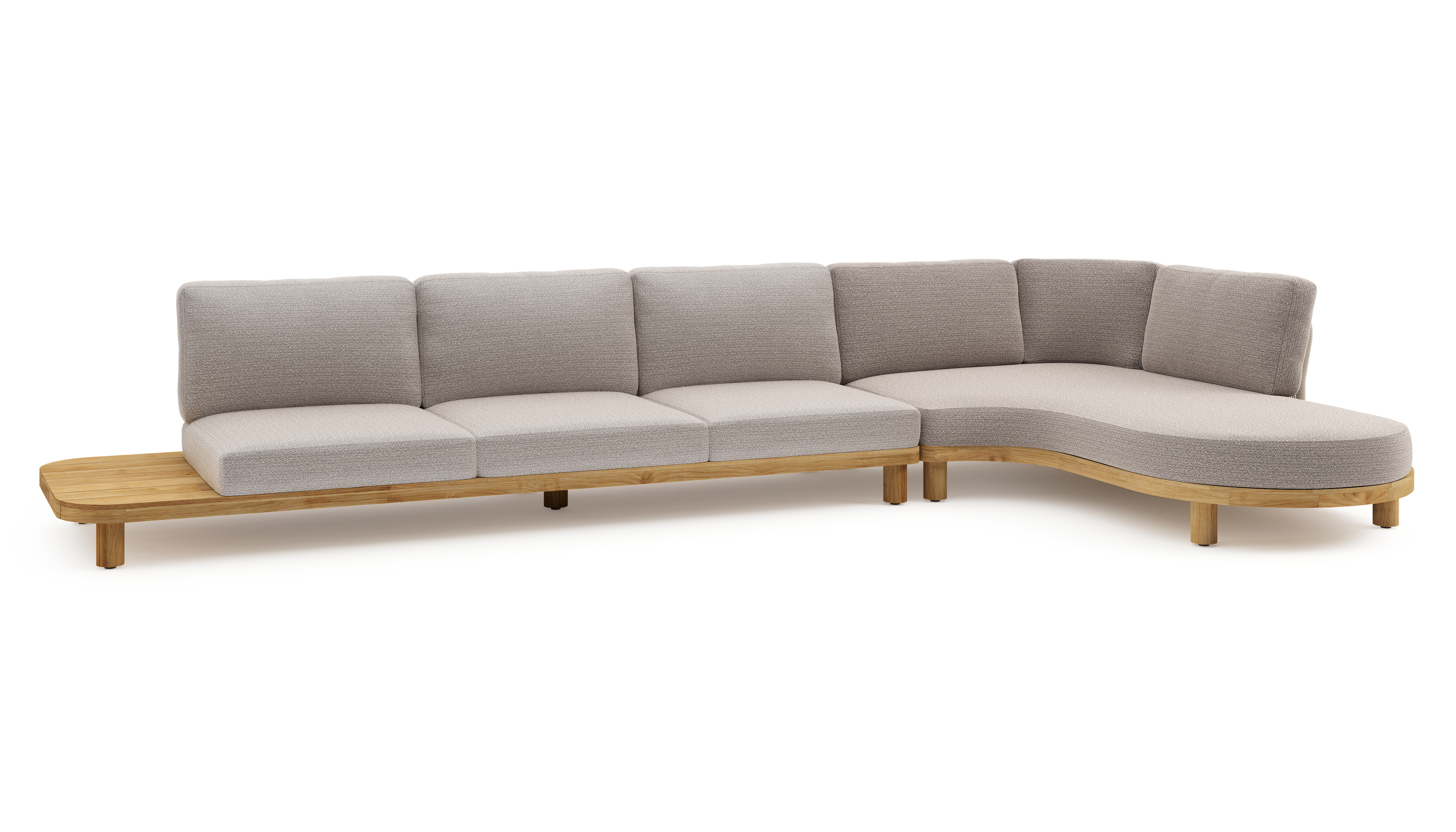 Salon de jardin d'angle Donato en teck et corde ronde tissée verticalement beige et coussins en all weather sunbrella® luxe Wander Granite | Exterioo mobilier de jardin