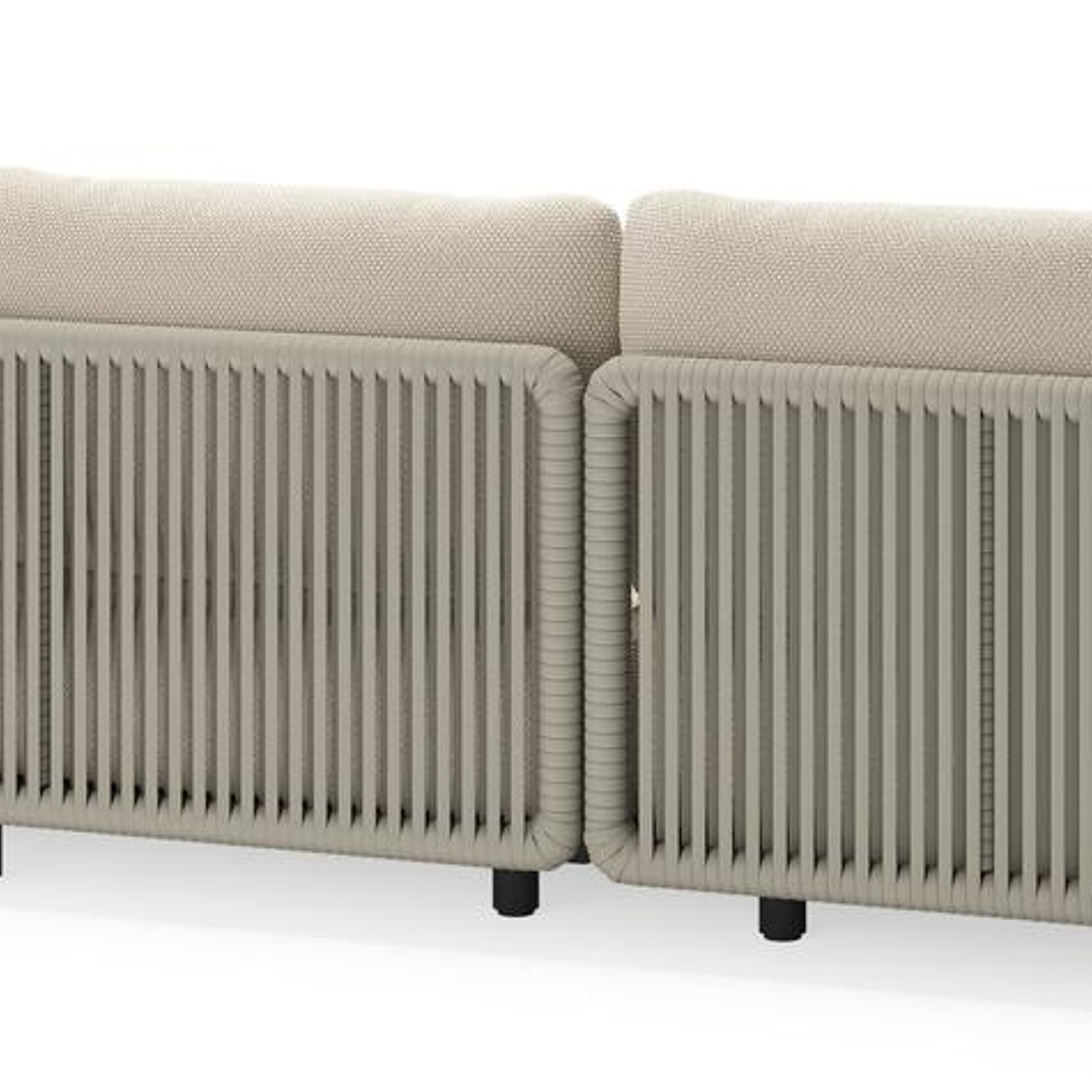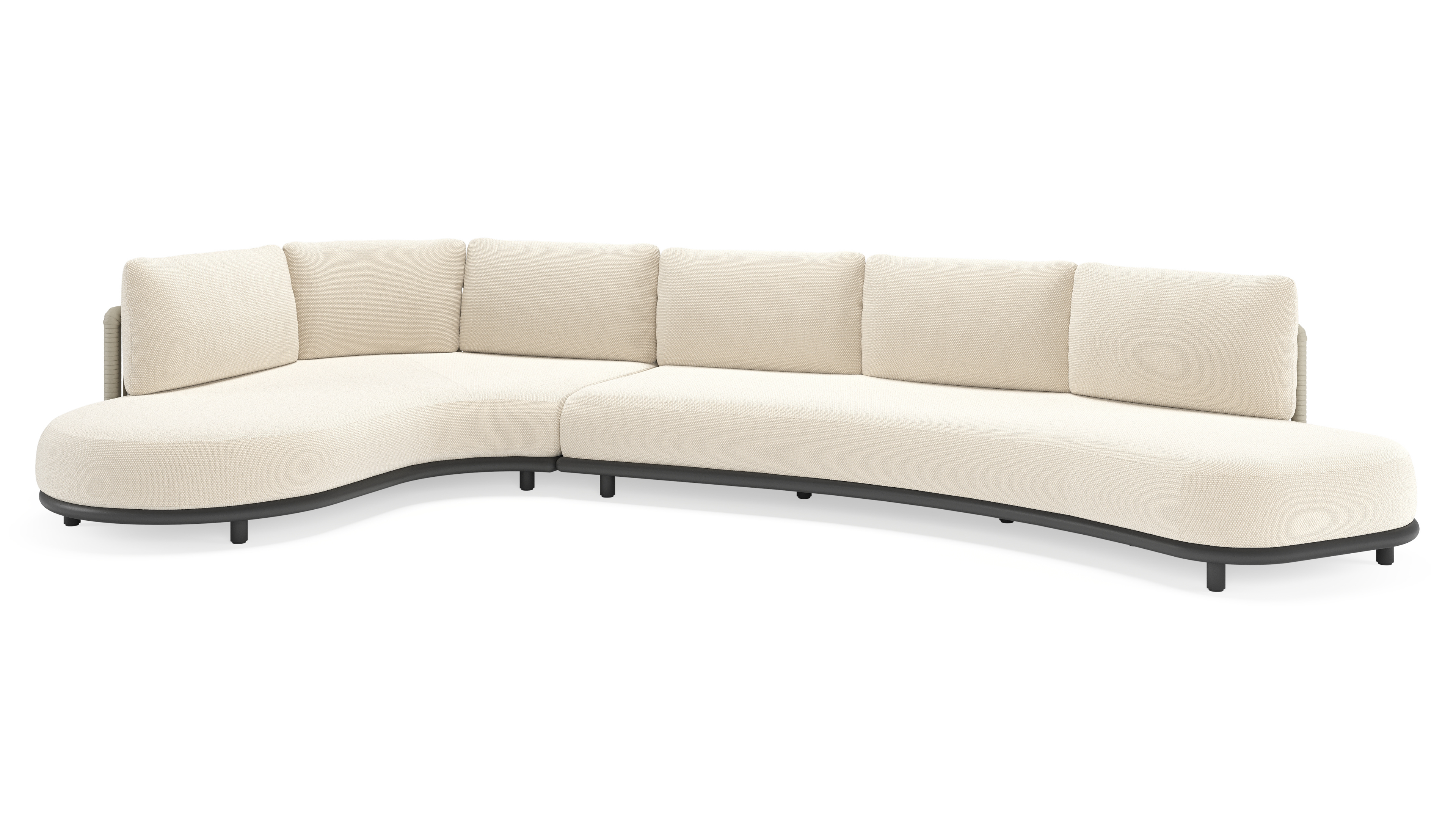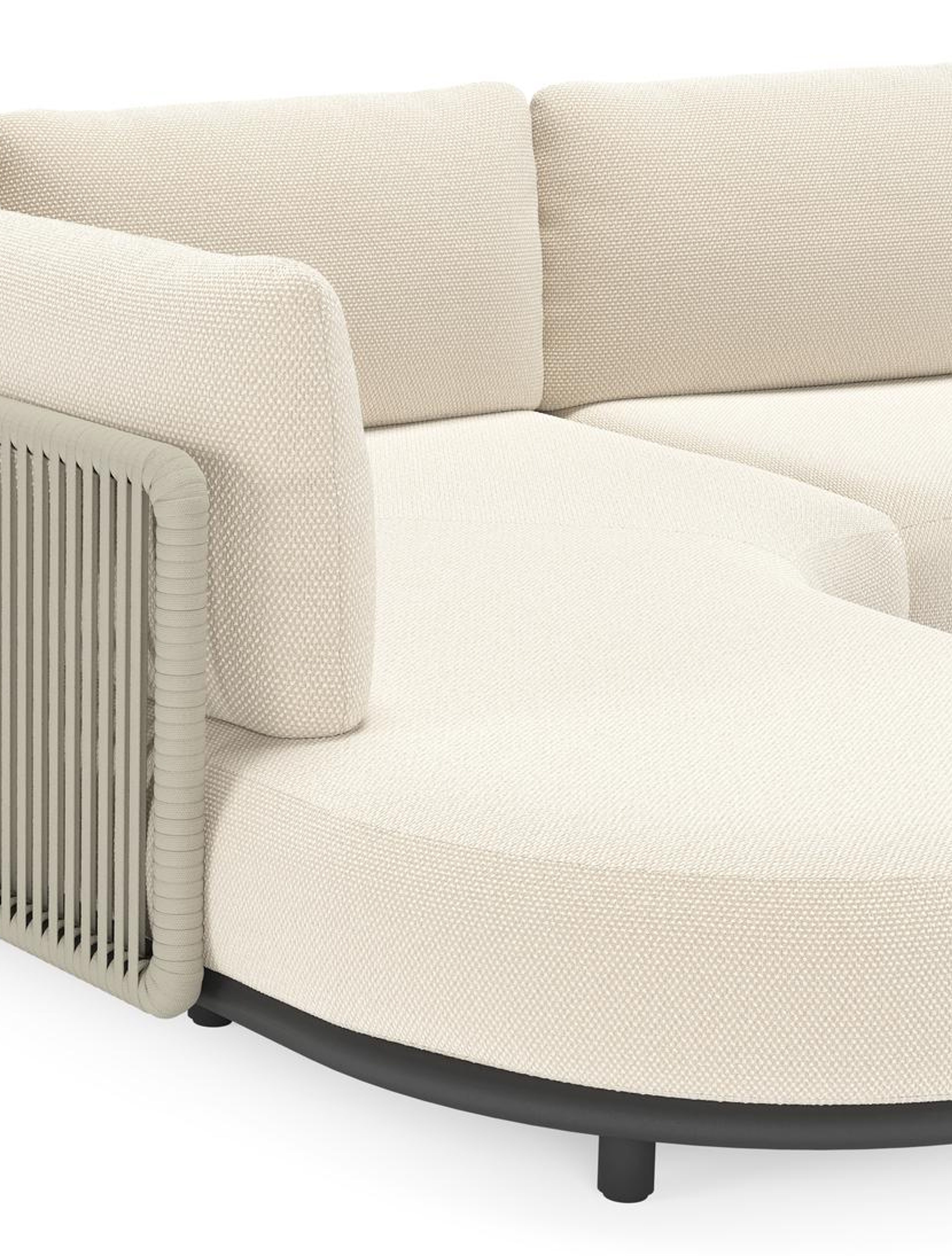 Salon de jardin d'angle Lomano en aluminium noir et corde luxe plate tissée verticalement beige et coussins en all weather cosytica Althea Off White | Exterioo mobilier de jardin
