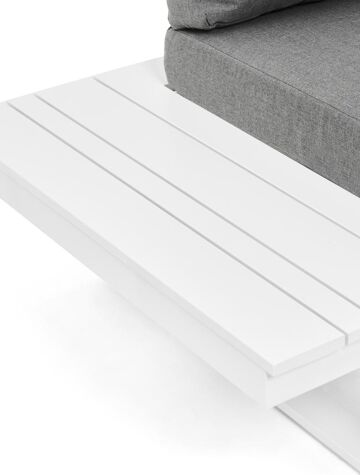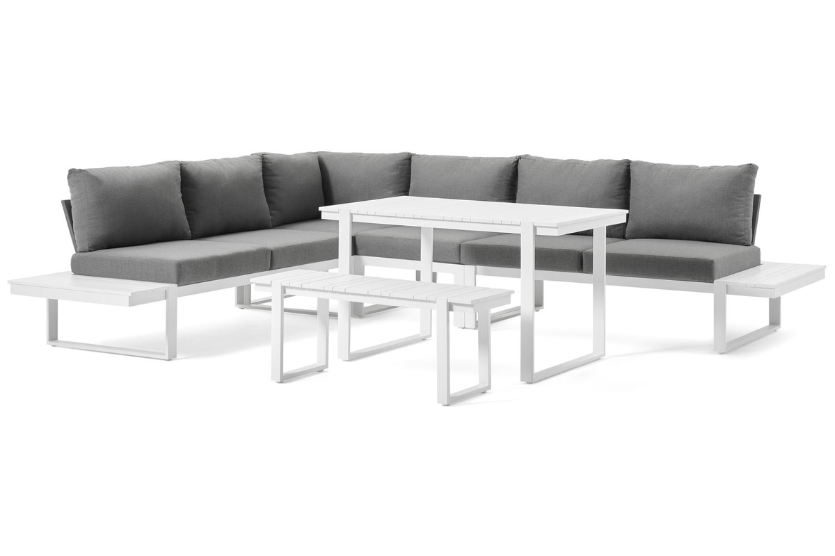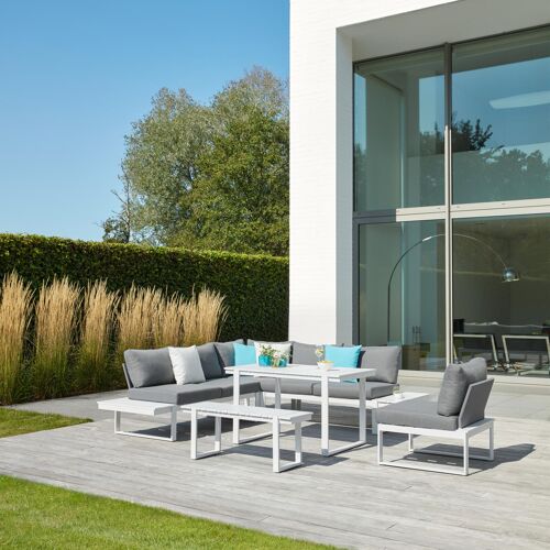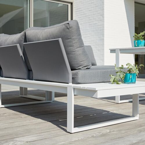 Le salon de jardin d'angle Merida a un design épuré et moderne avec en outre une table basse fonctionnelle. Les tables latérales offrent plus de place pour disposer des accessoires. La table du salon a une armature plus haute et est dotée d'un banc. Idéale pour manger ou travailler par exemple.