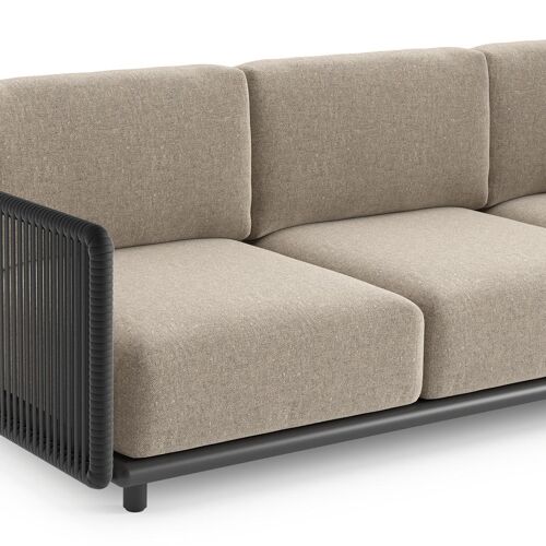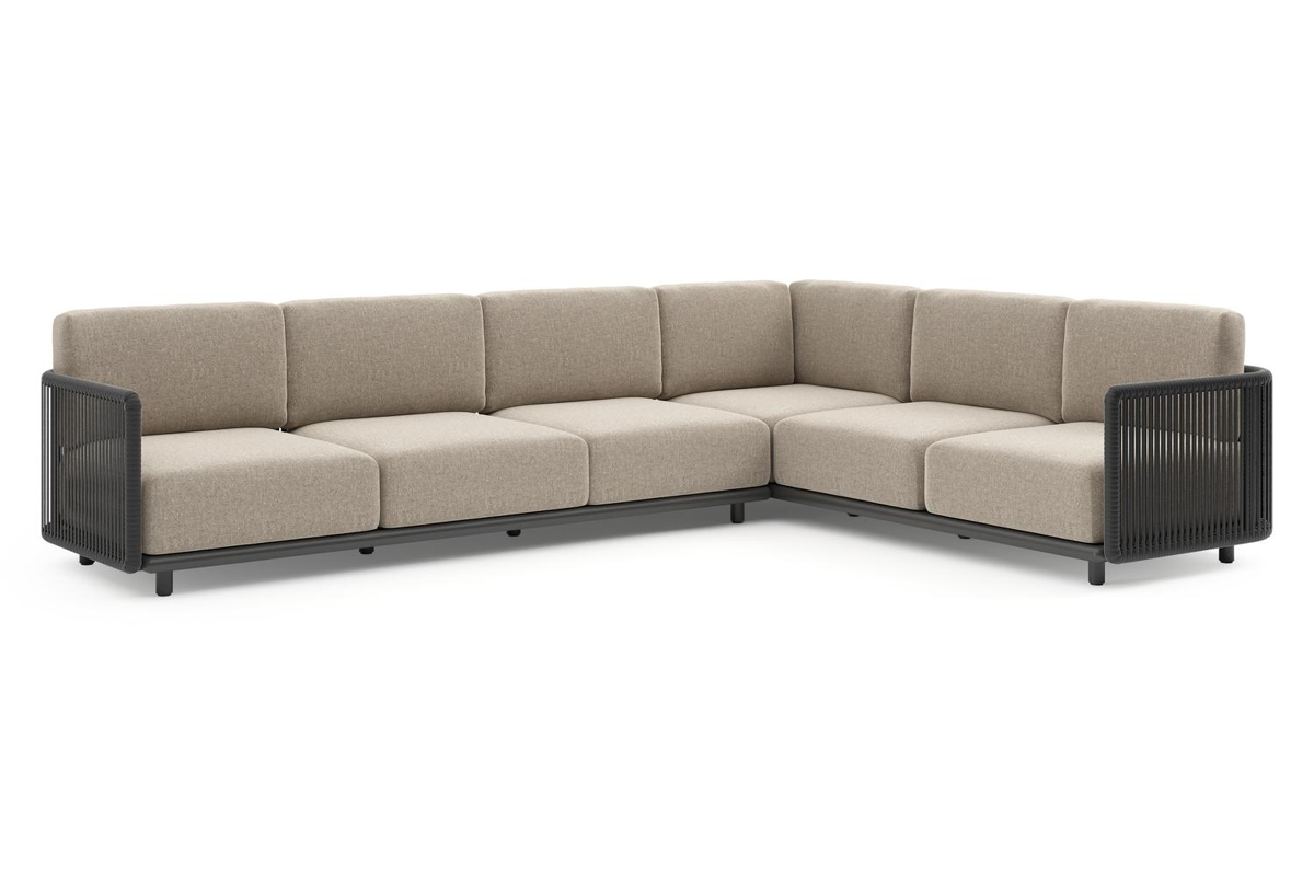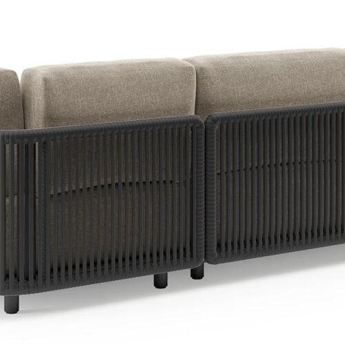 Salon de jardin d'angle Organo en aluminium noir et corde luxe plate tissée verticalement noir et coussin en all weather Sunbrella® luxe chartres pewter | Exterioo