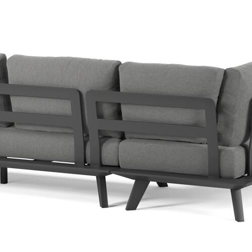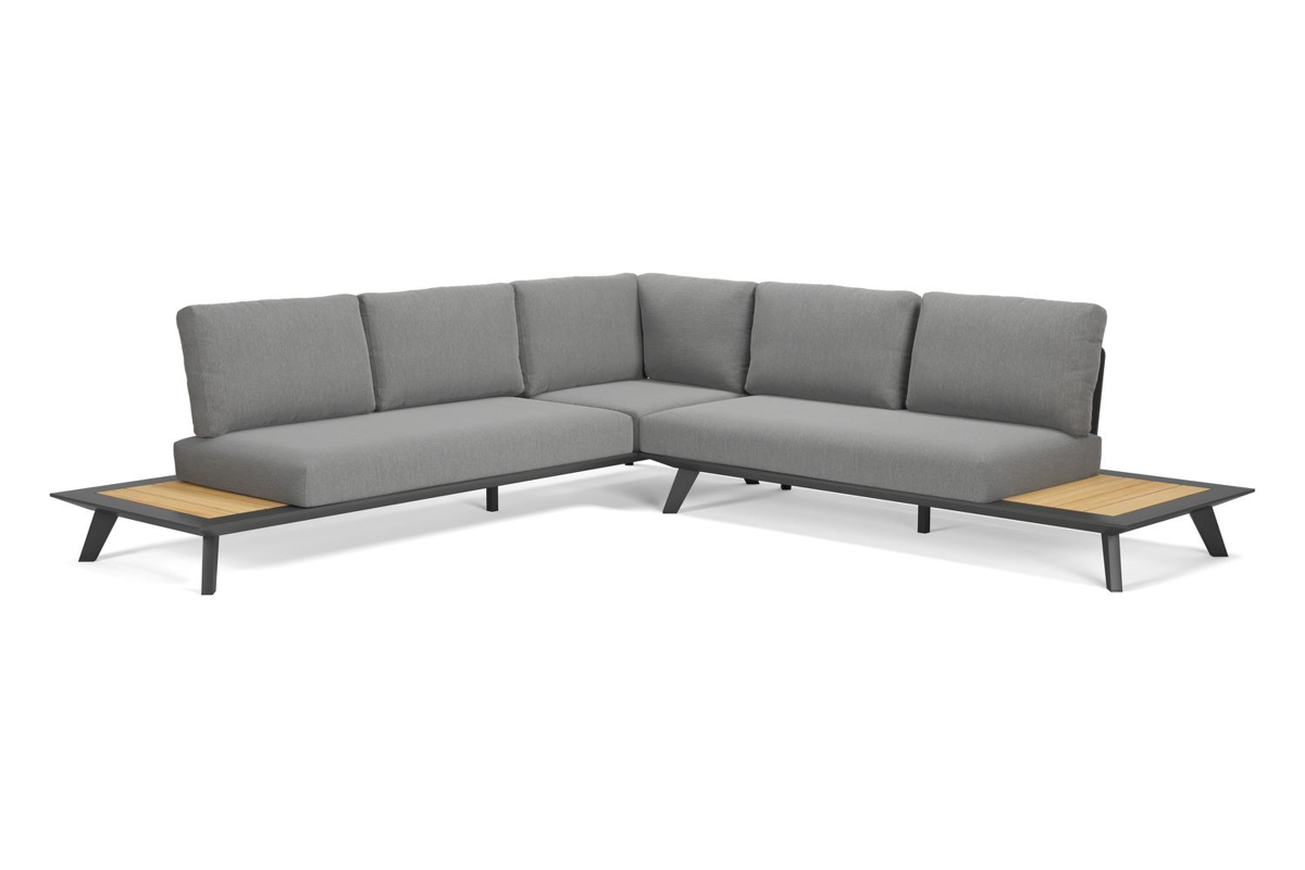 Le salon de jardin d'angle Puglia a un design simple, tout en étant élégant grâce à son armature raffinée. La collection présente, sous L'armature, les pieds inclinés caractéristiques comme petit détail. Les tables latérales offrent plus de place pour disposer des accessoires.