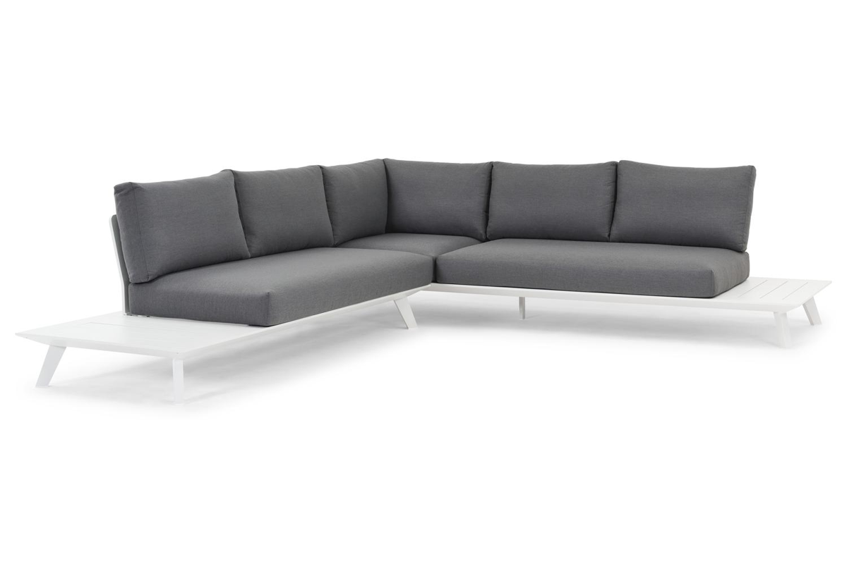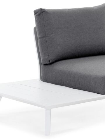 Le salon de jardin d'angle Puglia a un design simple, tout en étant élégant grâce à son armature raffinée. La collection présente, sous L'armature, les pieds inclinés caractéristiques comme petit détail. Les tables latérales offrent plus de place pour disposer des accessoires.