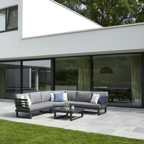 Le salon de jardin d'angle Rosarno est un salon de jardin robuste au style futuriste. Le salon de jardin présente un angle large, créant une place supplémentaire.