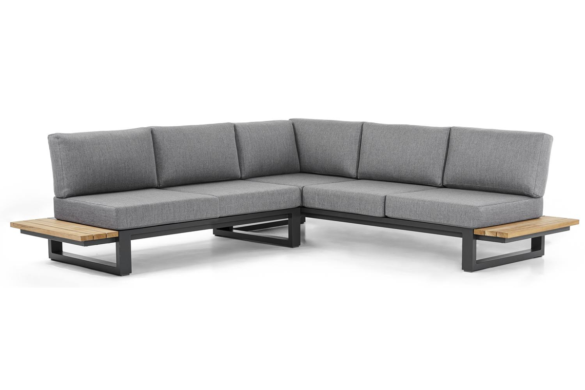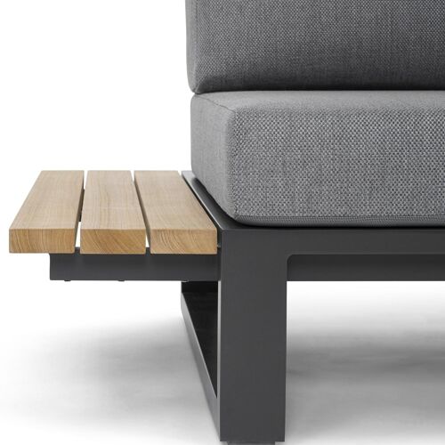 L'armature du salon de jardin est en aluminium inoxydable, un matériau robuste mais léger, qui est facile à déplacer. La surface présente une finition lisse, de sorte qu’elle n'attire pas la saleté et est facile à entretenir. Le revêtement poudré garantit la résistance aux UV et aux intempéries de votre meuble.Les tables d'appoint en teck sont synonymes de qualité exceptionnelle et de design naturel. Le teck est une essence de qualité qui se caractérise par sa dureté. Le bois étant un un matériau vivant, sa structure ou sa couleur peuvent légèrement varier.
