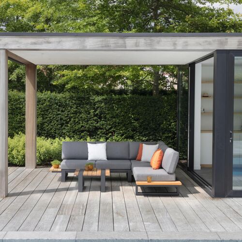 Le salon de jardin d'angle Turino est un salon de jardin au style épuré avec une armature et des pieds droits. Les tables latérales offrent plus de place pour disposer des accessoires.