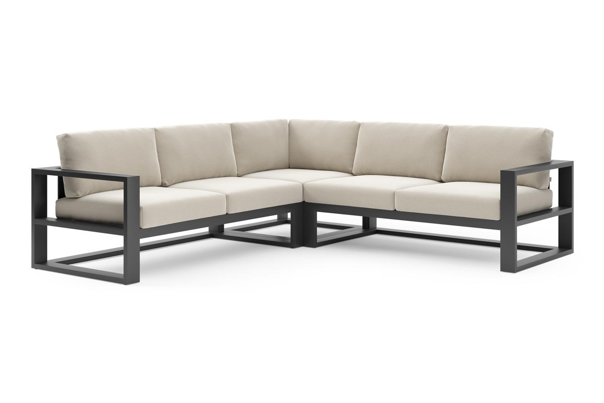 Salon de jardin d'angle Verato en aluminium noir et coussins en all weather sunbrella® luxe lopi marble | Exterioo