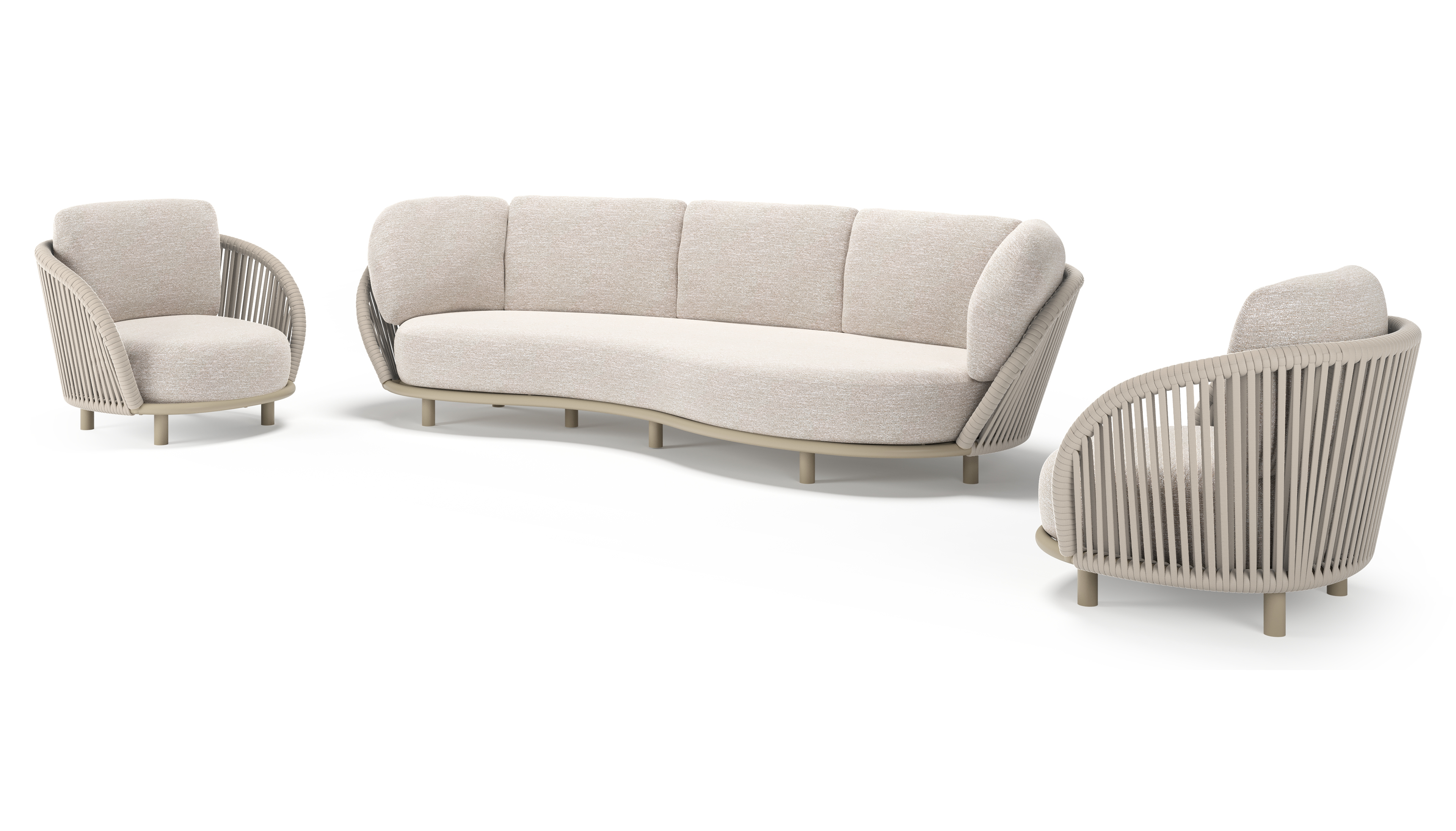 Salon de jardin Lupino en aluminium beige et corde large plate de luxe tissée verticalement beige et coussins en all weather sunbrella® luxe tundra sand | Exterioo mobilier de jardin