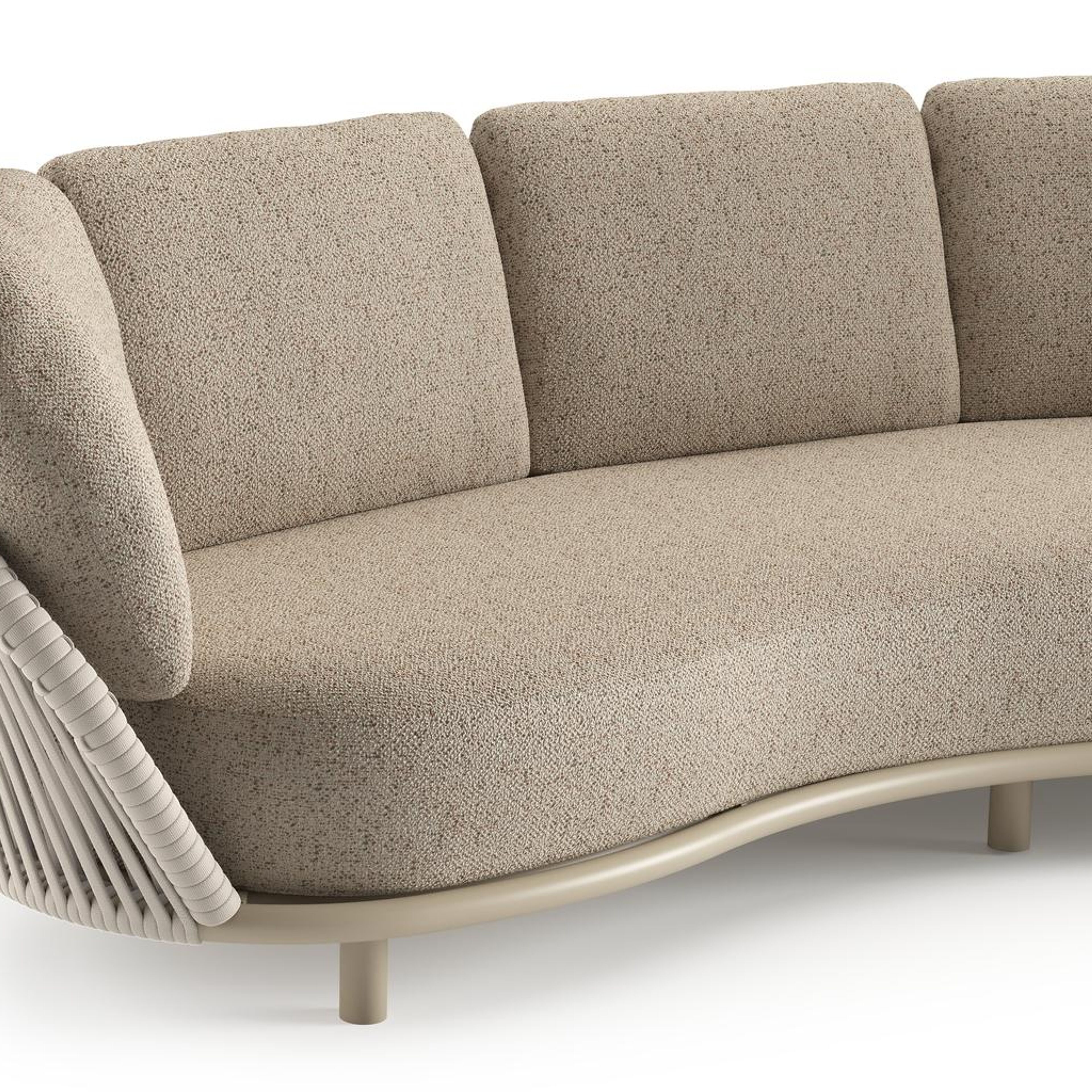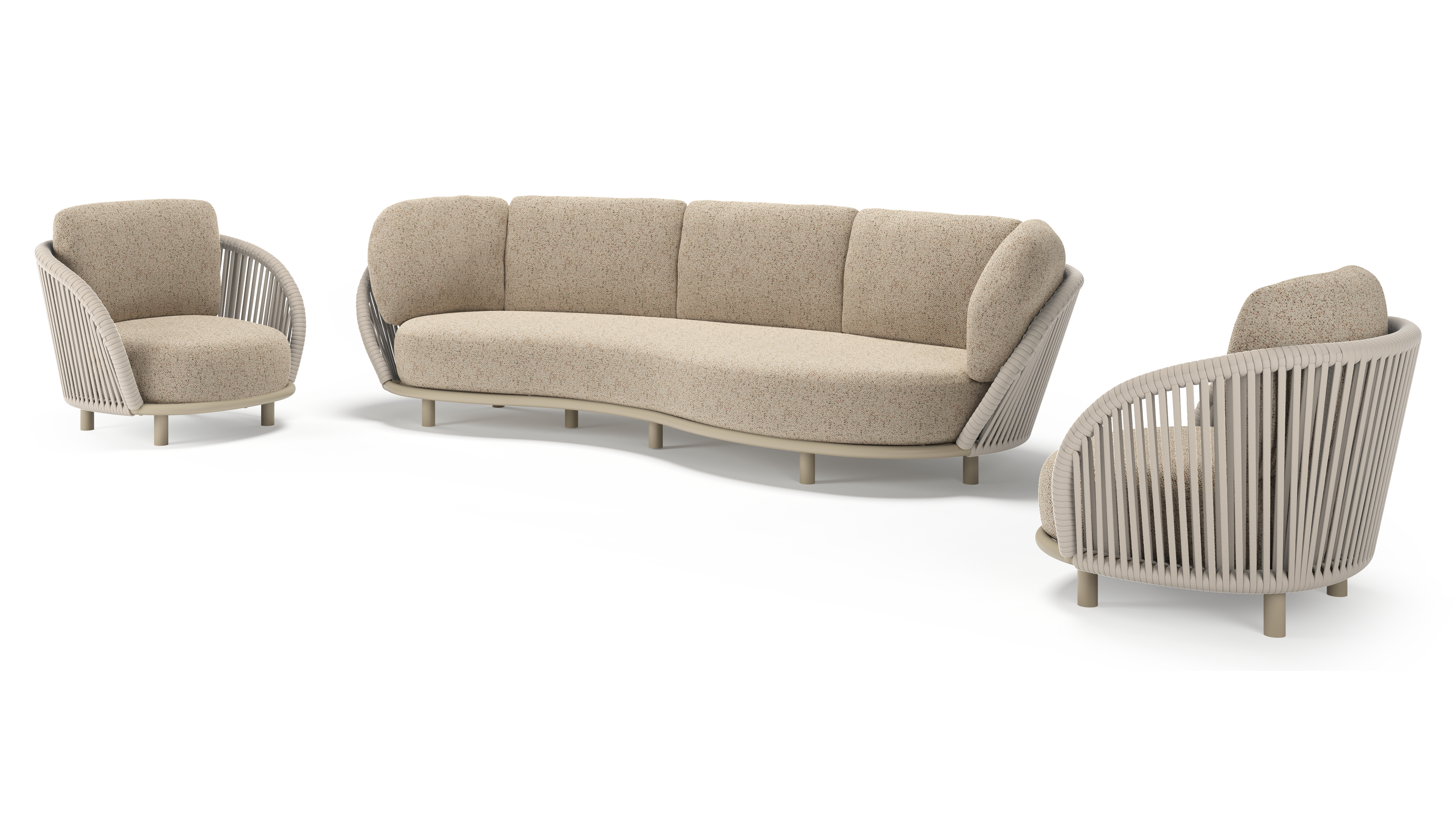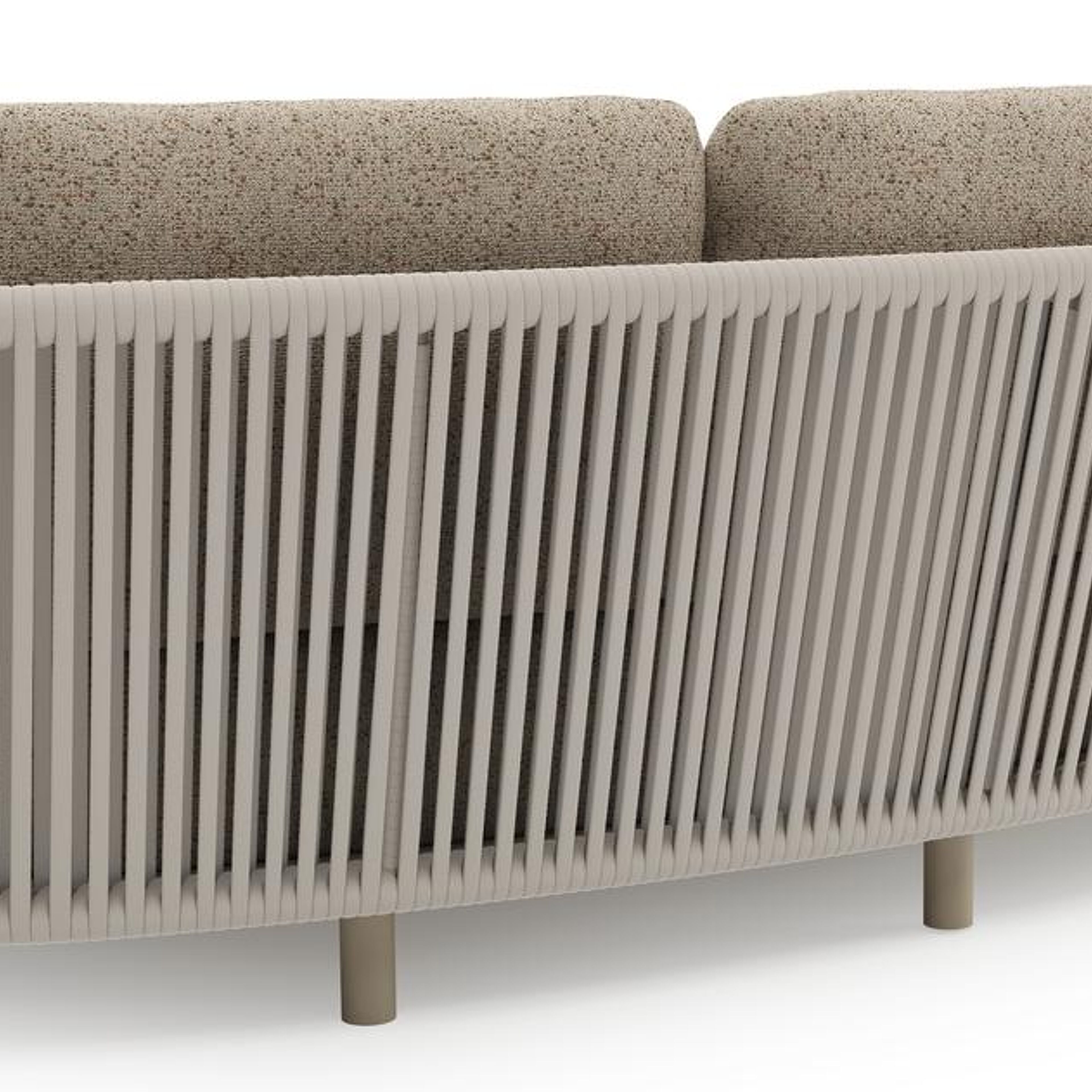 Salon de jardin Lupino en aluminium beige et corde large plate de luxe tissée verticalement beige et coussins en all weather cosytica bora jungle | Exterioo mobilier de jardin