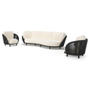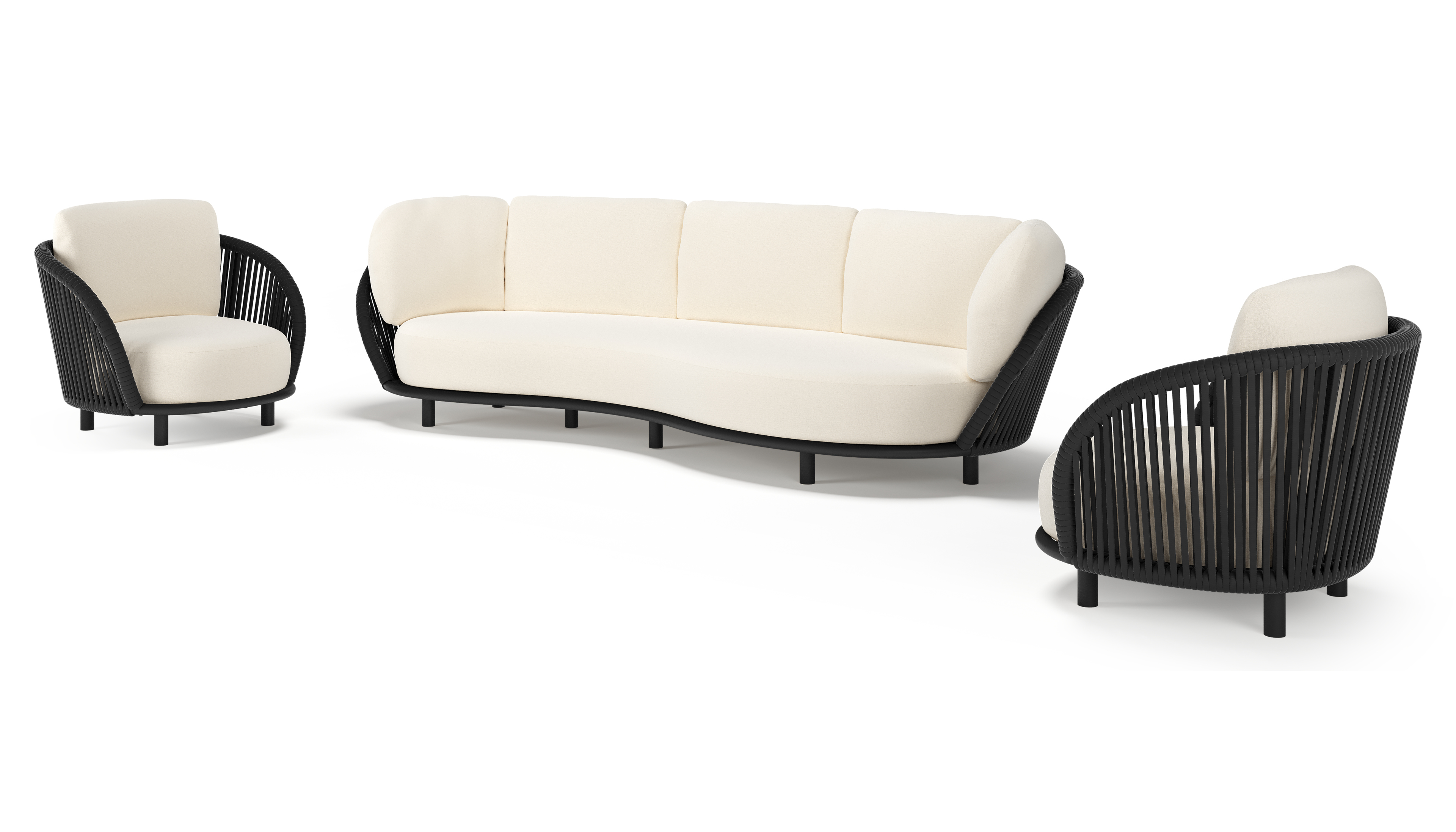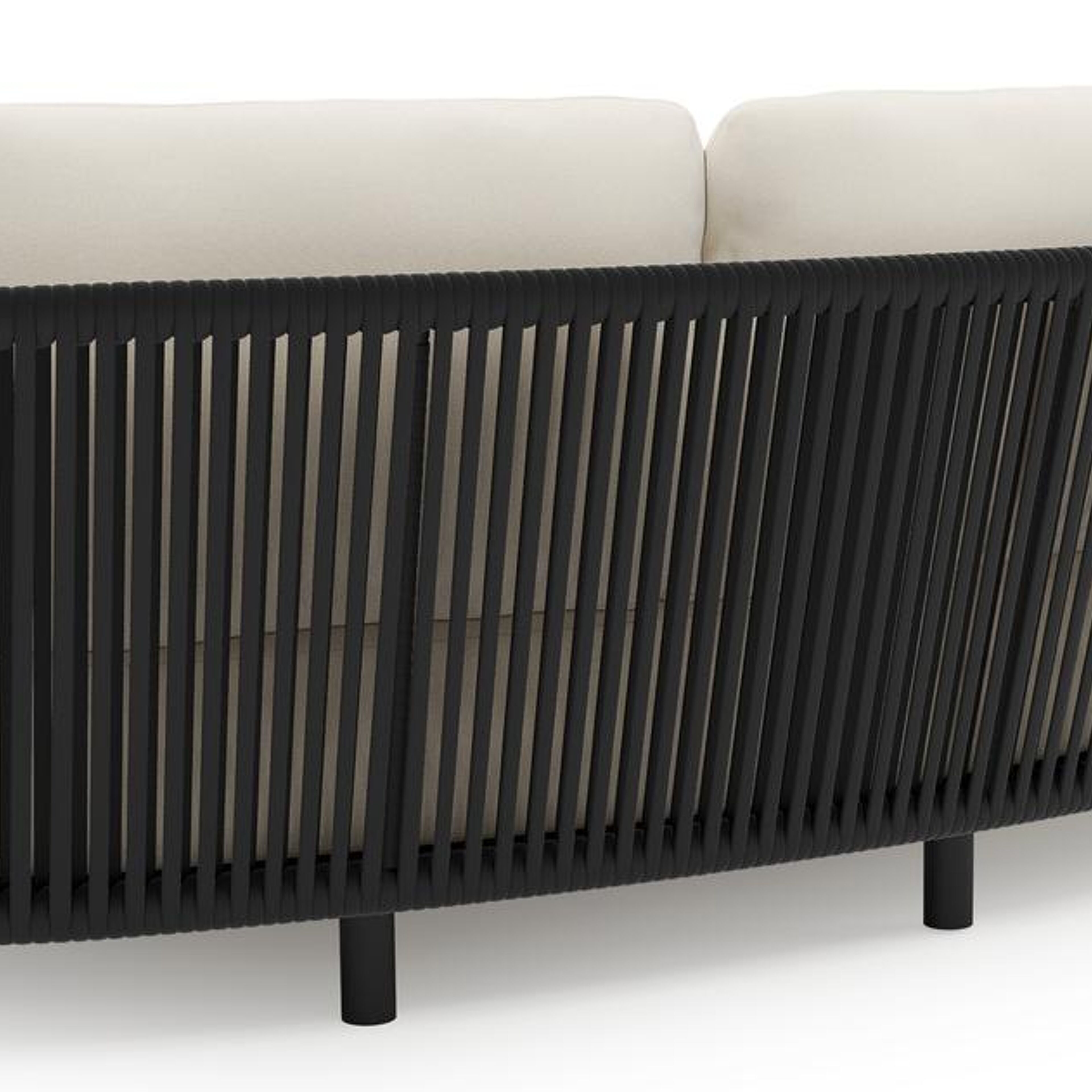 Salon de jardin Lupino en aluminium noir et corde large plate de luxe tissée verticalement noir et coussins en all weather sunbrella® luxe natte white | Exterioo mobilier de jardin