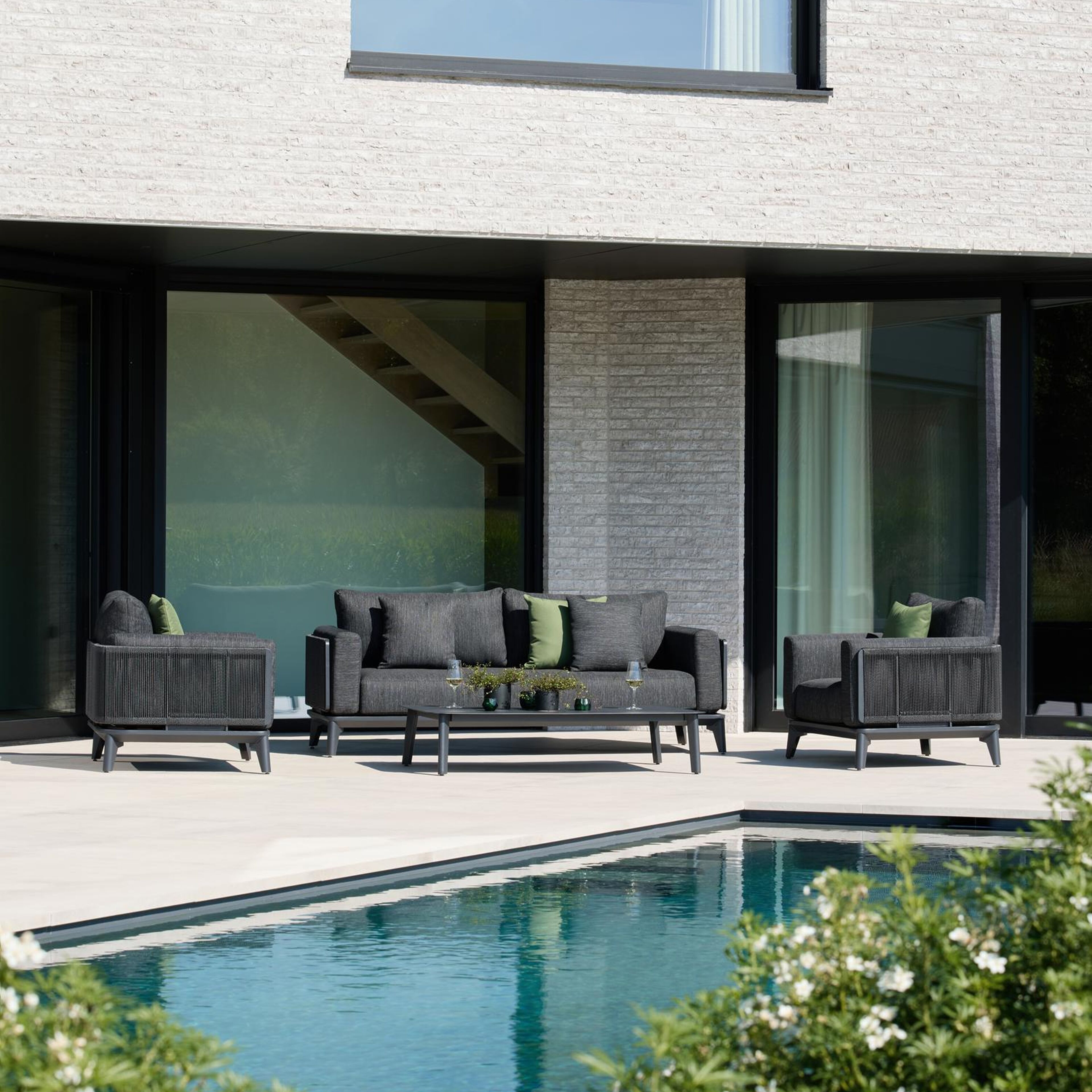 La salon de jardin Mosa prolonge votre intérieur à L'extérieur. Réalisé en corde de haute qualité avec armature en aluminium profilé, ce salon moderne marie gracieusement style et fonctionnalité. Même ses accoudoirs sont dotés d'un coussin confortable.