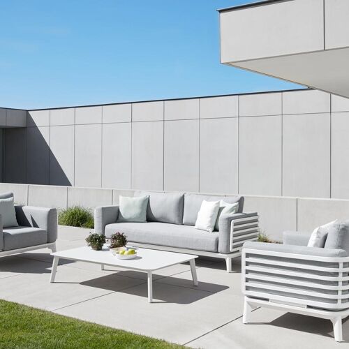 L'armature du salon de jardin est en aluminium inoxydable, un matériau robuste mais léger, qui est facile à déplacer. La surface présente une finition lisse, de sorte qu’elle n'attire pas la saleté et est facile à entretenir. Le revêtement poudré garantit la résistance aux UV et aux intempéries de votre meuble.