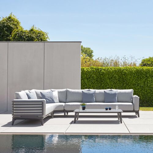 Les coussins sont compris et sont en Weather+ Softtouch. Les coussins durables sont doux au toucher et repoussent la saleté. Les coussins Weather+ Softtouch sont hydrofuges dans une mesure limitée et renferment une couche de mousse standard dans une housse intérieure imperméable. En hiver ou en cas de longue période de pluie, il est préférable de ranger les coussins à l’intérieur.