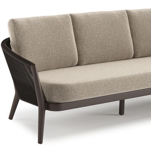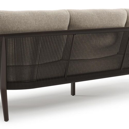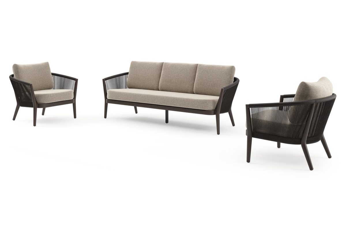 Salon de jardin Orso en aluminium brun foncé en corde ronde tissée verticalement brun foncé et coussins en all weather sunbrella® luxe Chartres Pewter | Exterioo