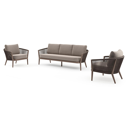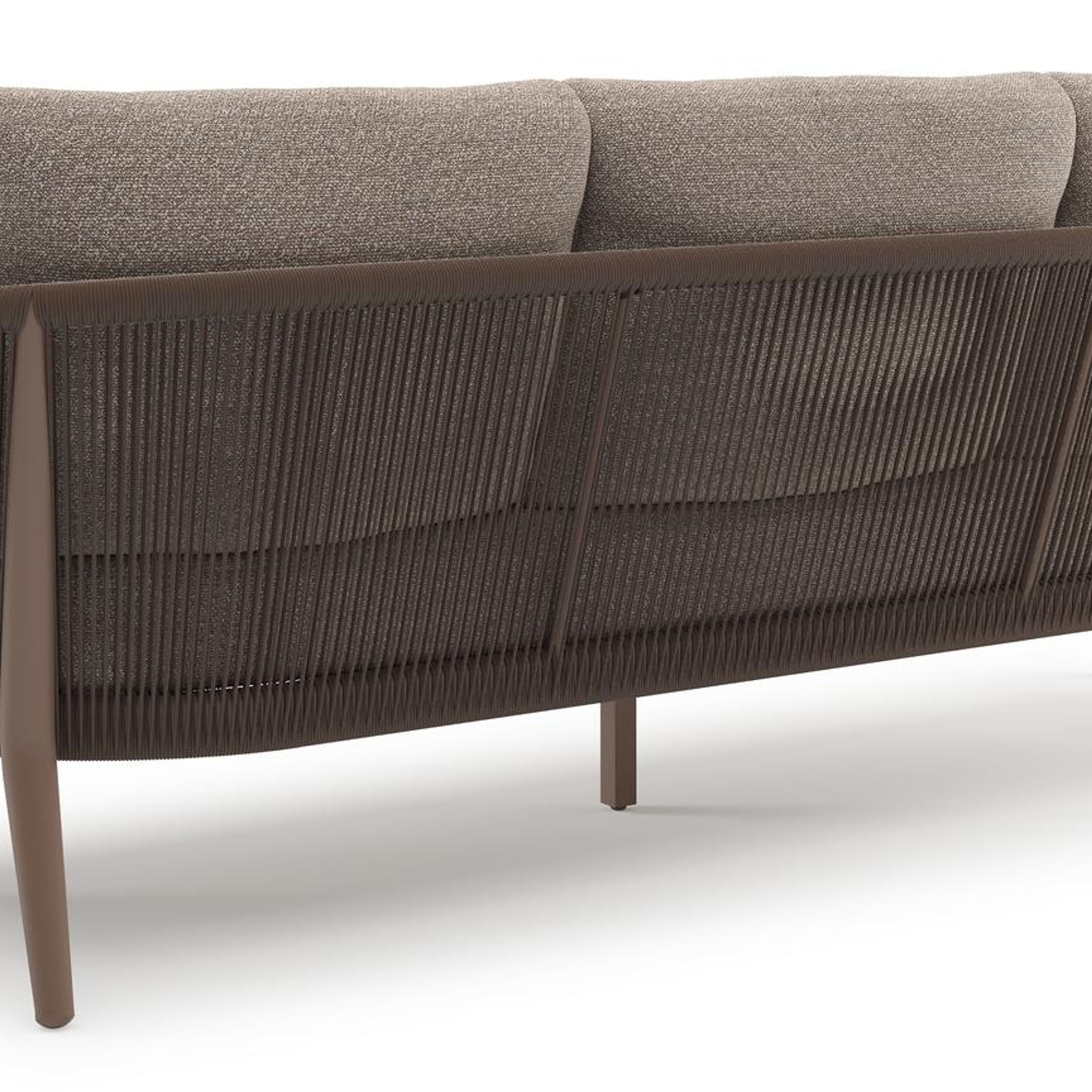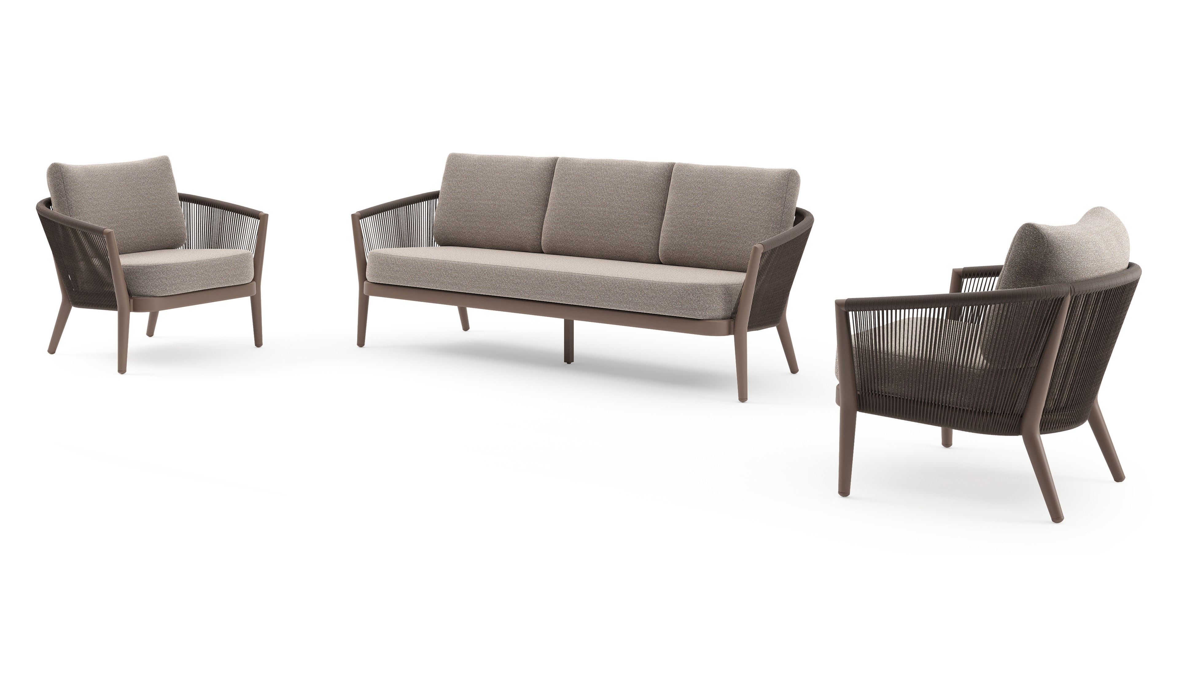 Salon de jardin Orso en aluminium taupe en corde ronde tissée verticalement noir et coussins en all weather sunbrella® luxe Wander Manioc | Exterioo mobilier de jardin