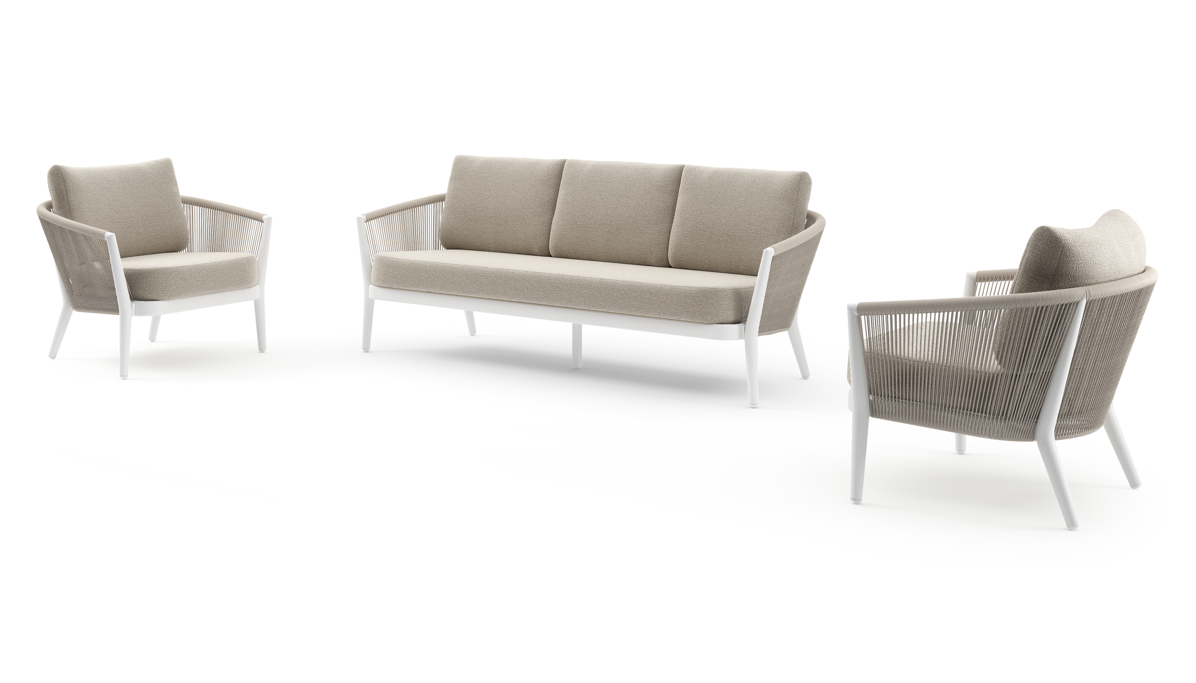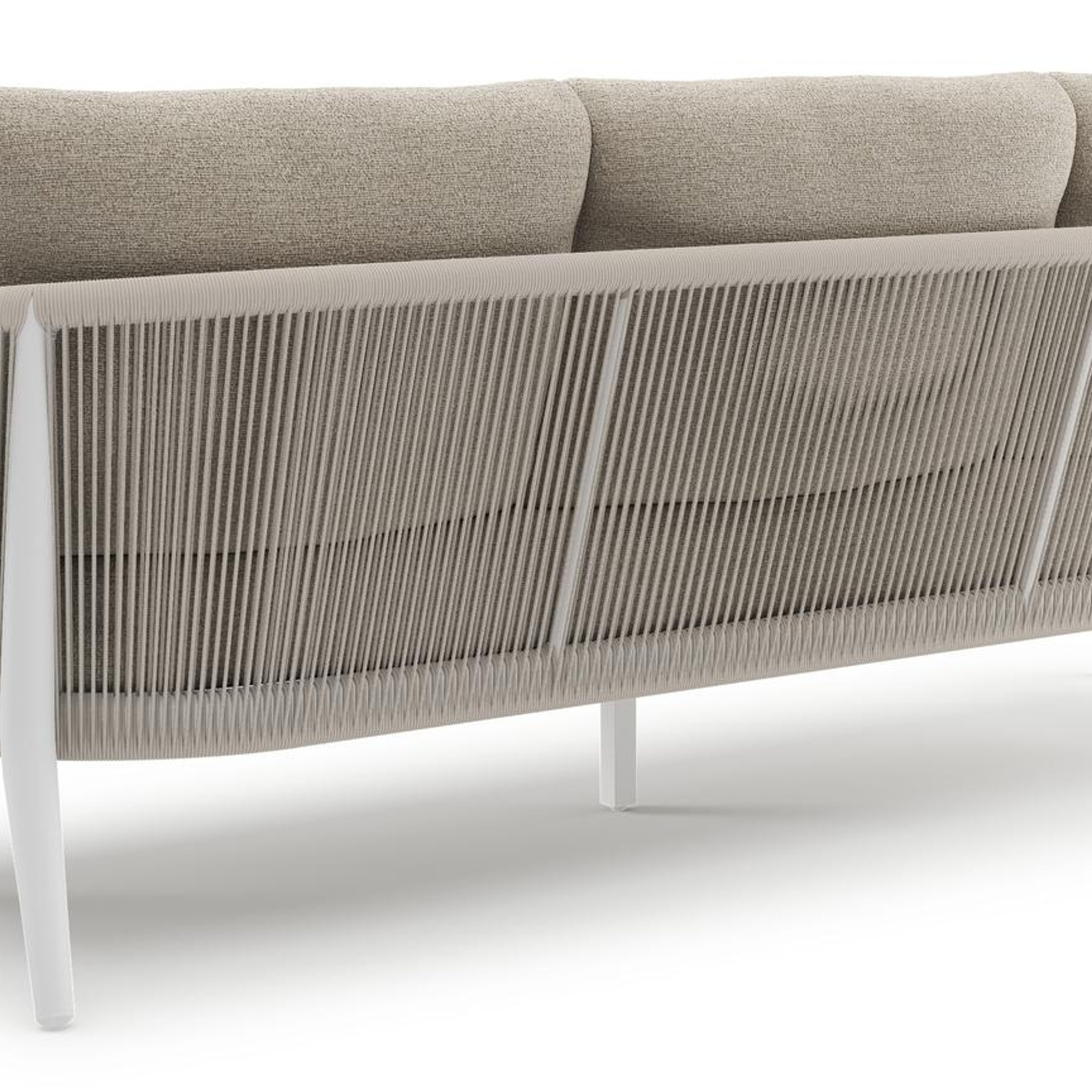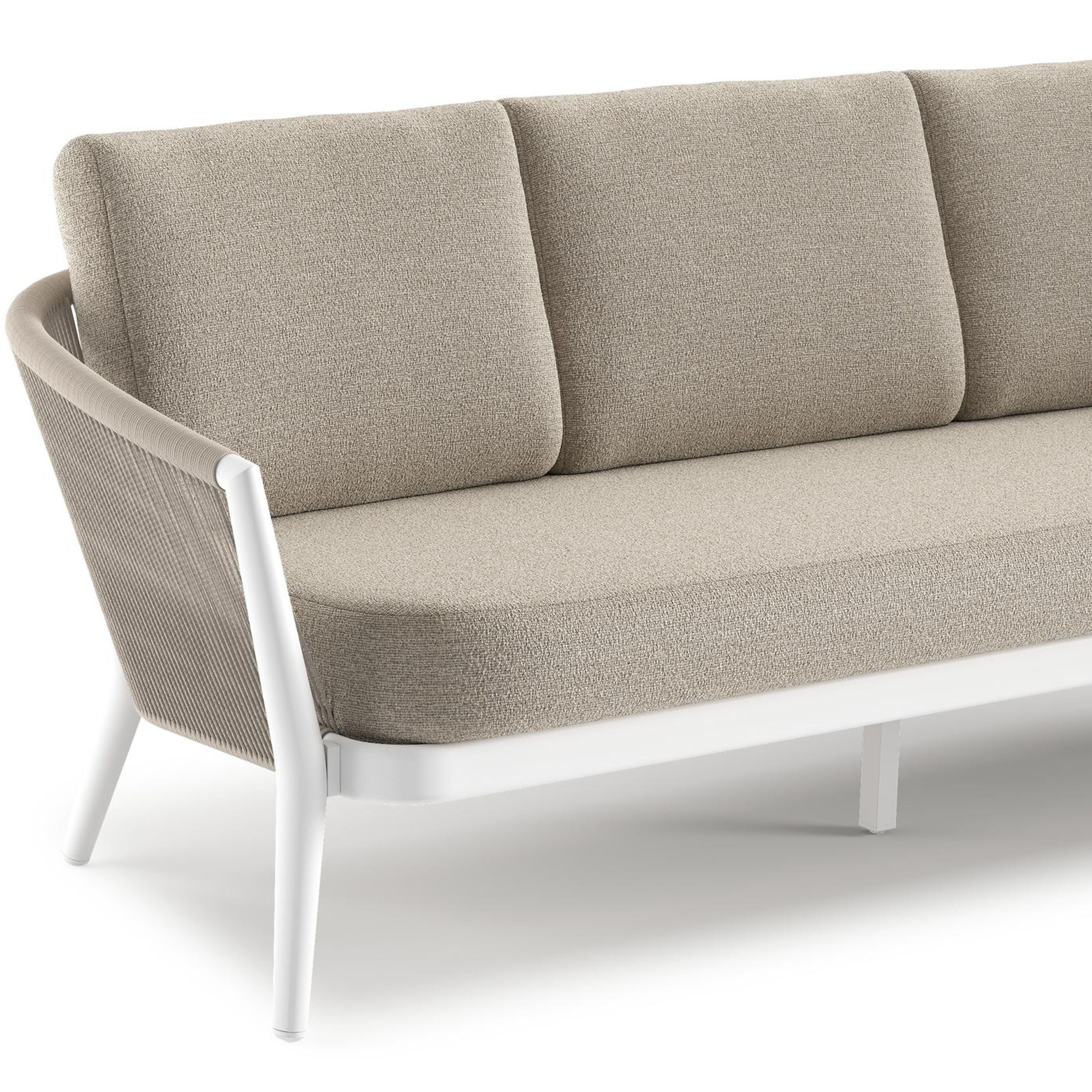 Salon de jardin Orso en aluminium blanc en corde ronde tissée verticalement beige et coussins en all weather cosytica Catania Greige | Exterioo mobilier de jardin