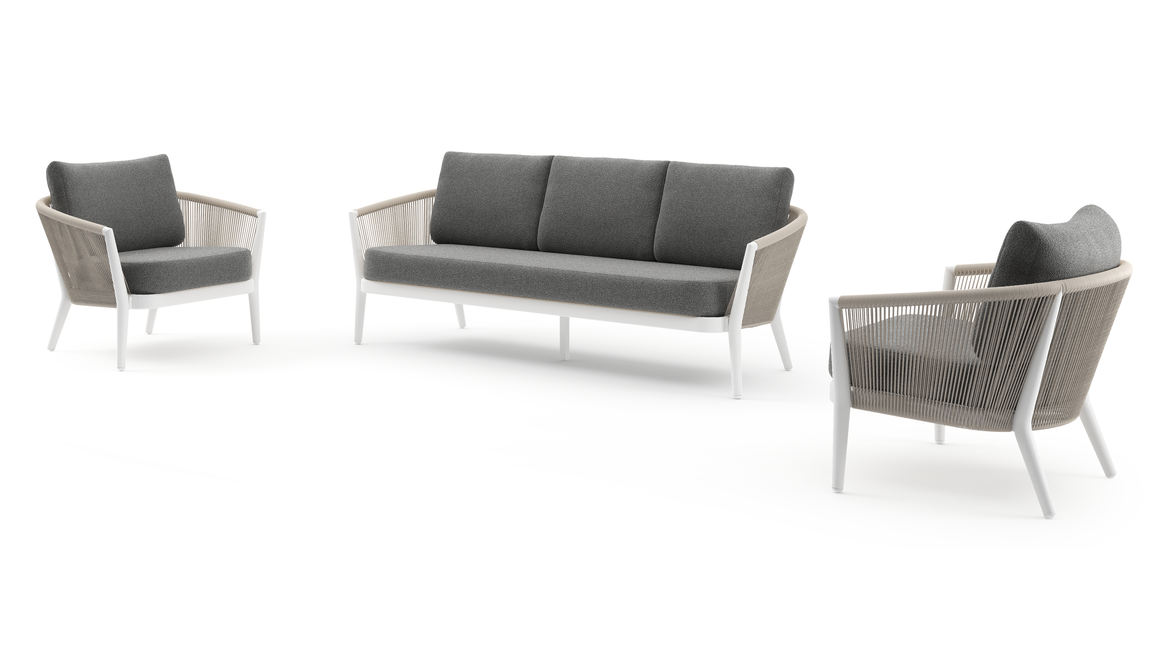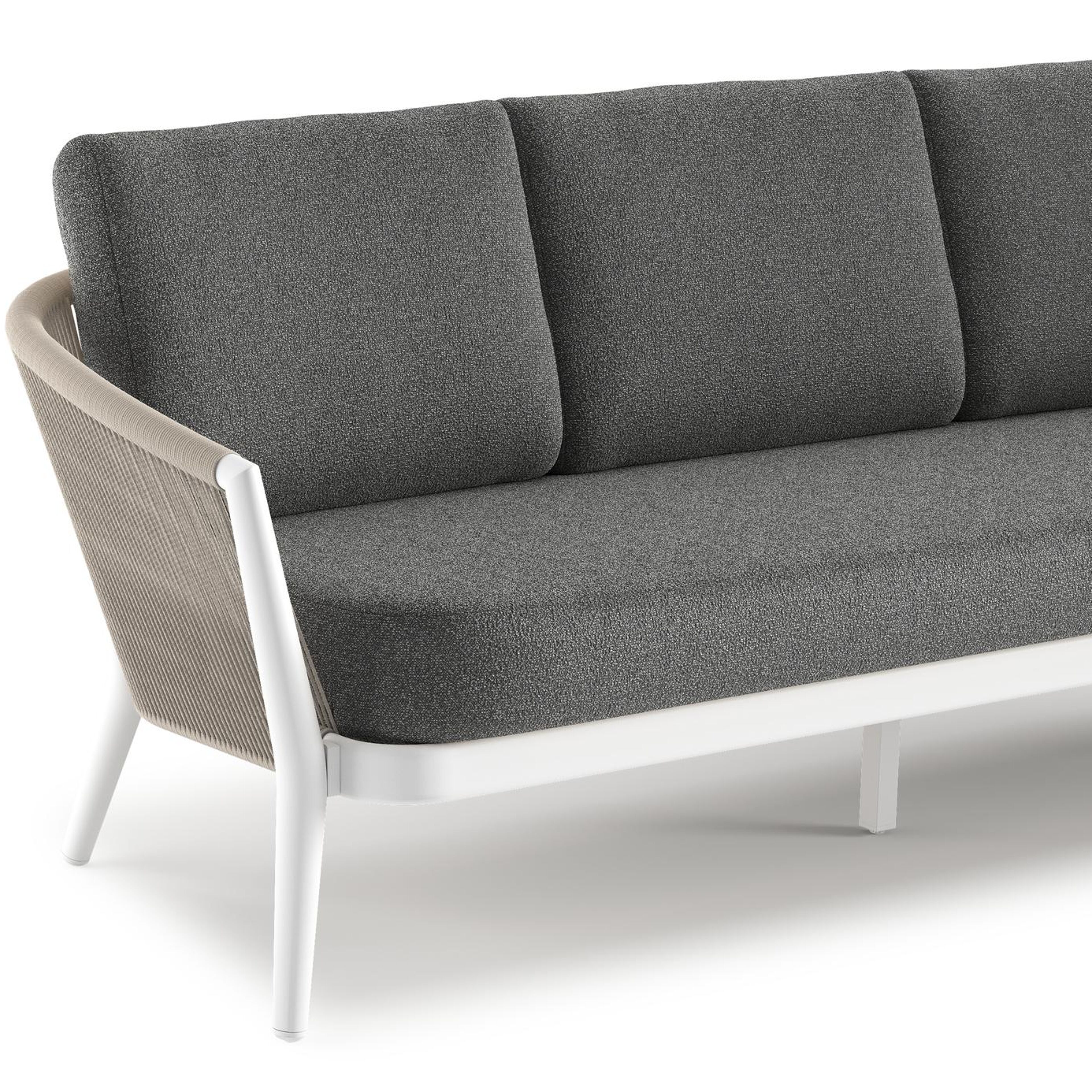 Salon de jardin Orso en aluminium blanc en corde ronde tissée verticalement beige et coussins en all weather cosytica Catania Black | Exterioo mobilier de jardin