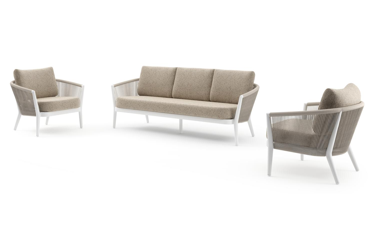 Salon de jardin Orso en aluminium blanc en corde ronde tissée verticalement beige et coussins en all weather cosytica Bora Jungle | Exterioo