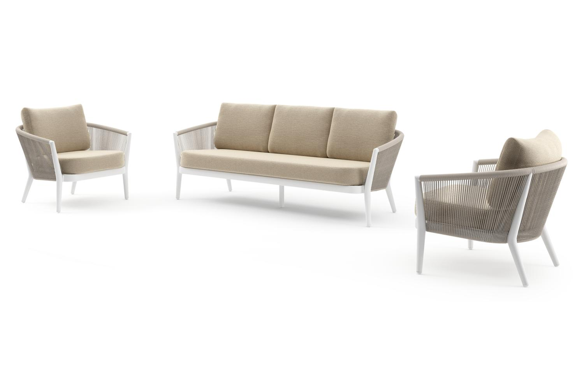 Salon de jardin Orso en aluminium blanc en corde ronde tissée verticalement beige et coussins en all weather cosytica Althea Camel | Exterioo