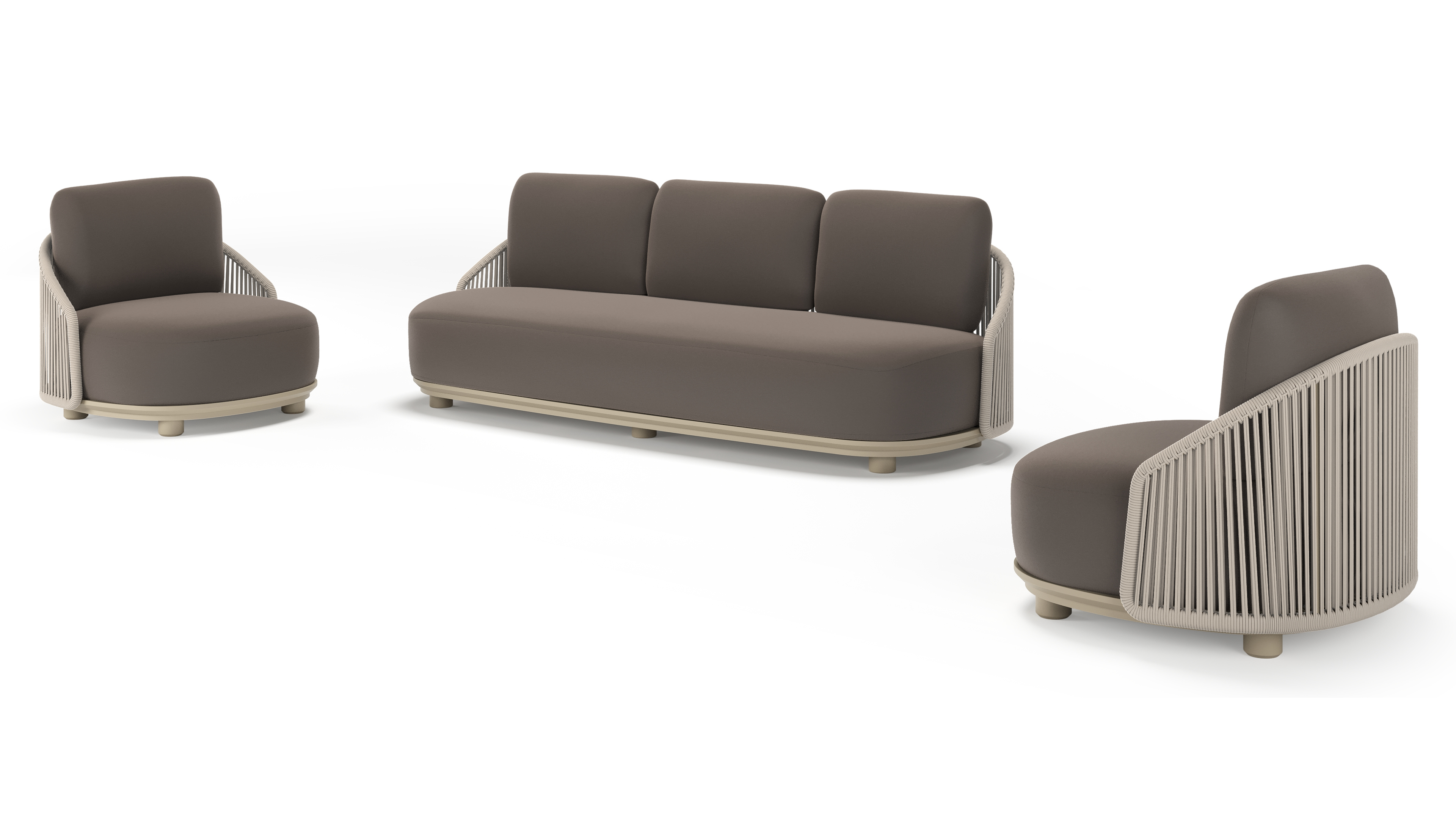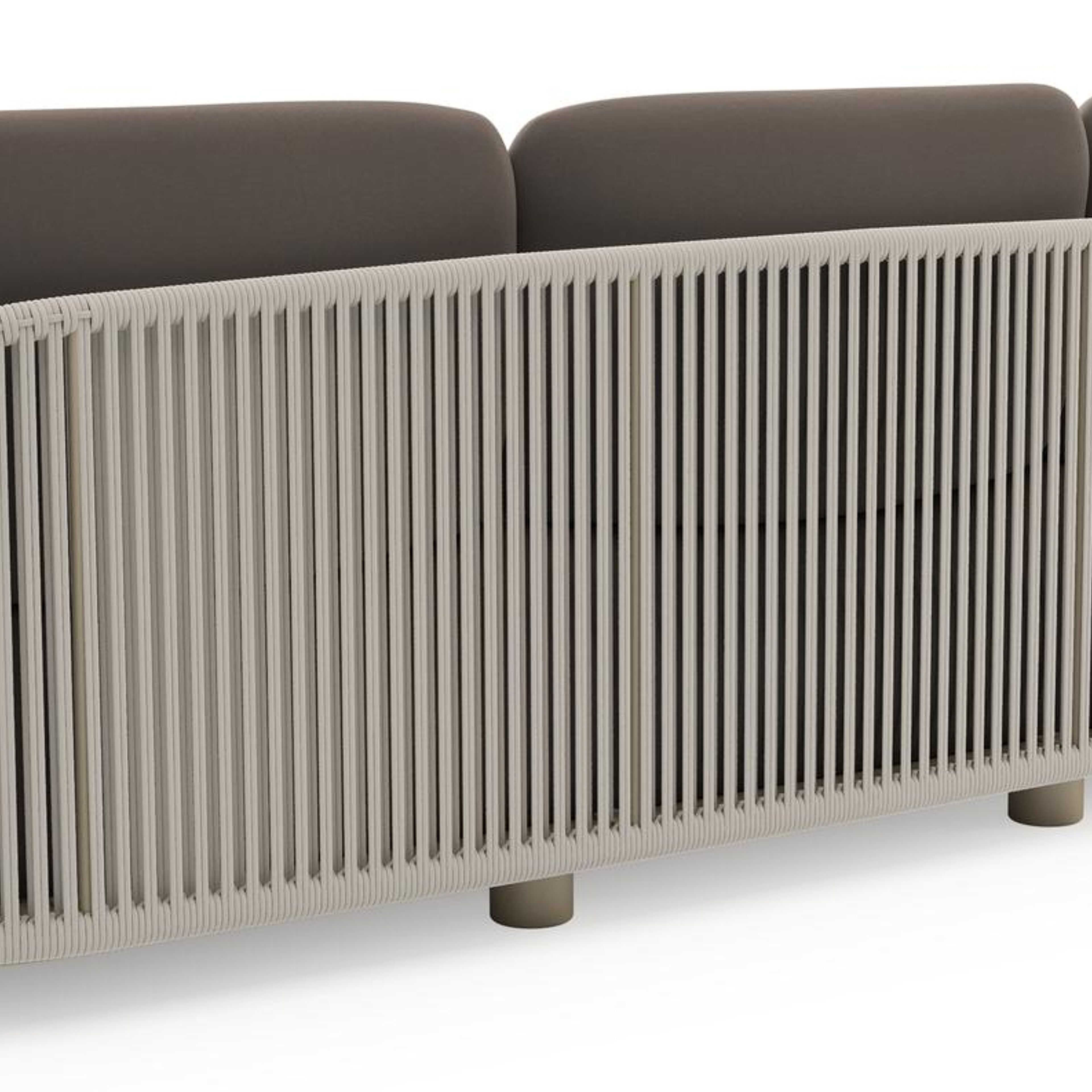 Salon de jardin Vadelo en aluminium beige et corde ronde tissée verticalement beige et coussins en all weather sunbrella® luxe natte nature grey | Exterioo mobilier de jardin