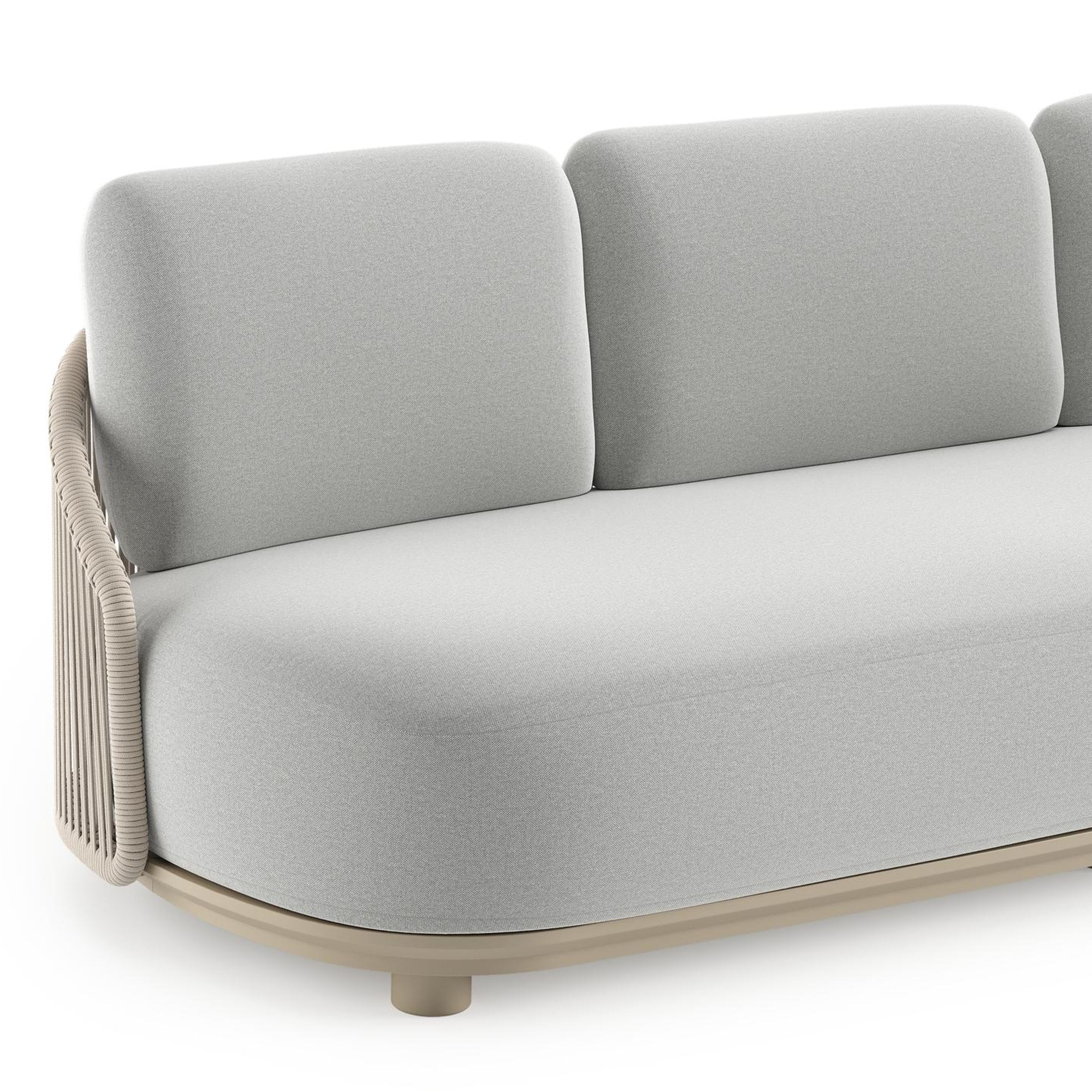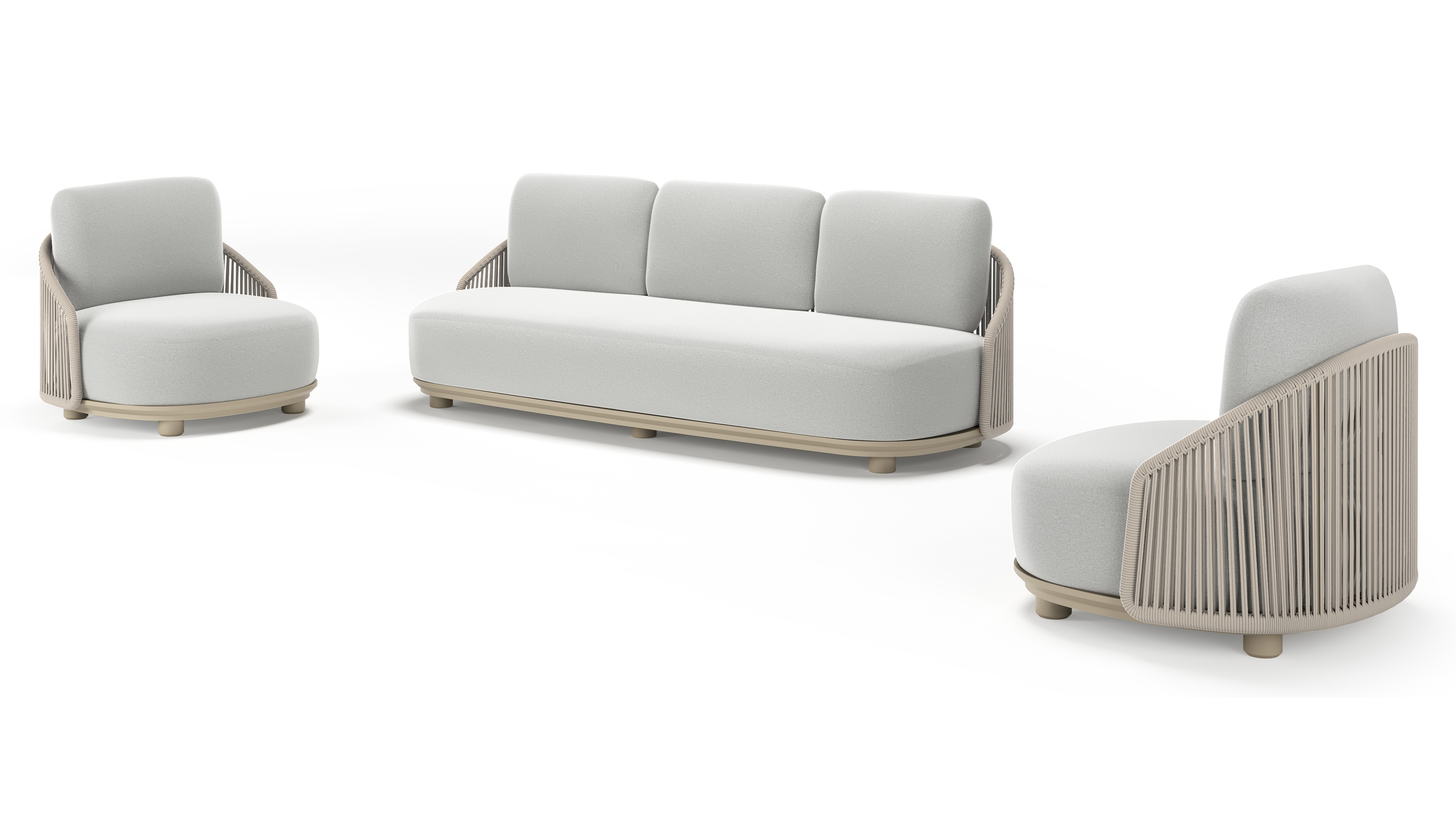 Salon de jardin Vadelo en aluminium beige et corde ronde tissée verticalement beige et coussins en all weather sunbrella® luxe natte grey chine | Exterioo mobilier de jardin