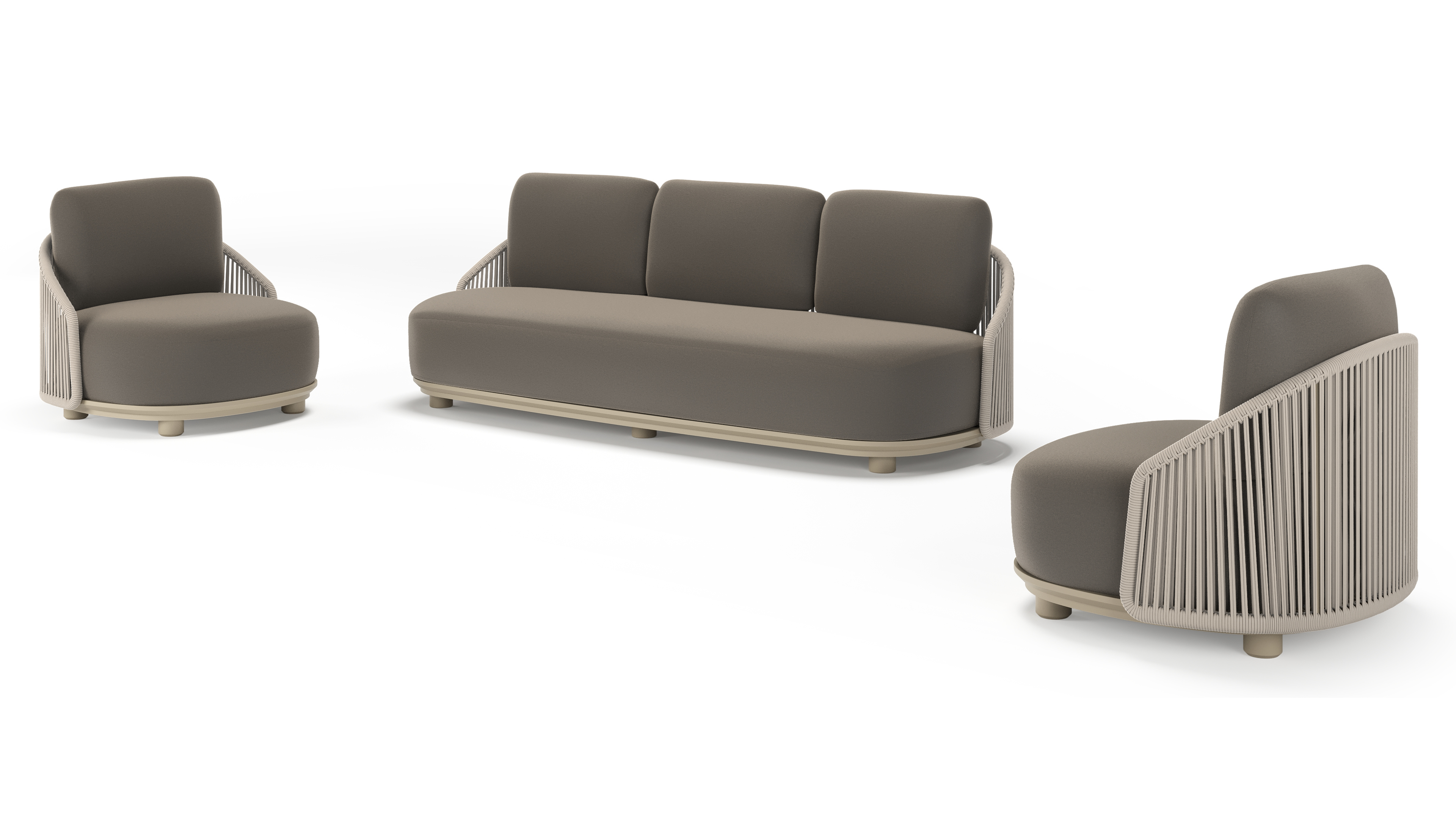 Salon de jardin Vadelo en aluminium beige et corde ronde tissée verticalement beige et coussins en all weather sunbrella® luxe natte carbon beige | Exterioo mobilier de jardin