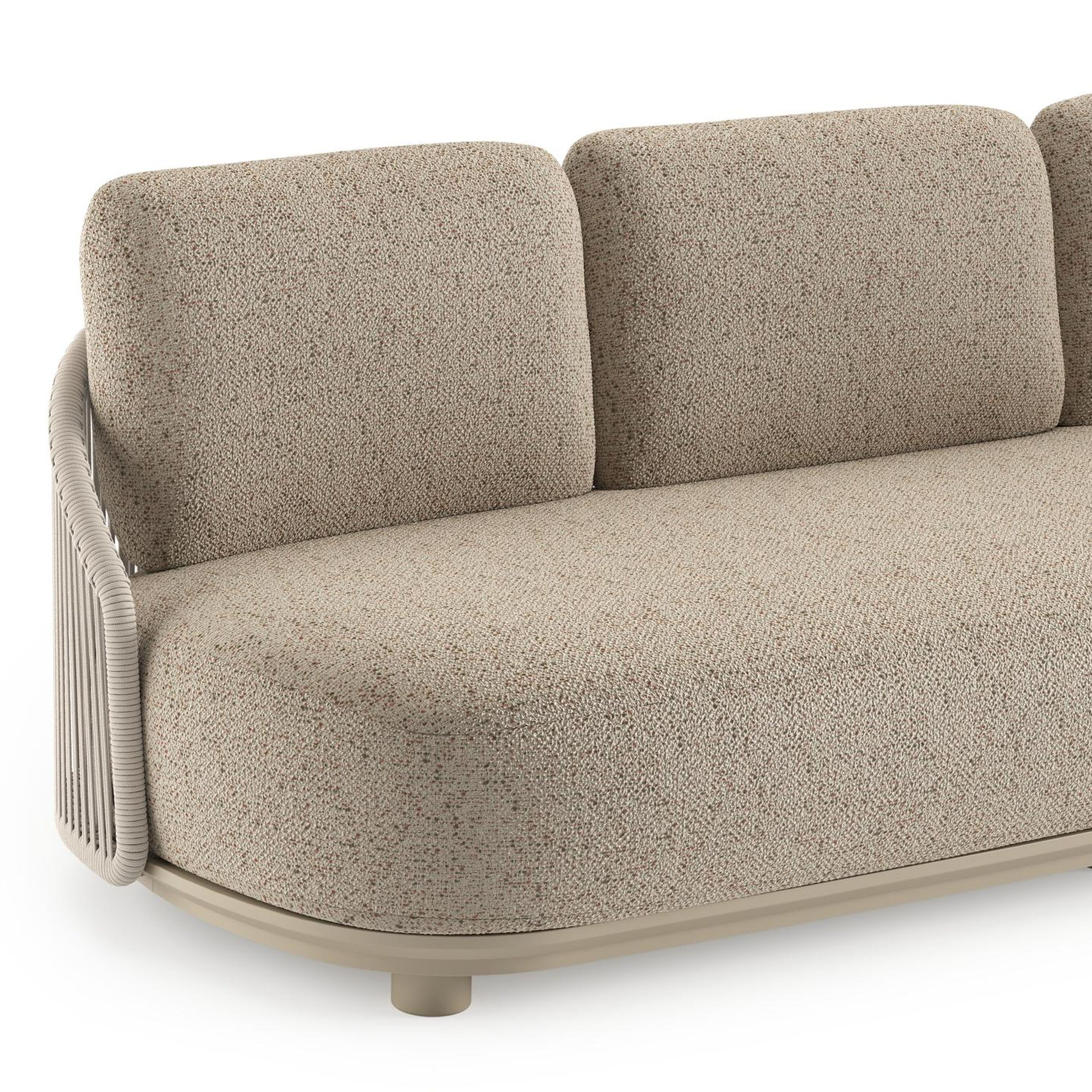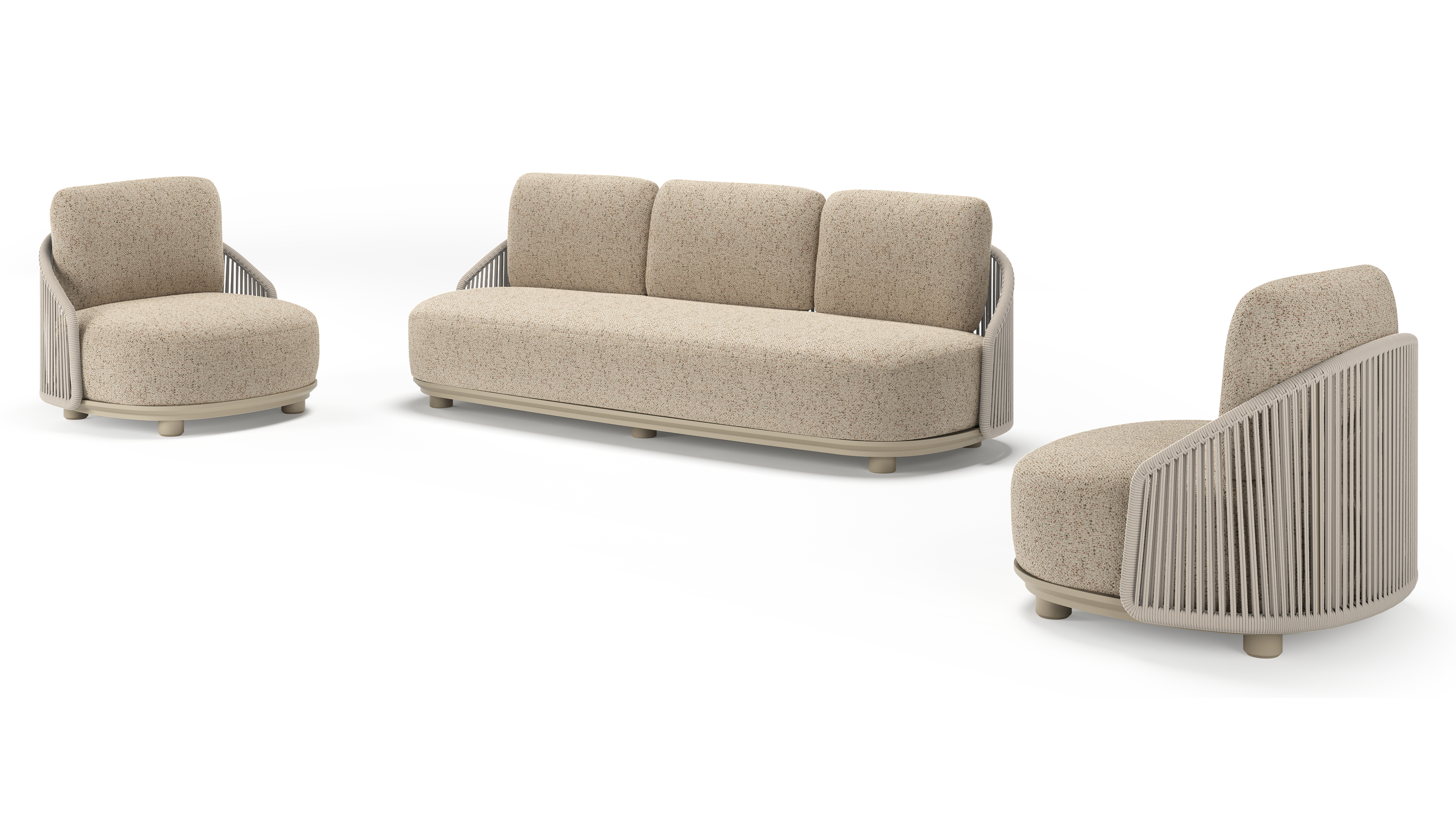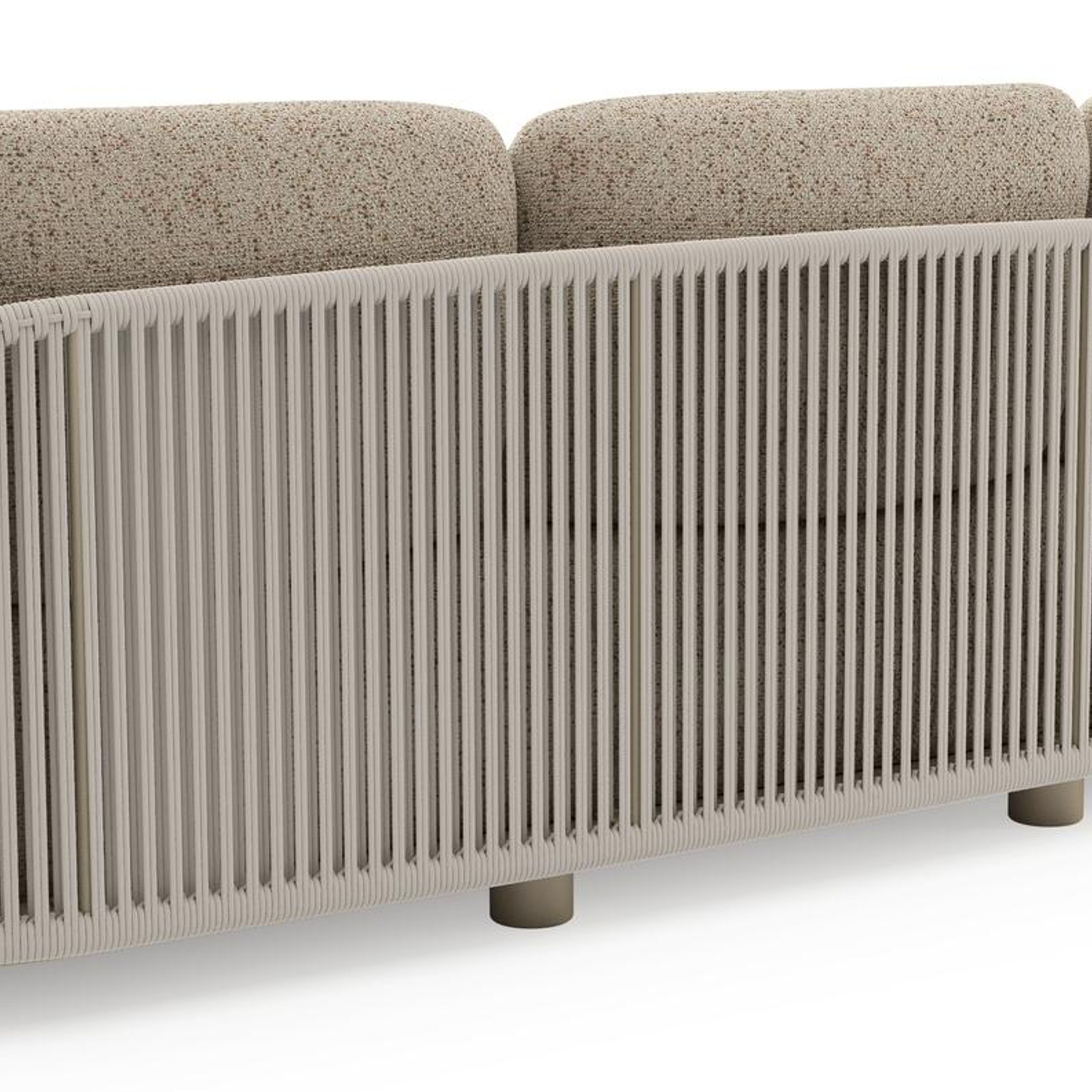 Salon de jardin Vadelo en aluminium beige et corde ronde tissée verticalement beige et coussins en all weather cosytica bora jungle | Exterioo mobilier de jardin