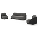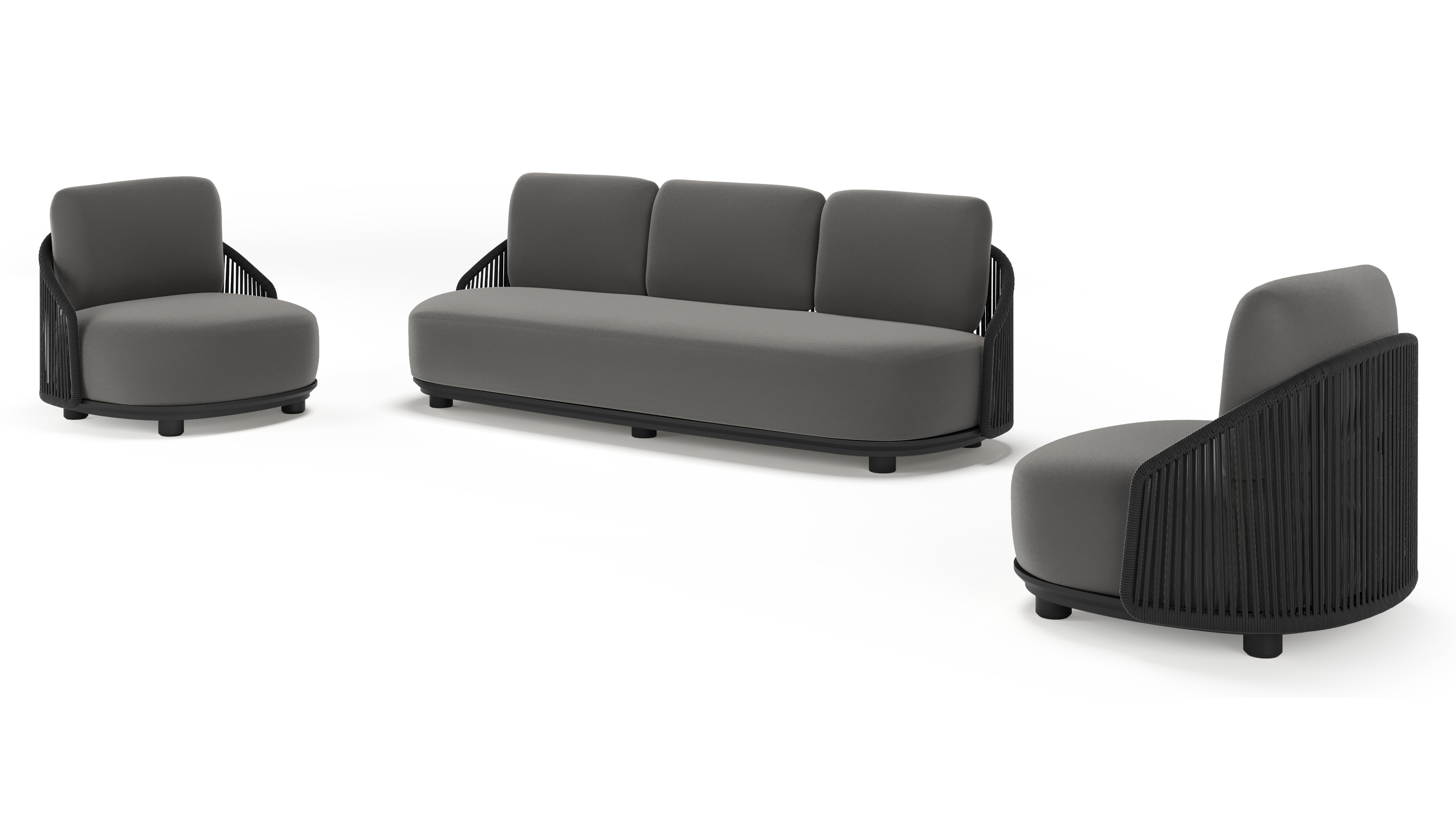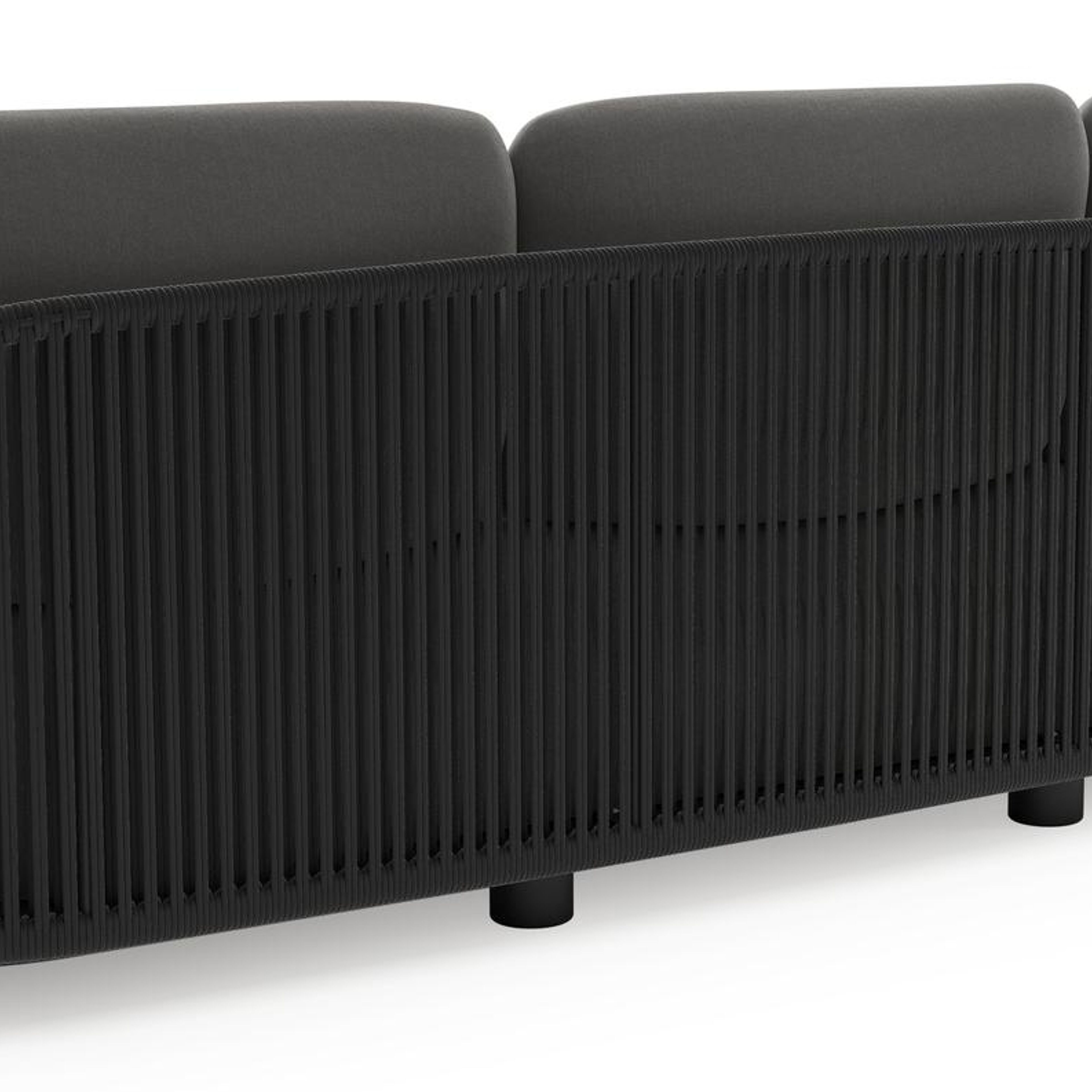 Salon de jardin Vadelo en aluminium noir et corde ronde tissée verticalement noir et coussins en all weather sunbrella® luxe natte charcoal chine | Exterioo mobilier de jardin