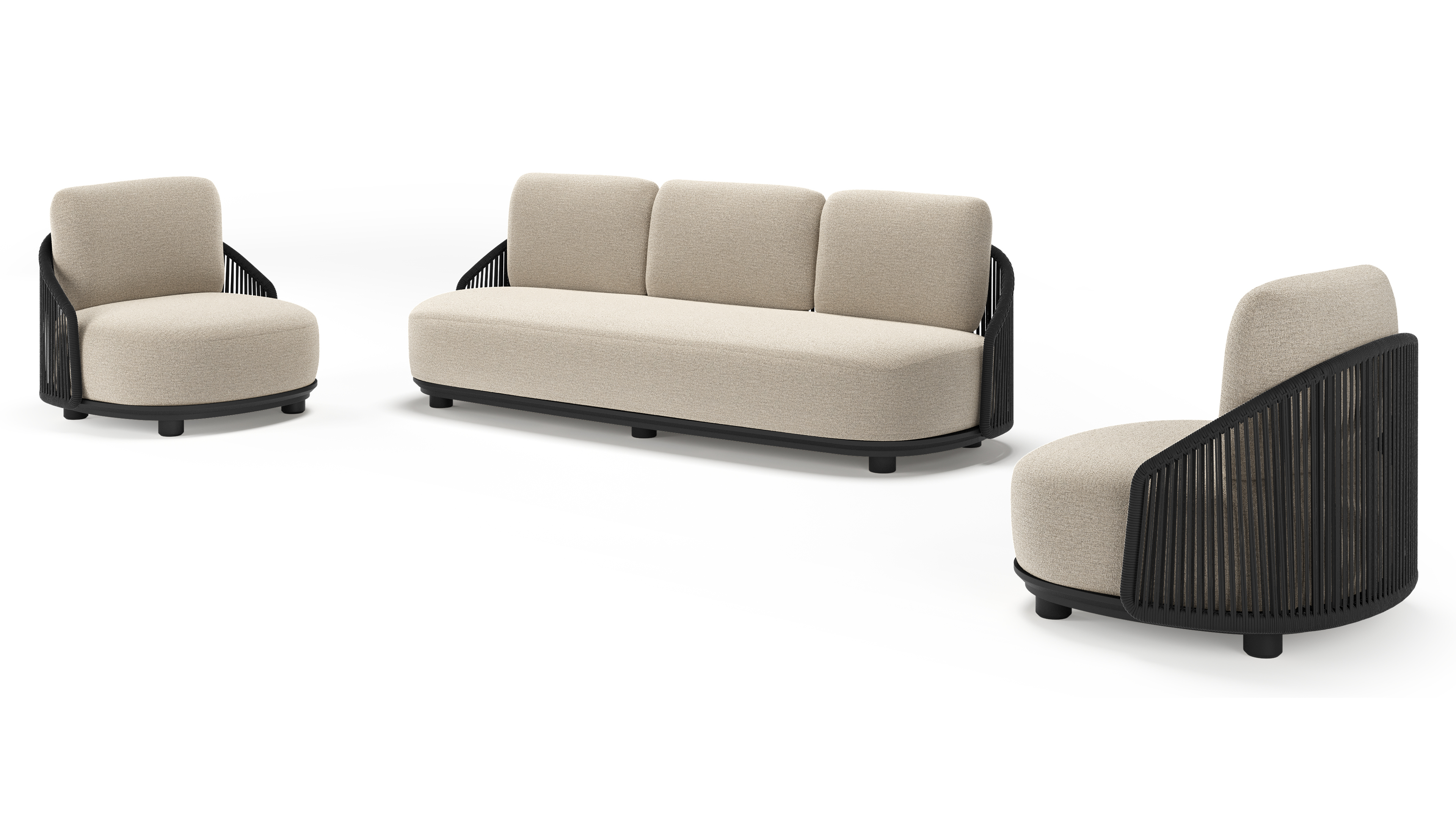Salon de jardin Vadelo en aluminium noir et corde ronde tissée verticalement noir et coussins en all weather cosytica catania greige | Exterioo mobilier de jardin