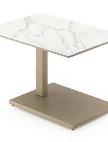 Table d'appoint pop-up Cirello rectangulaire en aluminium beige et céramique pleine Calacatta - Lg. 69.5 x Lrg. 50 x Haut. 66 cm | Exterioo