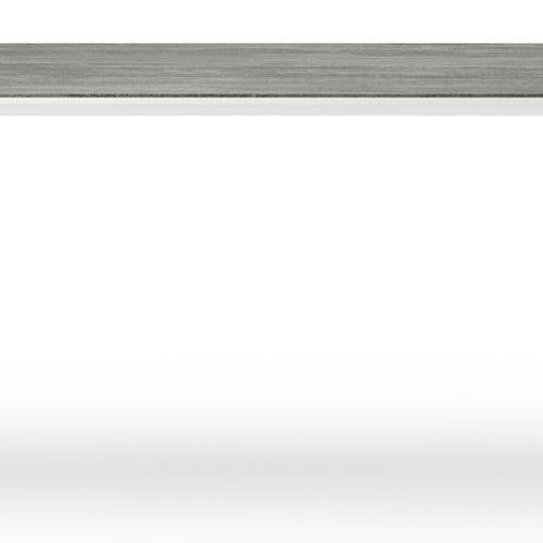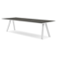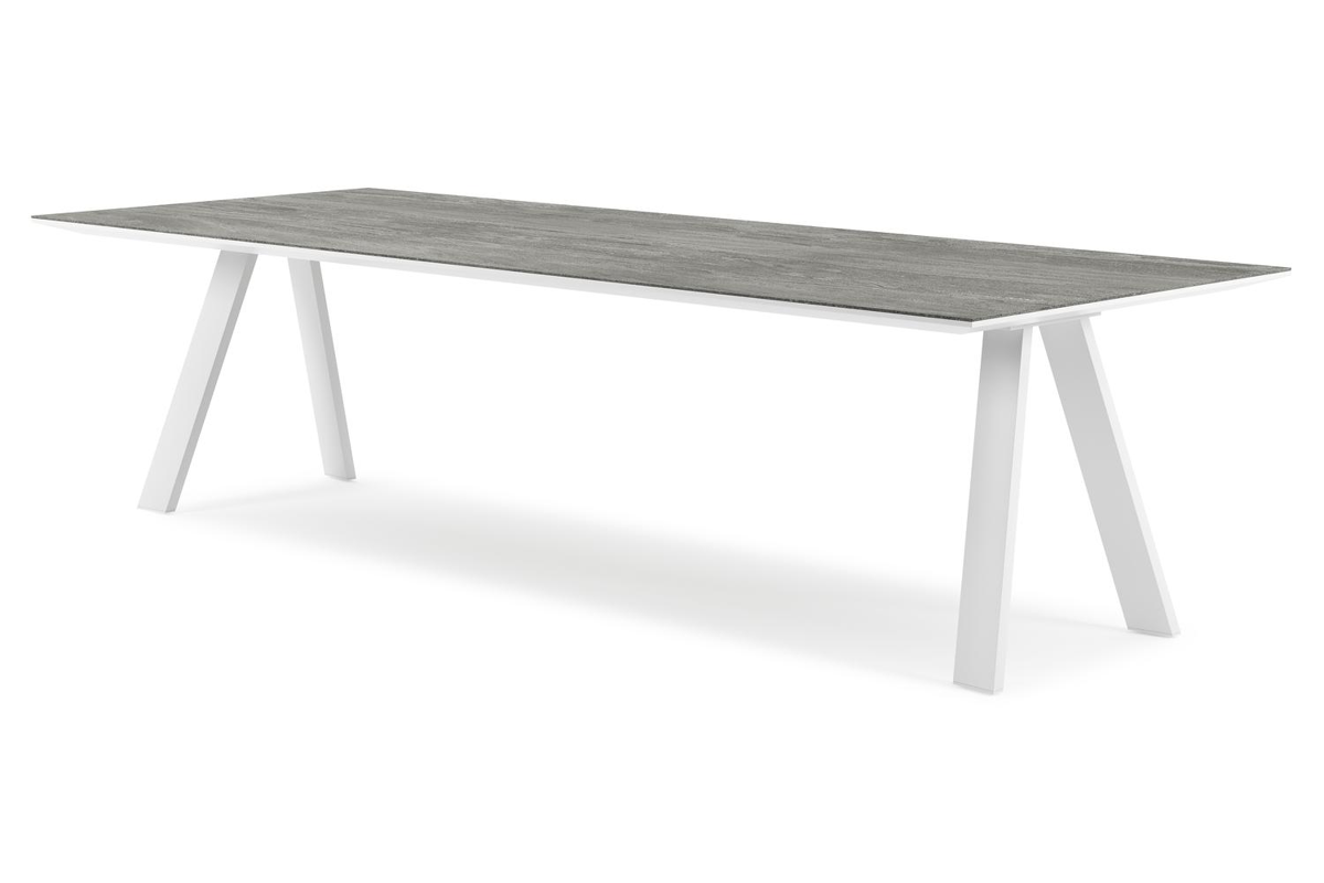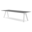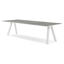 Armature Cesano en aluminium, blanche, combinée avec un plateau de table en céramique (aspen grey). Épaisseur du plateau de table : 6 mm. L 280 x Larg. 110 cm.
