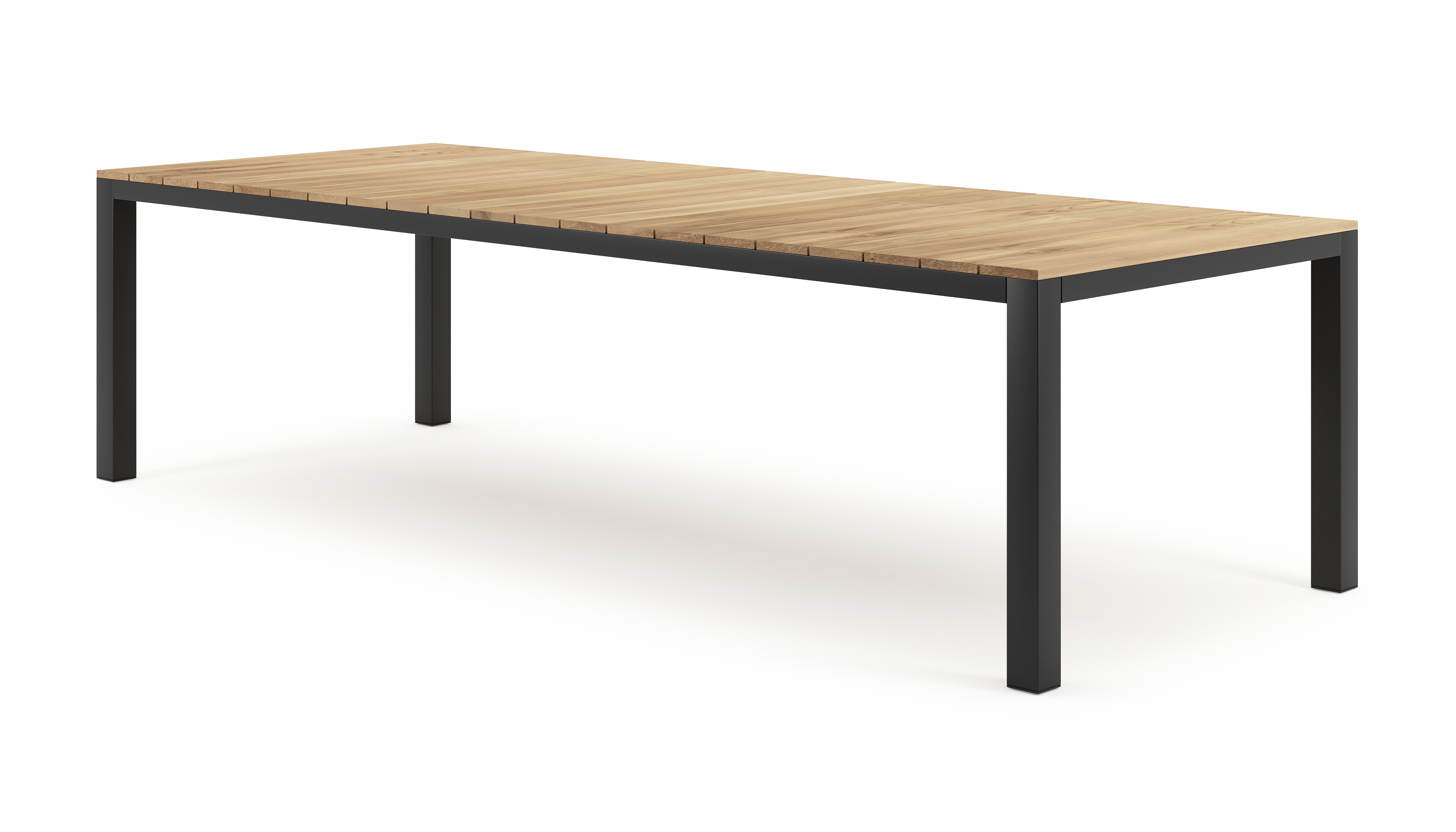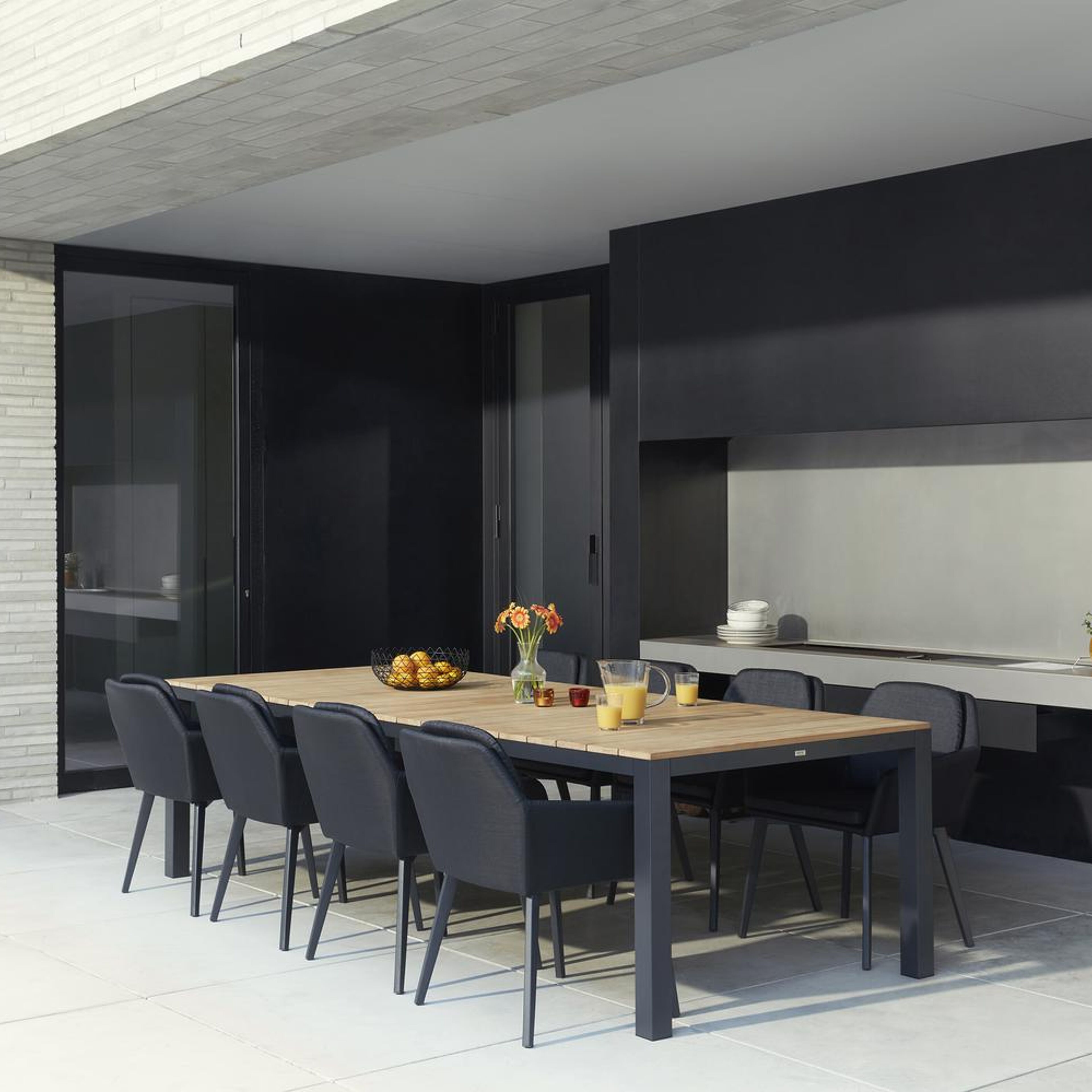 La table de jardin Como présente un design robuste et minimaliste grâce à ses pieds en forme de blocs et par l'alignement sobre de l'armature. Ce caractère contemporain donne à la table une touche de modernité.