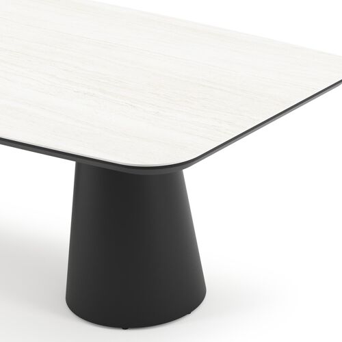 La table de jardin Donato allie l'élégance extérieure à des formes robustes et ludiques. Avec un pied conique entièrement en aluminium et un plateau arrondi, cette table crée une fusion harmonieuse entre un design contemporain et un aspect robuste.