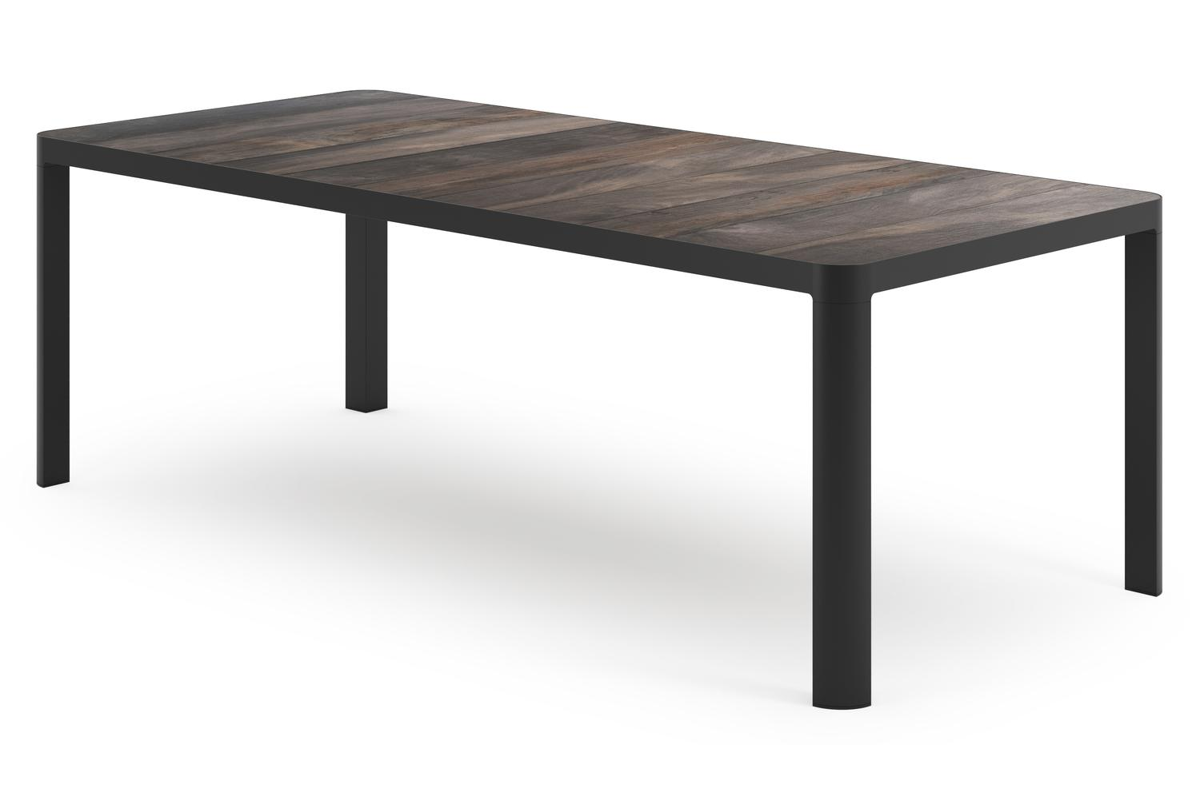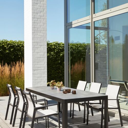 L’armature de la table est en aluminium inoxydable, un matériau robuste mais léger, qui est facile à déplacer. La surface présente une finition lisse, de sorte qu’elle n’attire pas la saleté et est facile à entretenir. Le revêtement poudré garantit la résistance aux UV et aux intempéries de votre meuble.