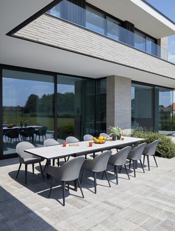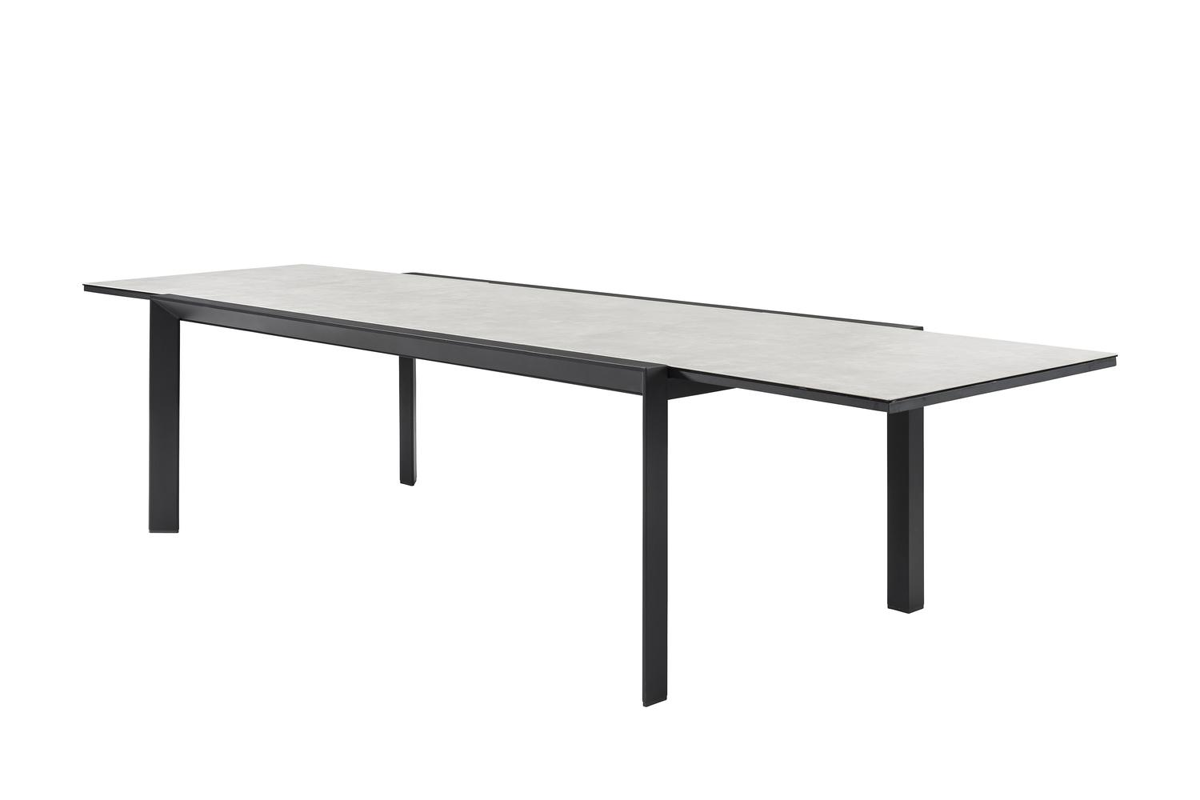 Table extensible rectangulaire avec armature aluminium noir mat trapézoïde et plateau de table céramique. Couleur plateau : gris clair moiré. Le plateau est en verre de 5 mm d'épaisseur et couche supérieure céramique de 3 mm d'épaisseur. Extensible de 220 à 340 cm au moyen d'1 allonge tilt-up de 120 cm. L'allonge est rangée sous le plateau de table. Totale Epaisseur plateau : 8 mm. Piètement : 7 x 7 x 8,5 cm. Dimension totale : L 220/340 x Lg 106 x H 76 cm.
