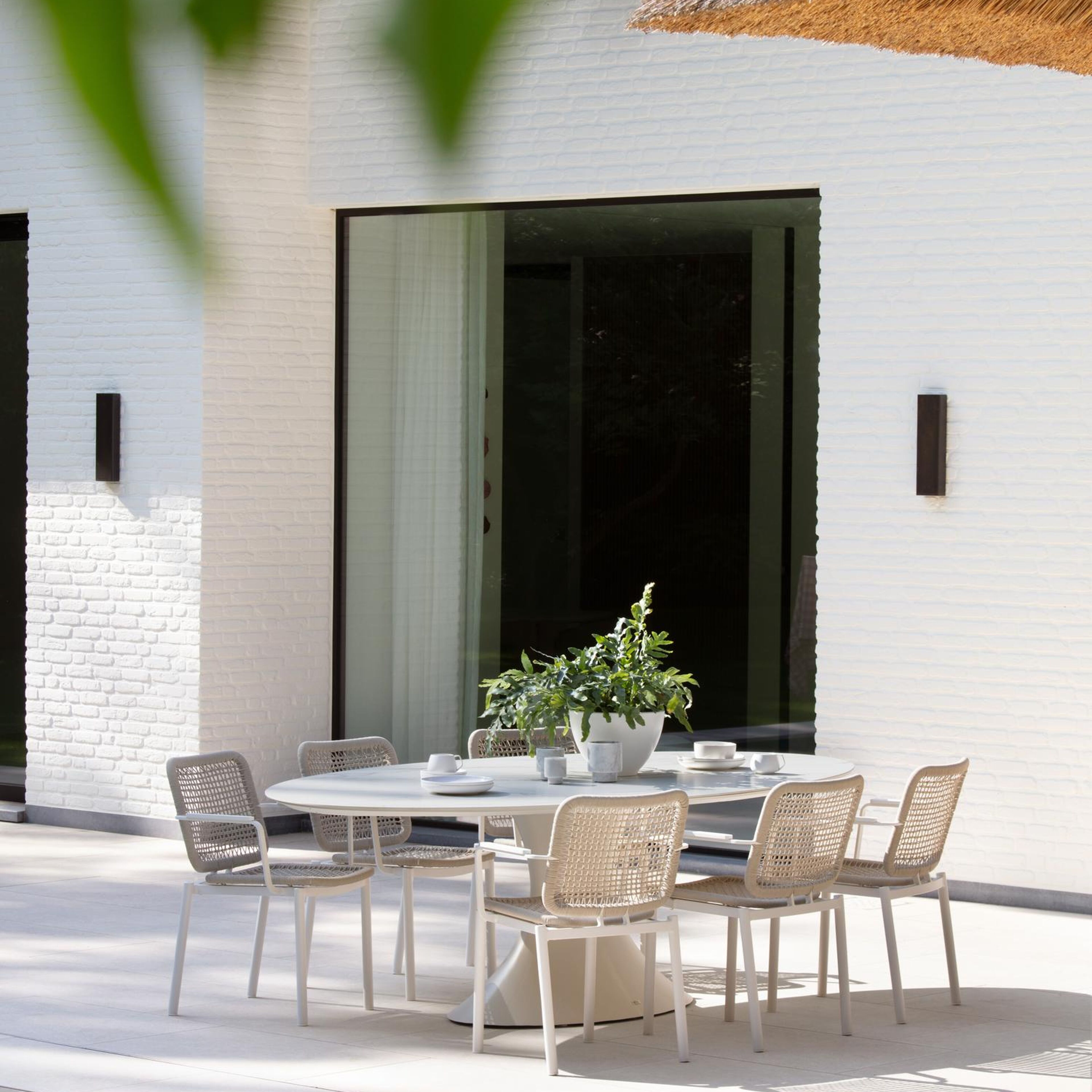 L’armature de la table est en aluminium inoxydable, un matériau robuste mais léger, qui est facile à déplacer. La surface présente une finition lisse, de sorte qu’elle n’attire pas la saleté et est facile à entretenir. Le revêtement poudré garantit la résistance aux UV et aux intempéries de votre meuble.