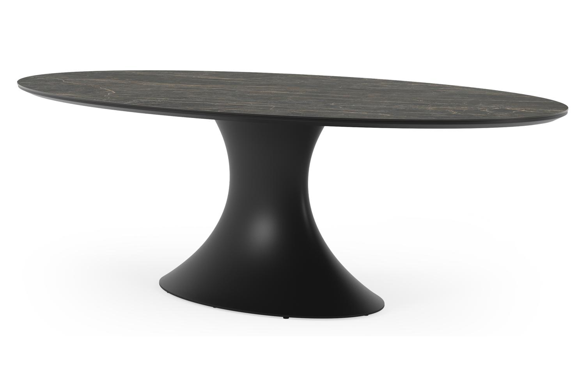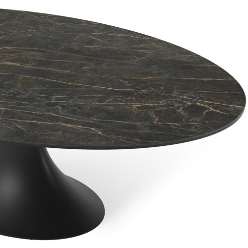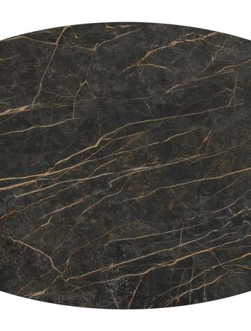 La table Fano ovale est dotée d’un élégant pied central caractéristique. L’armature est en aluminium, un matériau léger mais robuste et inoxydable qui convient très bien aux meubles de jardin. Cette table est dotée d’un plateau Black Obsession. Un véritable accroche-regard pour ceux qui aiment quelque chose de plus luxueux. La surface du plateau est noire et des veines jaunes or créent un superbe effet de marbre. L’avantage des plateaux de table en céramique pleine est qu’ils résistent aux rayures ainsi qu’à toutes les conditions météorologiques.