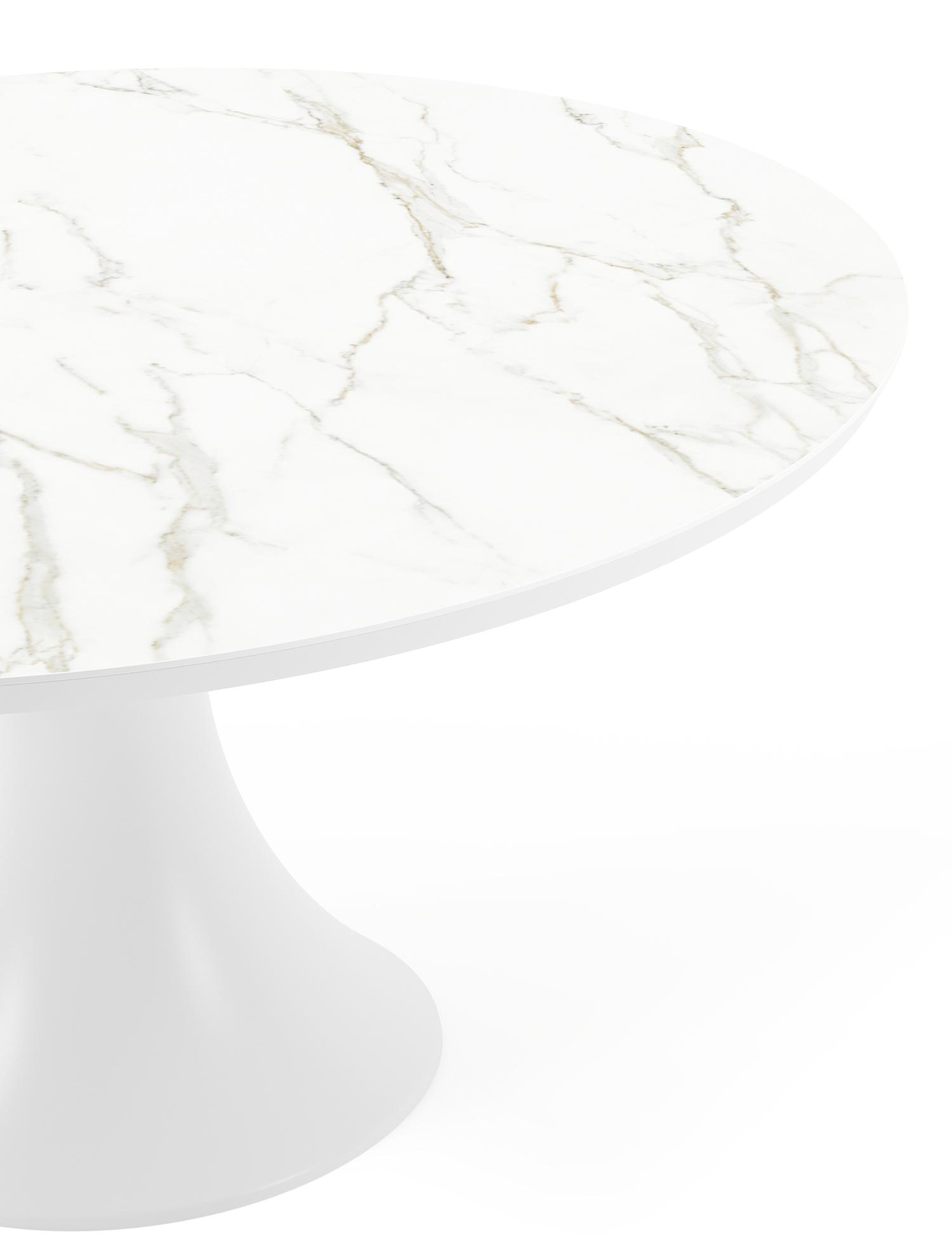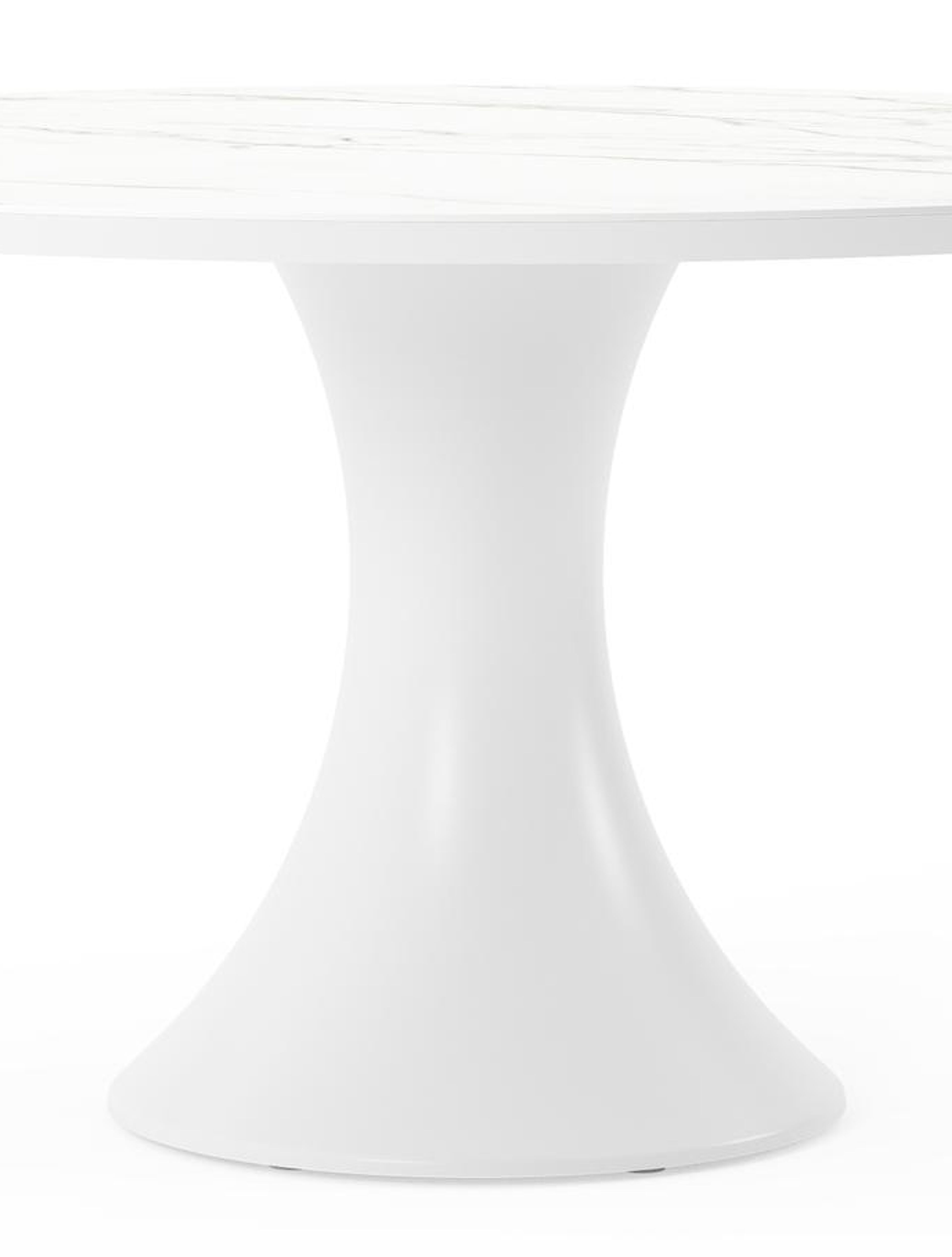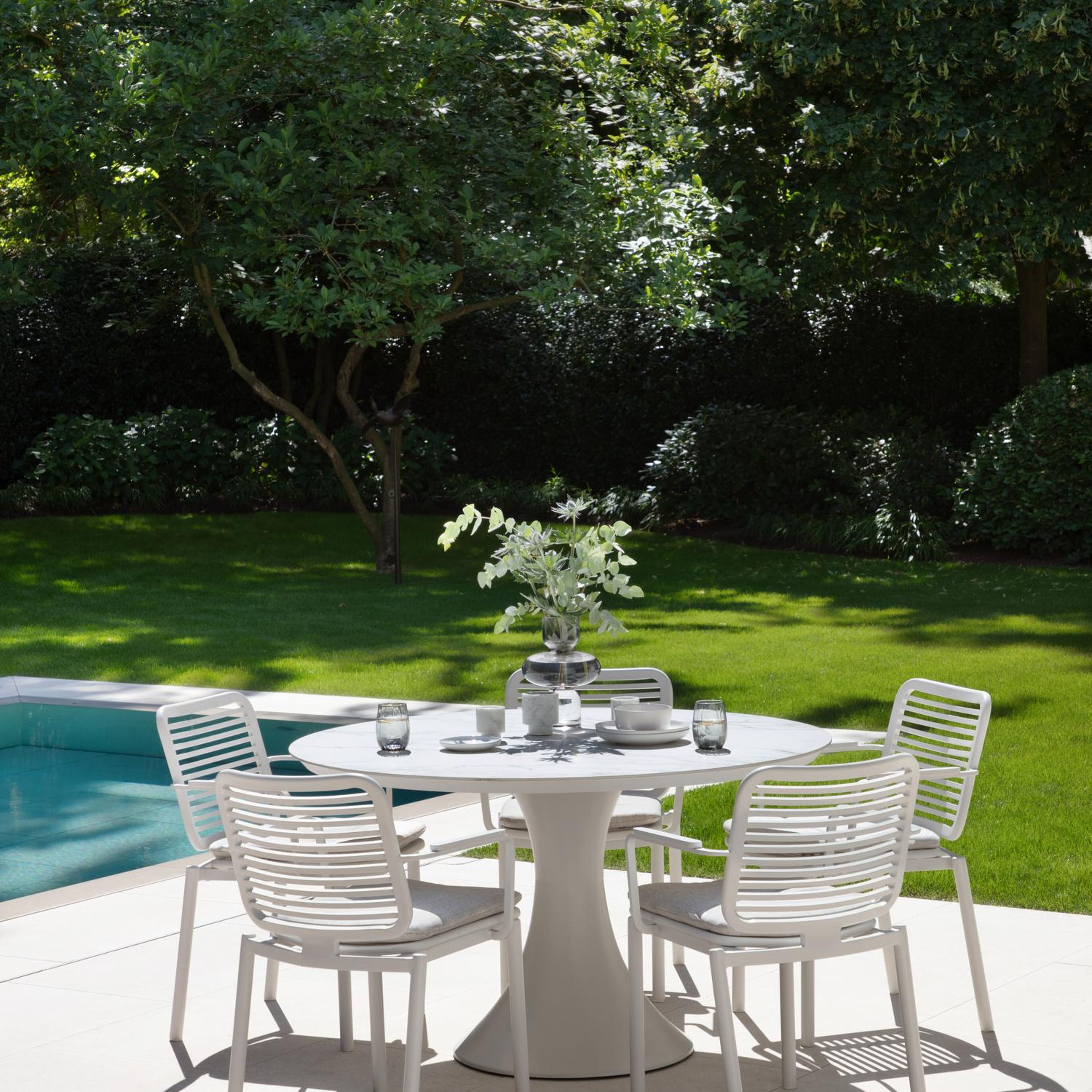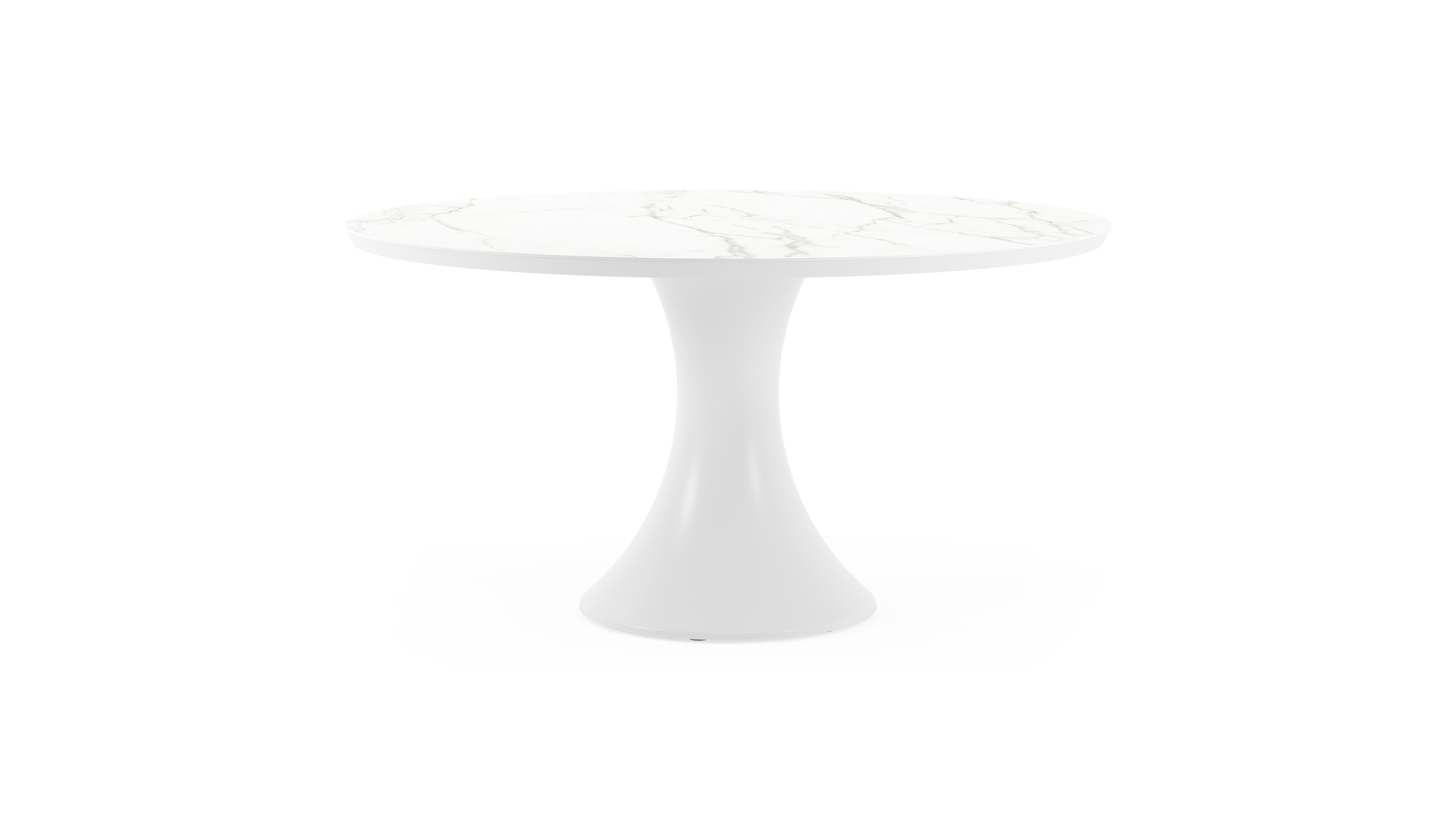 La table Fano ronde est un modèle tendance avec son pied en trompette caractéristique. De plus, vous passerez toujours un moment convivial à une table ronde, car tout le monde se voit. L’armature est en aluminium, un matériau léger mais robuste et inoxydable qui convient très bien aux meubles de jardin. Cette table est dotée d’un plateau Calacatta. La base du plateau est blanche et des veines grises créent un superbe effet de marbre. L’avantage des plateaux de table en céramique pleine est qu’ils résistent aux rayures ainsi qu’à toutes les conditions météorologiques.
