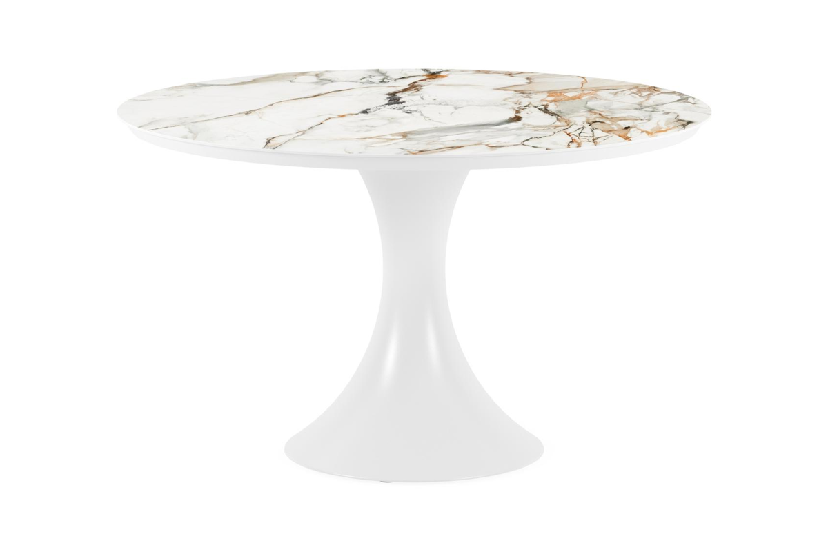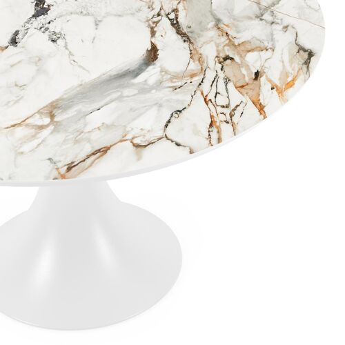 La table Fano ronde est un modèle tendance avec son pied en trompette caractéristique. De plus, vous passerez toujours un moment convivial à une table ronde, car tout le monde se voit. L’armature est en aluminium, un matériau léger mais robuste et inoxydable qui convient très bien aux meubles de jardin. Cette table est dotée d’un plateau Calacatta Luxe. Il s’agit d’un véritable accroche-regard à l’aspect luxueux. La base du plateau est blanche et des veines grises et jaunes or créent un superbe effet de marbre. L’avantage des plateaux de table en céramique pleine est qu’ils résistent aux rayures ainsi qu’à toutes les conditions météorologiques.