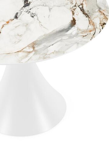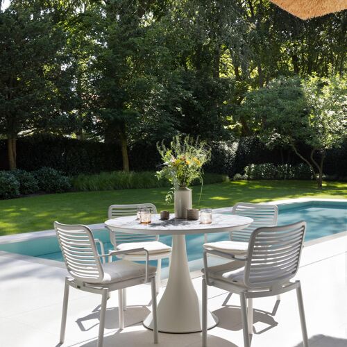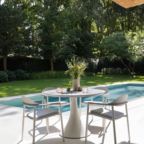 La table Fano ronde est un modèle tendance avec son pied en trompette caractéristique. De plus, vous passerez toujours un moment convivial à une table ronde, car tout le monde se voit. L’armature est en aluminium, un matériau léger mais robuste et inoxydable qui convient très bien aux meubles de jardin. Cette table est dotée d’un plateau Calacatta Luxe. Il s’agit d’un véritable accroche-regard à l’aspect luxueux. La base du plateau est blanche et des veines grises et jaunes or créent un superbe effet de marbre. L’avantage des plateaux de table en céramique pleine est qu’ils résistent aux rayures ainsi qu’à toutes les conditions météorologiques.