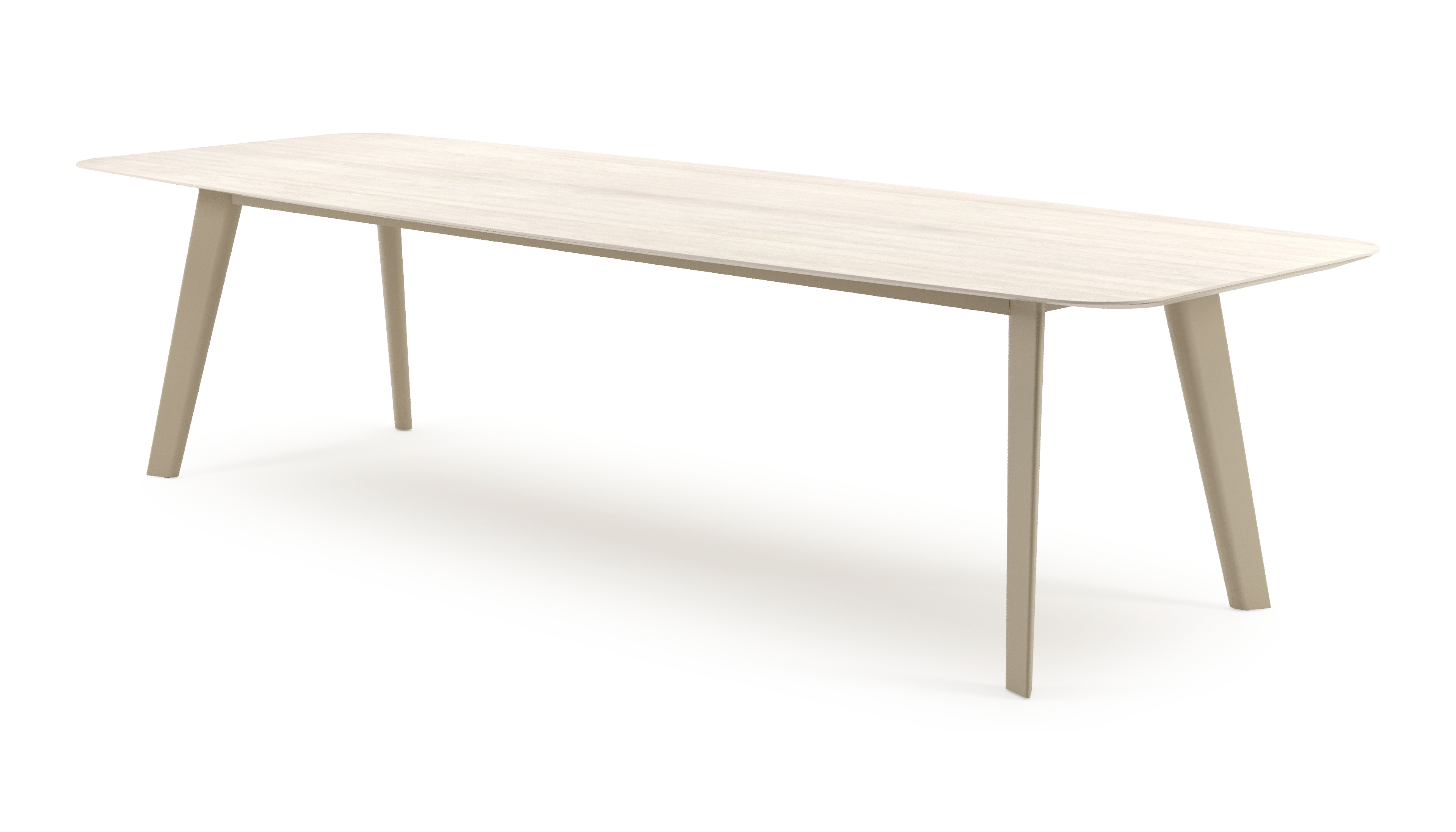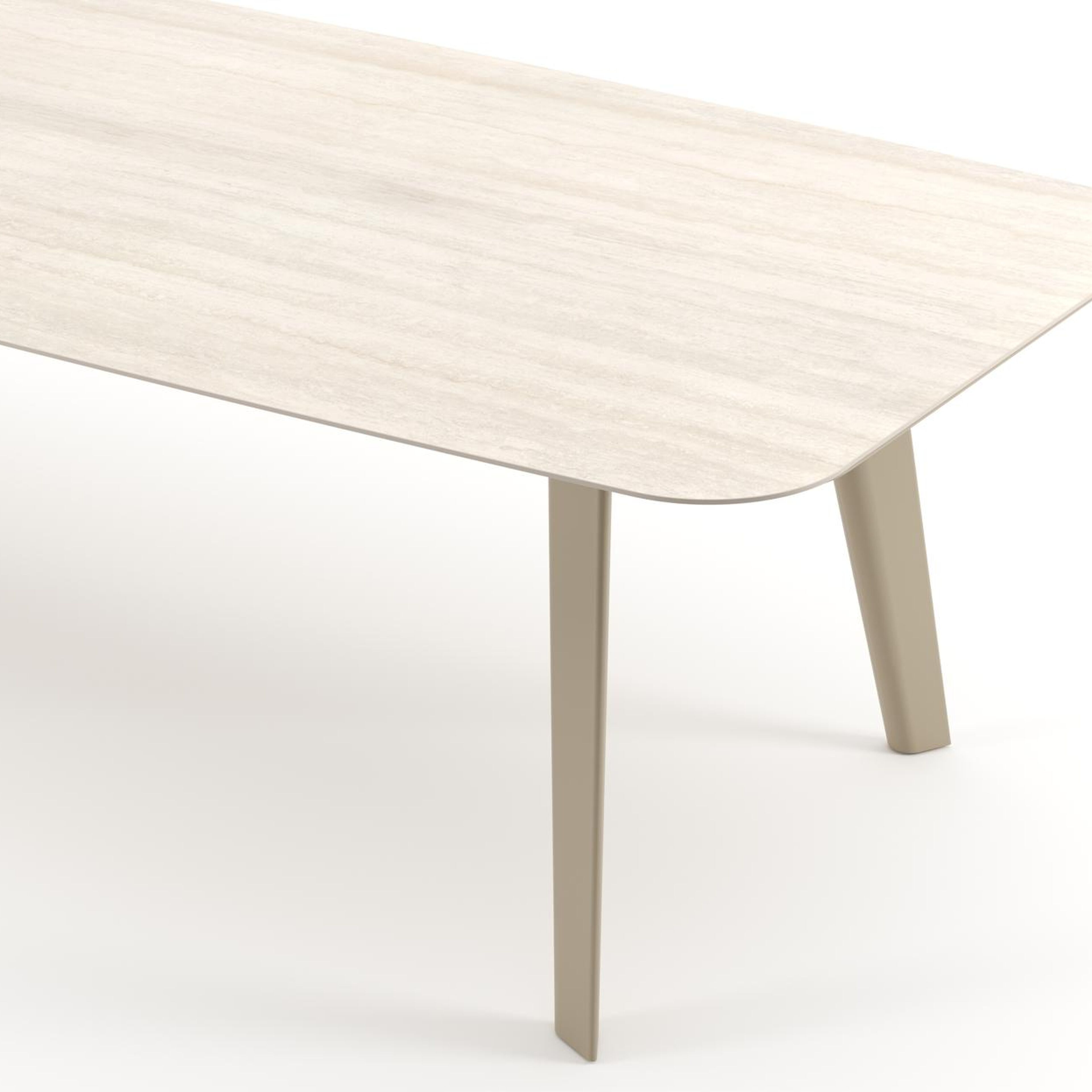 Table de jardin Lacrima forme de bateau en aluminium beige et céramique pleine Travertino Bianco - Lg. 315 x Lrg. 115 x Haut. 73 cm | Exterioo mobilier de jardin