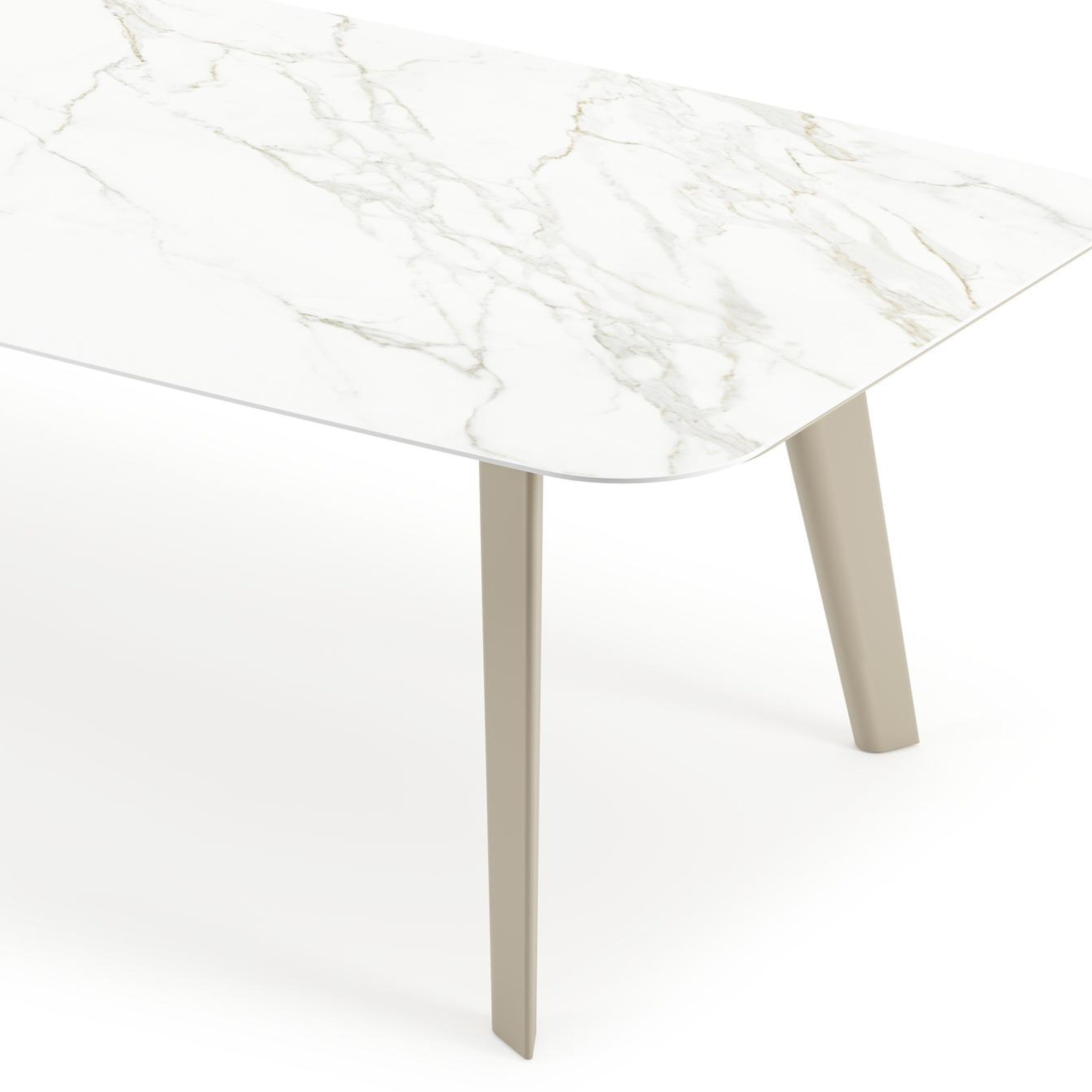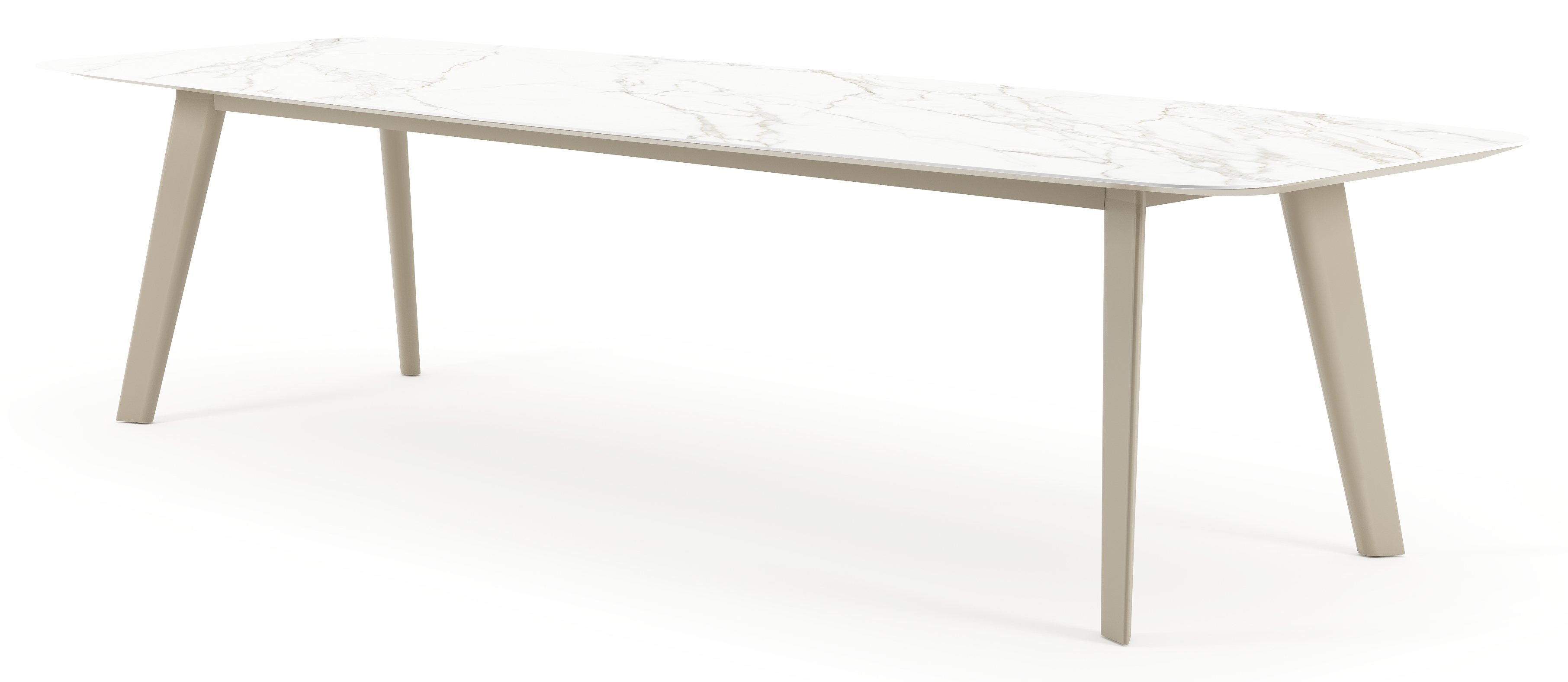 Table de jardin Lacrima forme de bateau en aluminium beige et céramique pleine Calacatta - Lg. 315 x Lrg. 115 x Haut. 73 cm | Exterioo mobilier de jardin