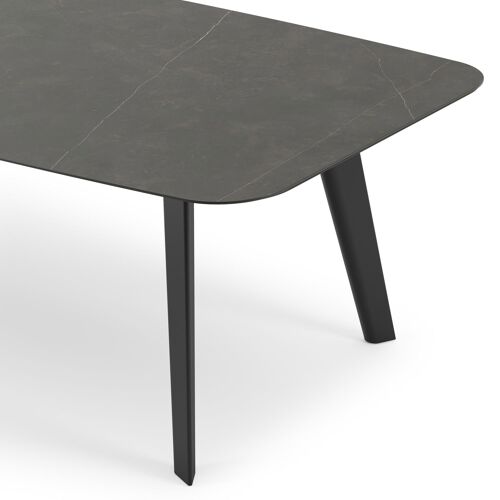 La table de jardin Lacrima a un look contemporain où l'on reconnaît facilement la table à ses pieds biseautés.