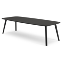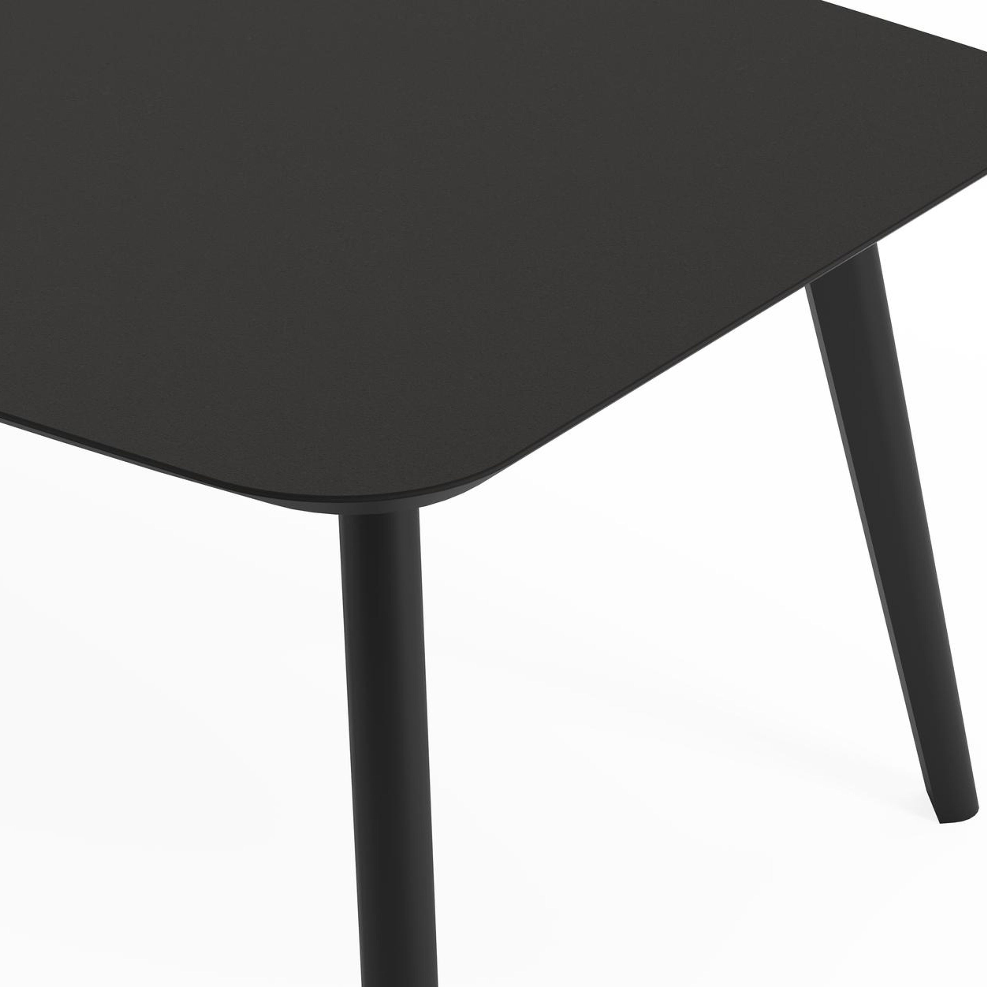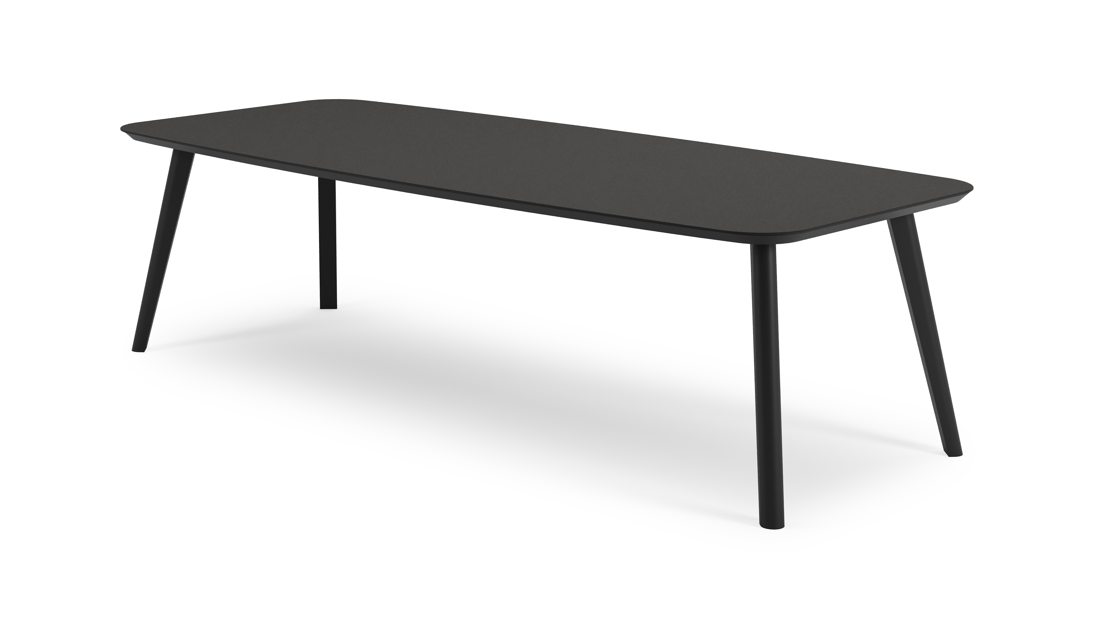 La table de jardin Mosa est facilement reconnaissable à son plateau rectangulaire arrondi et à ses pieds biseautés vers l'extérieur. La table a un aspect moderne avec une touche d'élégance.